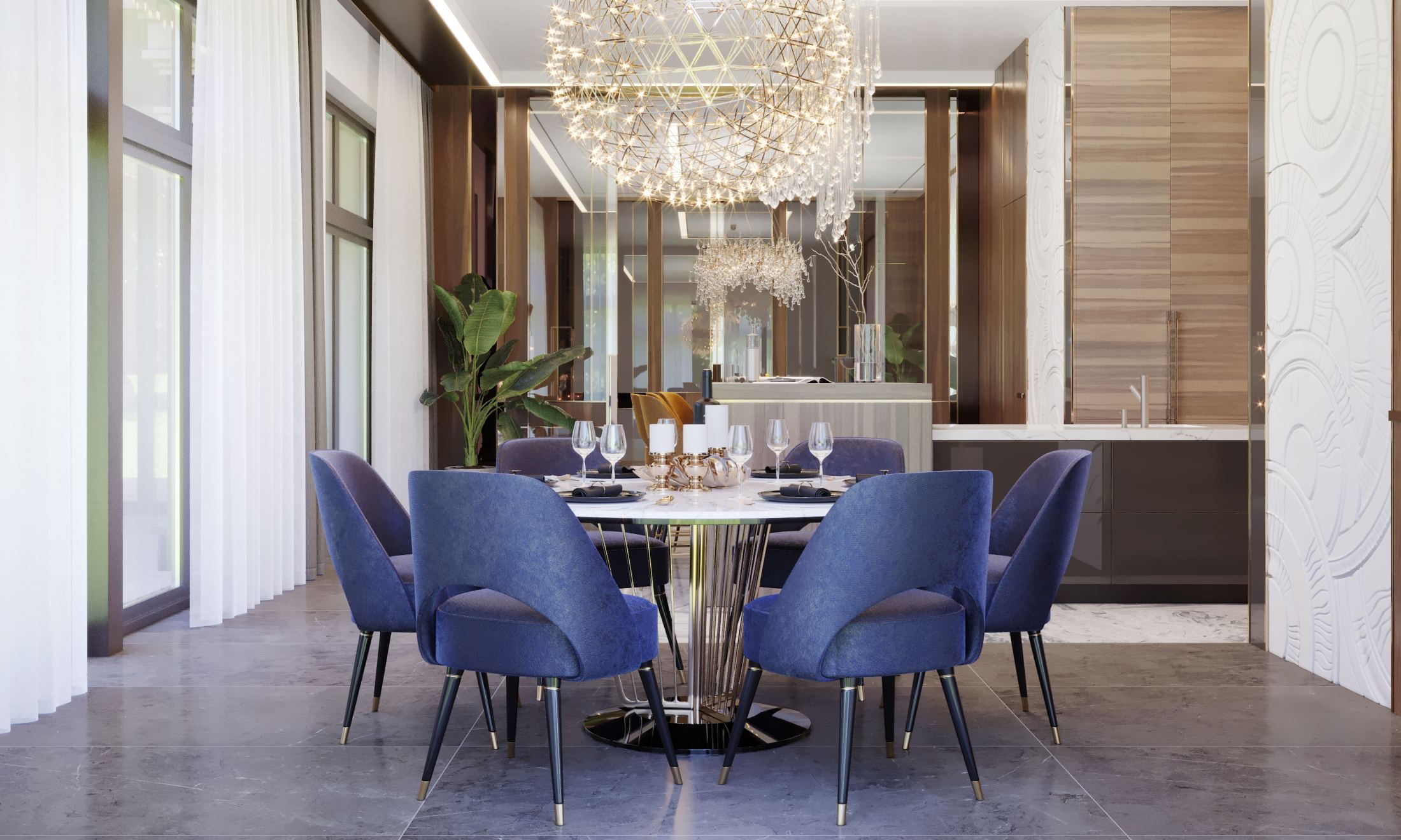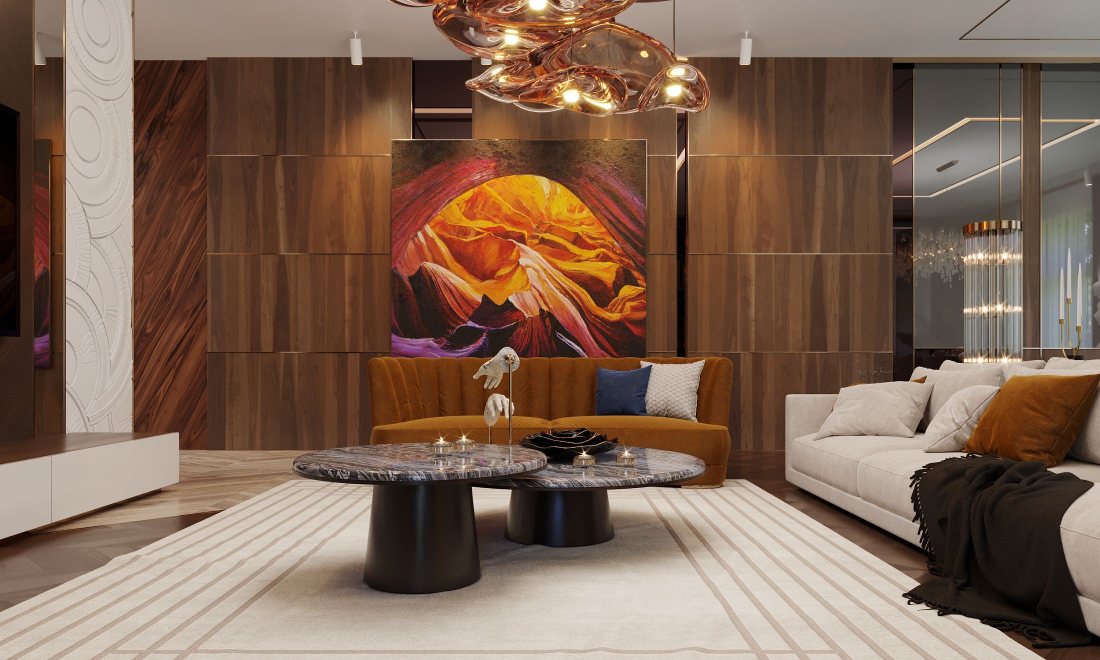 Округлые очертания диванов и кресел дополняет обивка с бархатистой фактурой и насыщенными цветами – горчичным, глубоким синим, изумрудным. Это безошибочно работает на создание уютной обстановки, где цветовая гамма яркая, но в то же время умиротворяющая.