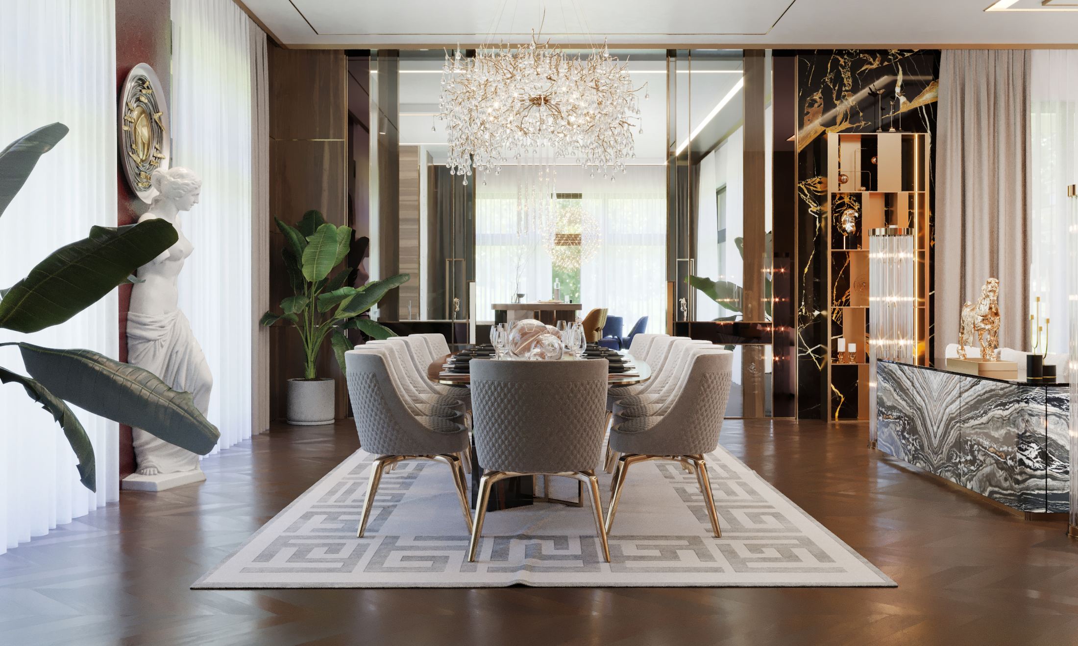 Декоративное решение современного интерьера коттеджа сочетает прямые линии и прямоугольные формы в отделке, дизайне столов и шкафов с плавными силуэтами мягкой мебели.