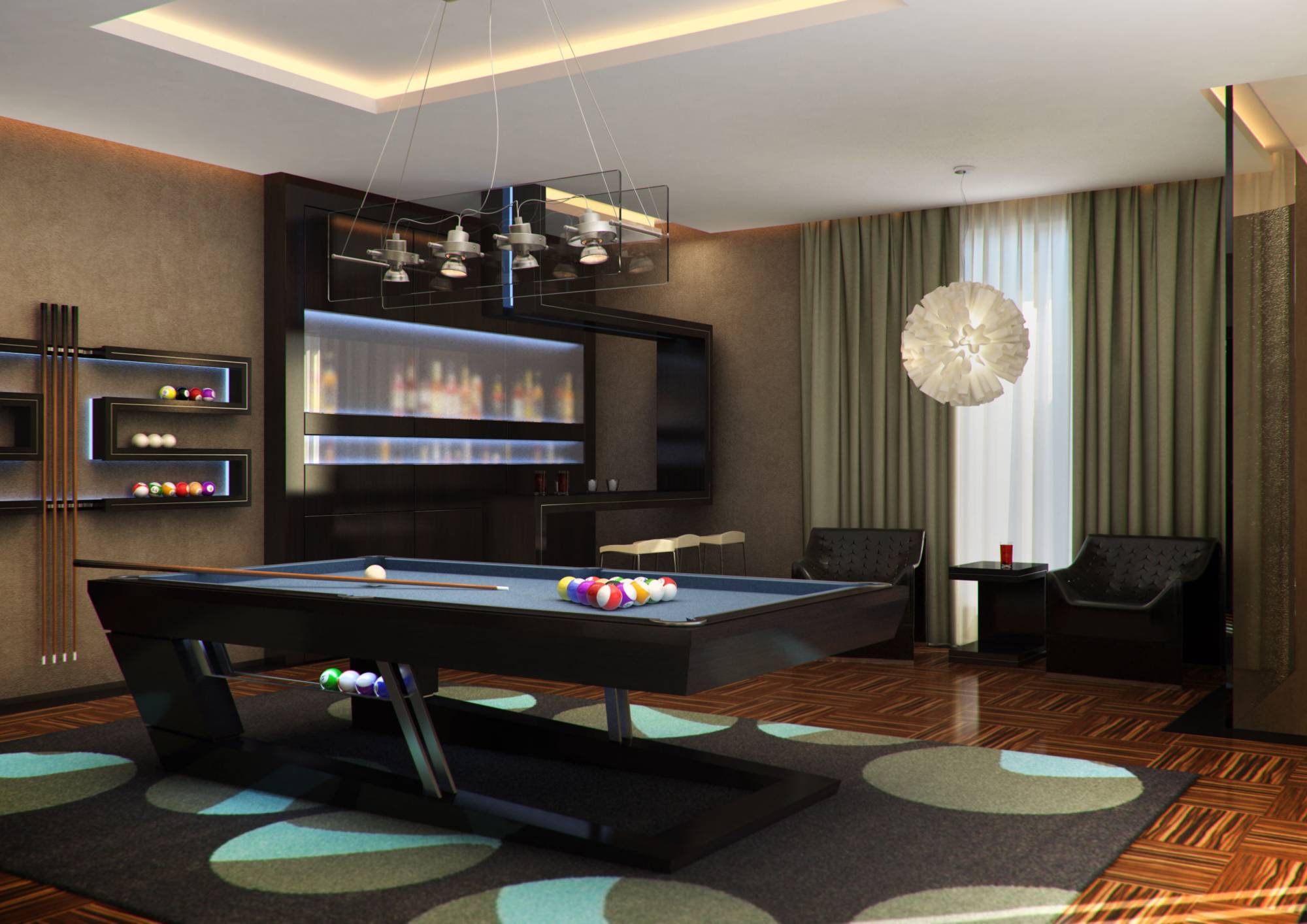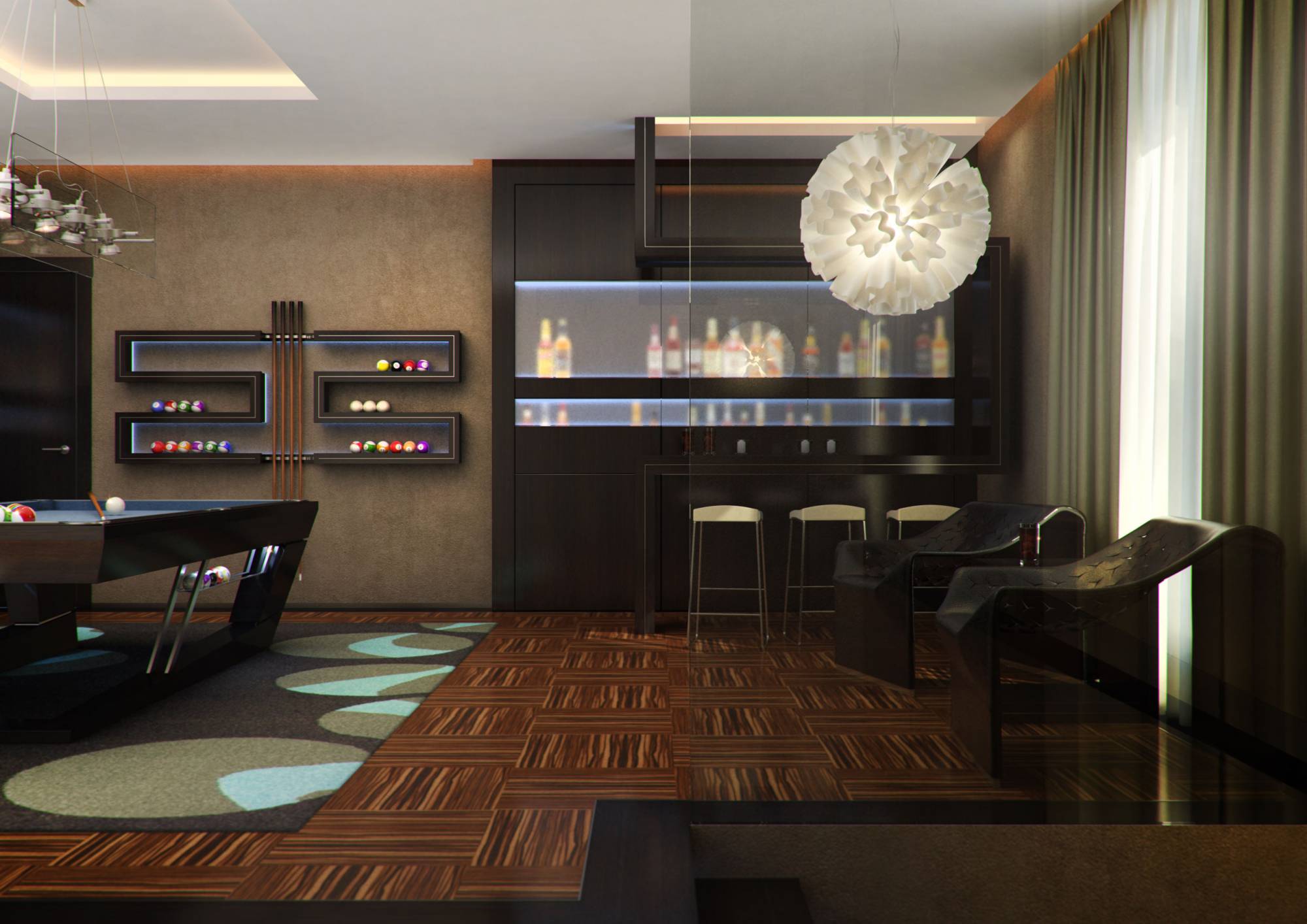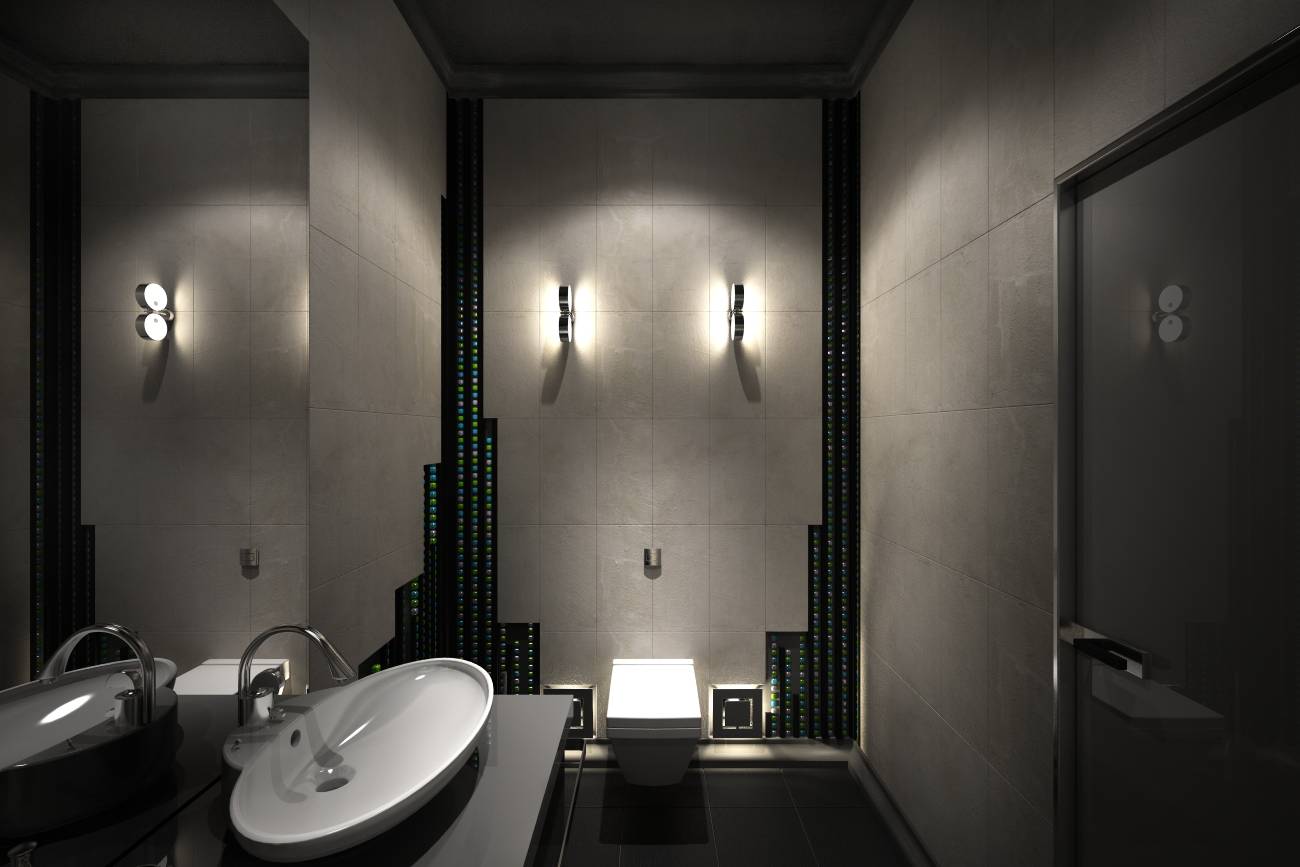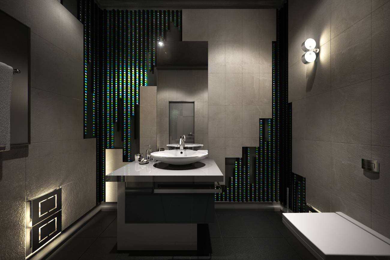 В интерьере бильярдной и бара предпочтение в акцентах отдано холодному голубому (в подсветке шкафов, полок, сукне бильярдного стола). В характерной для стиля серебристо-черной гамме выдержан дизайн ванной комнаты.