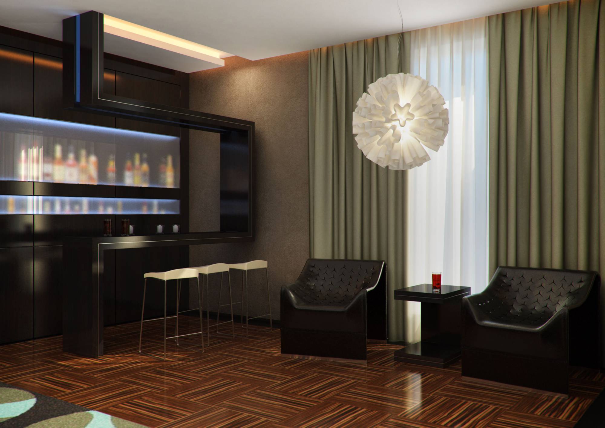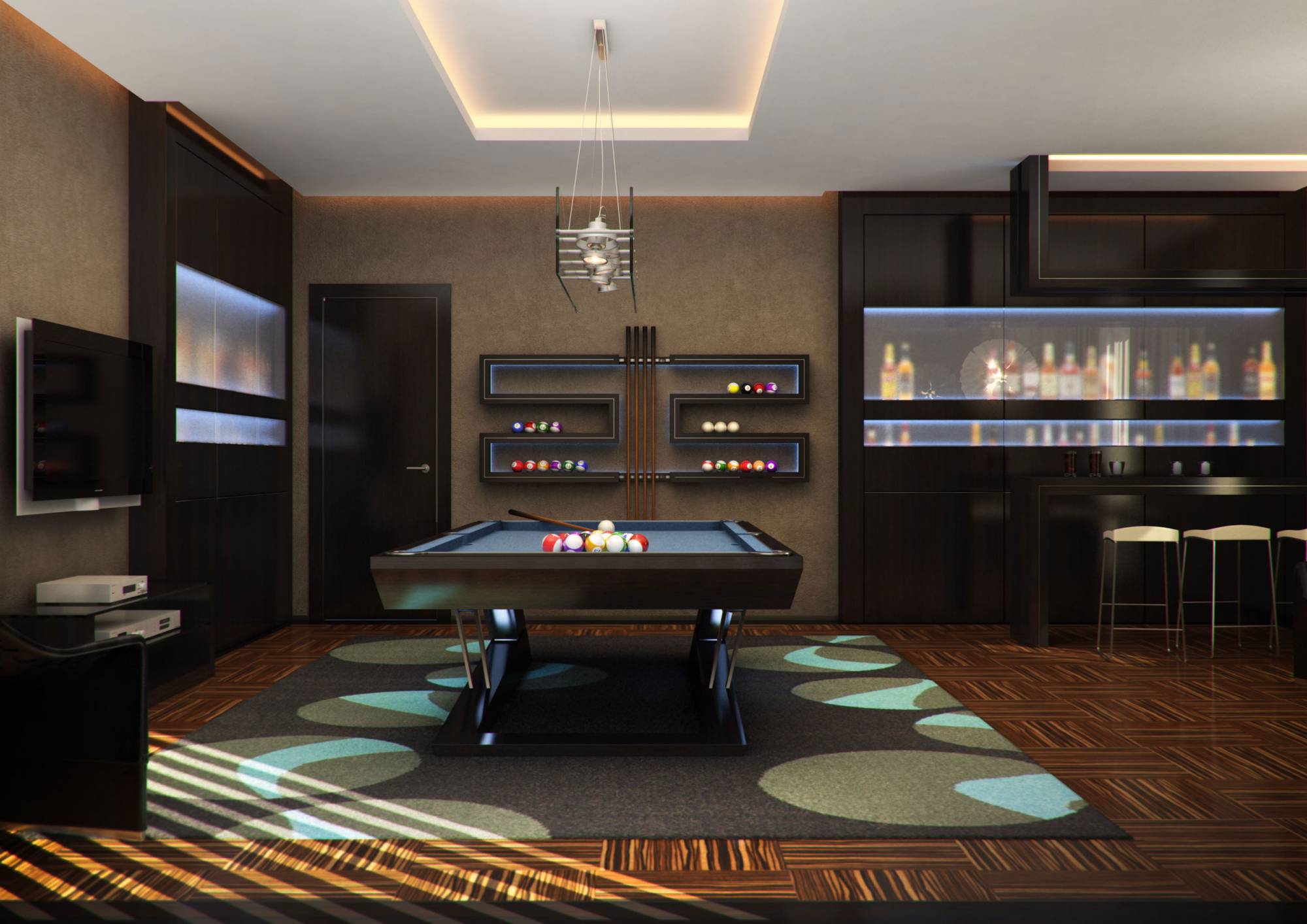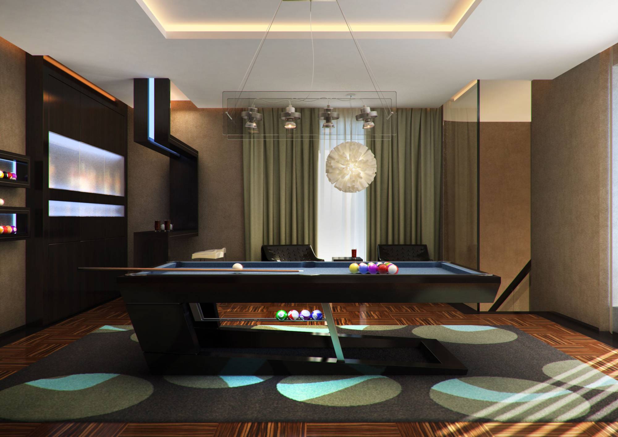 В интерьере бильярдной и бара предпочтение в акцентах отдано холодному голубому (в подсветке шкафов, полок, сукне бильярдного стола). В характерной для стиля серебристо-черной гамме выдержан дизайн ванной комнаты.