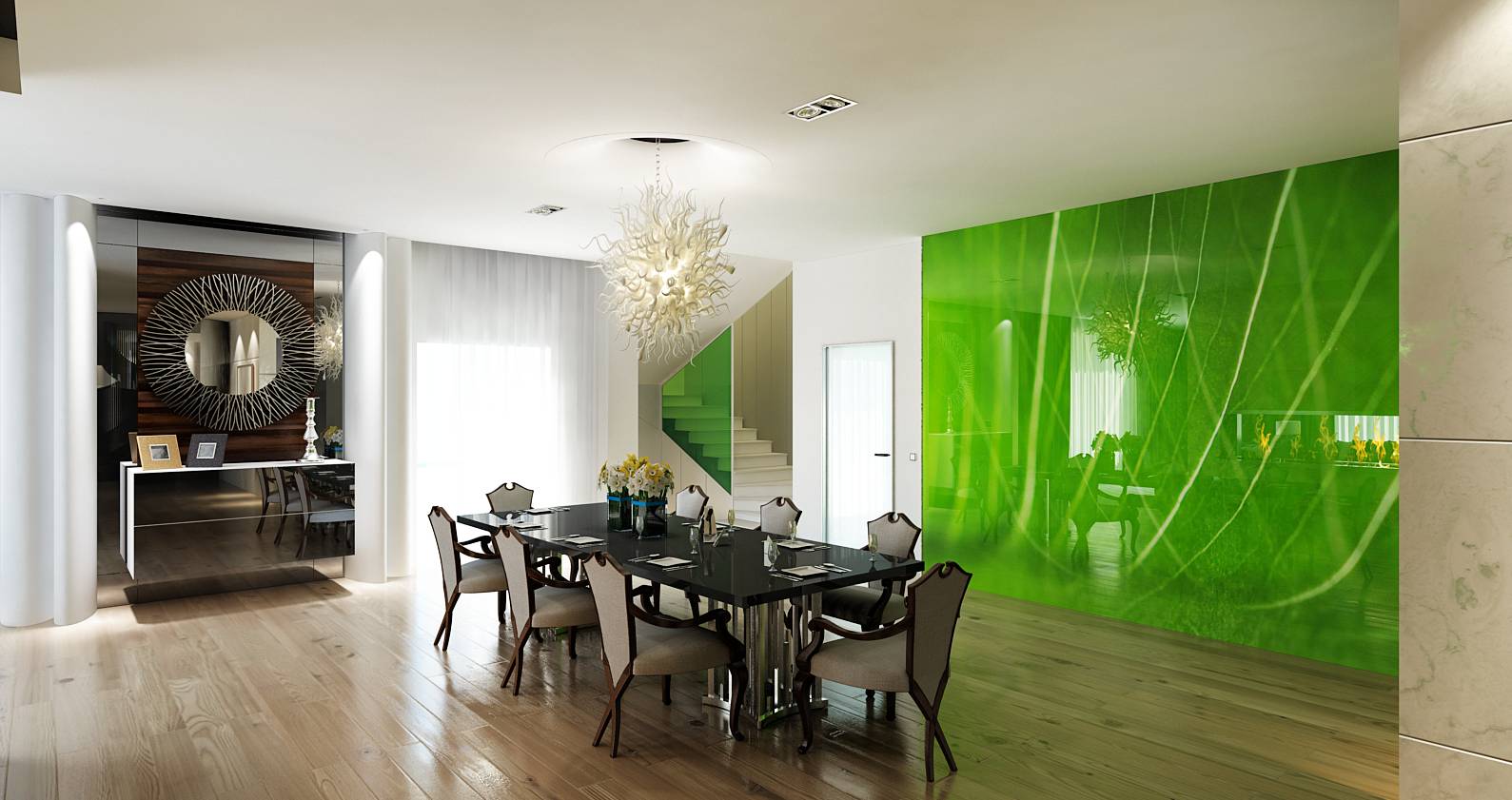 Благодаря этому решению, каждая из зон получает собственное, вполне самостоятельное воплощение в плане дизайна и вместе с тем не выпадает из свободного объема, перетекающего от одной логической точки планировки к другой. Роль цветового акцента, помимо каминной перегородки, берет на себя стена в столовой, облицованная глянцевой панелью с оттенком свежей зелени.