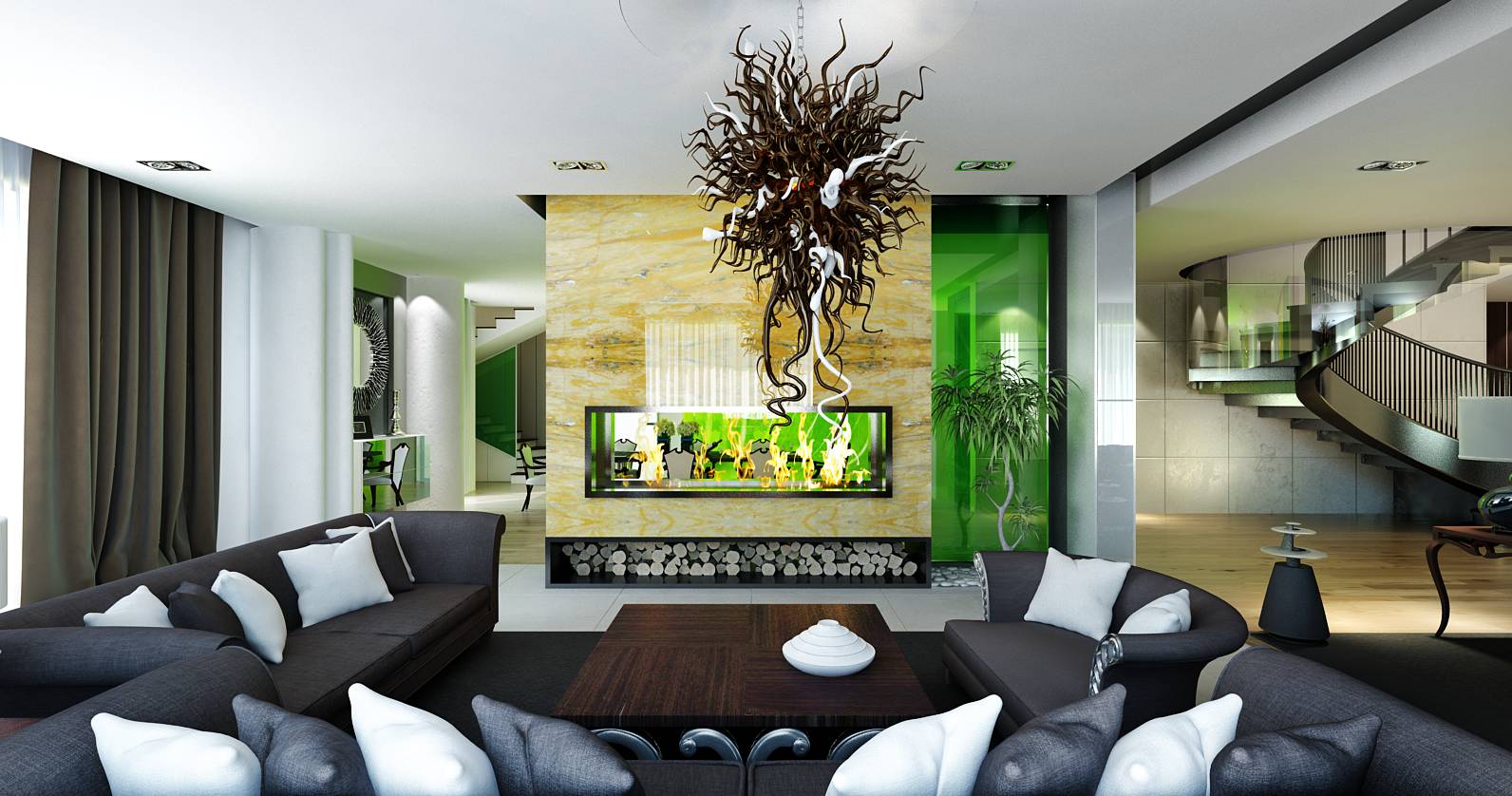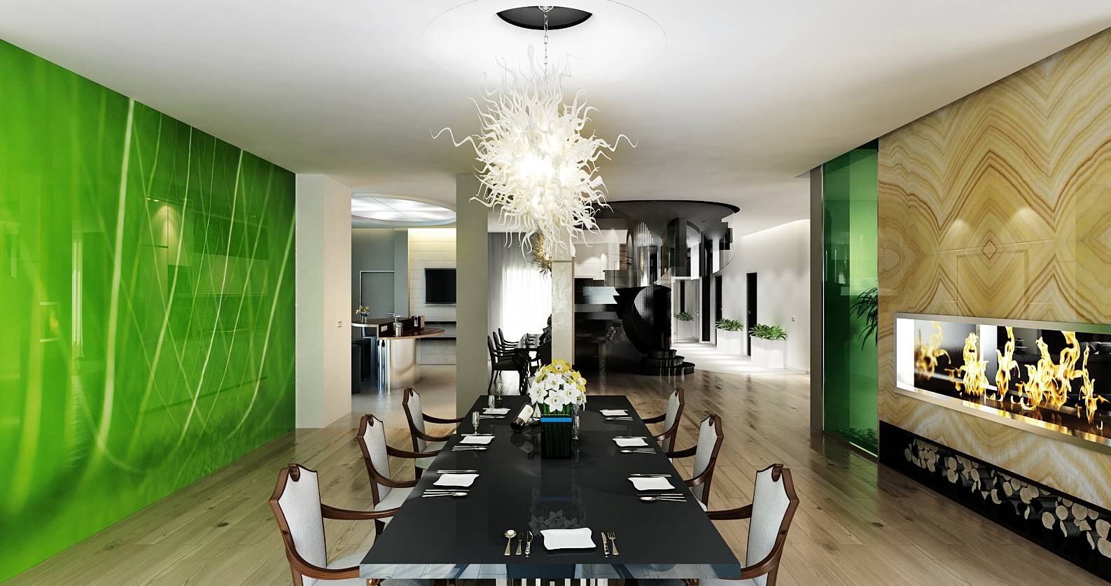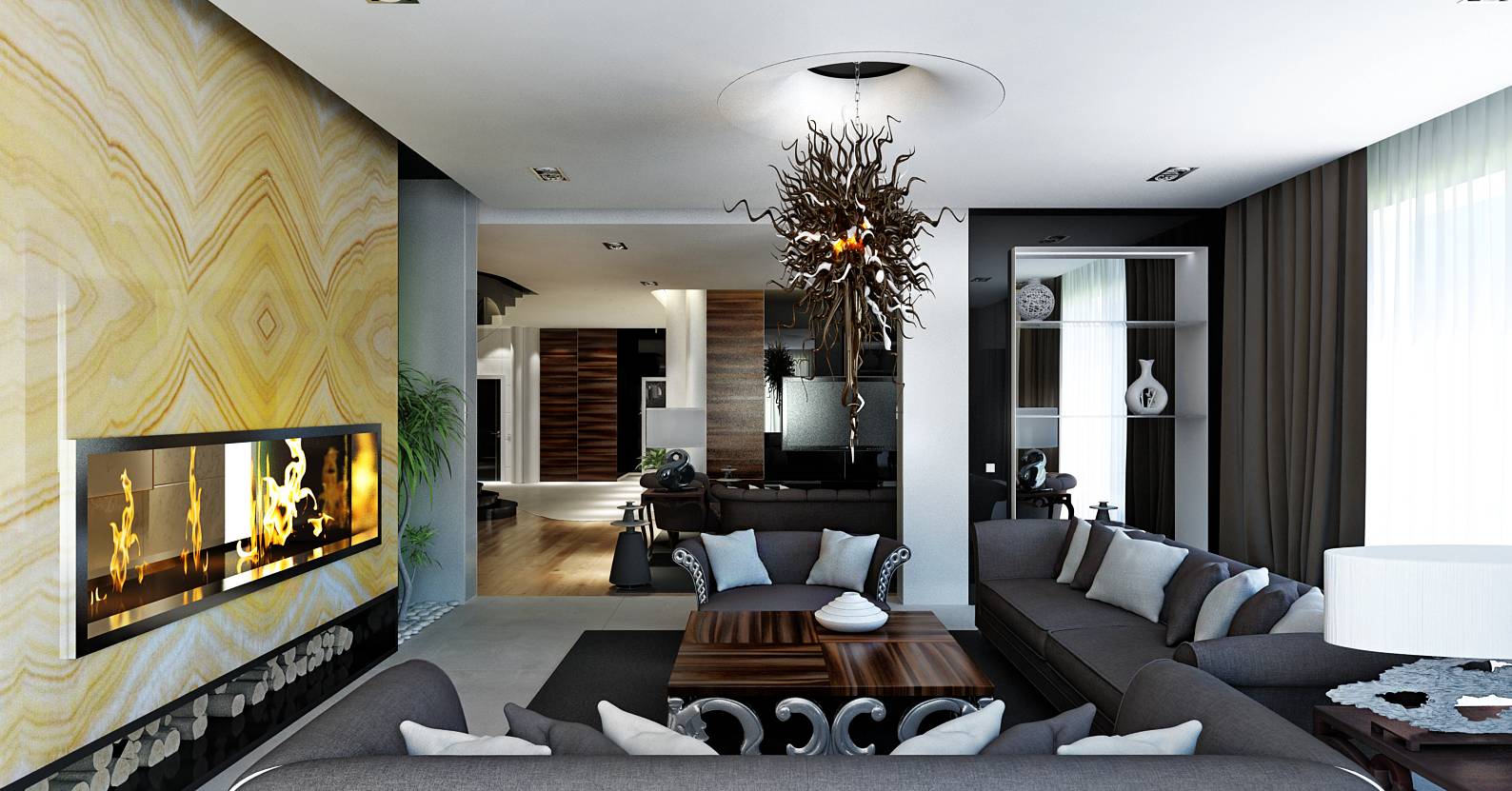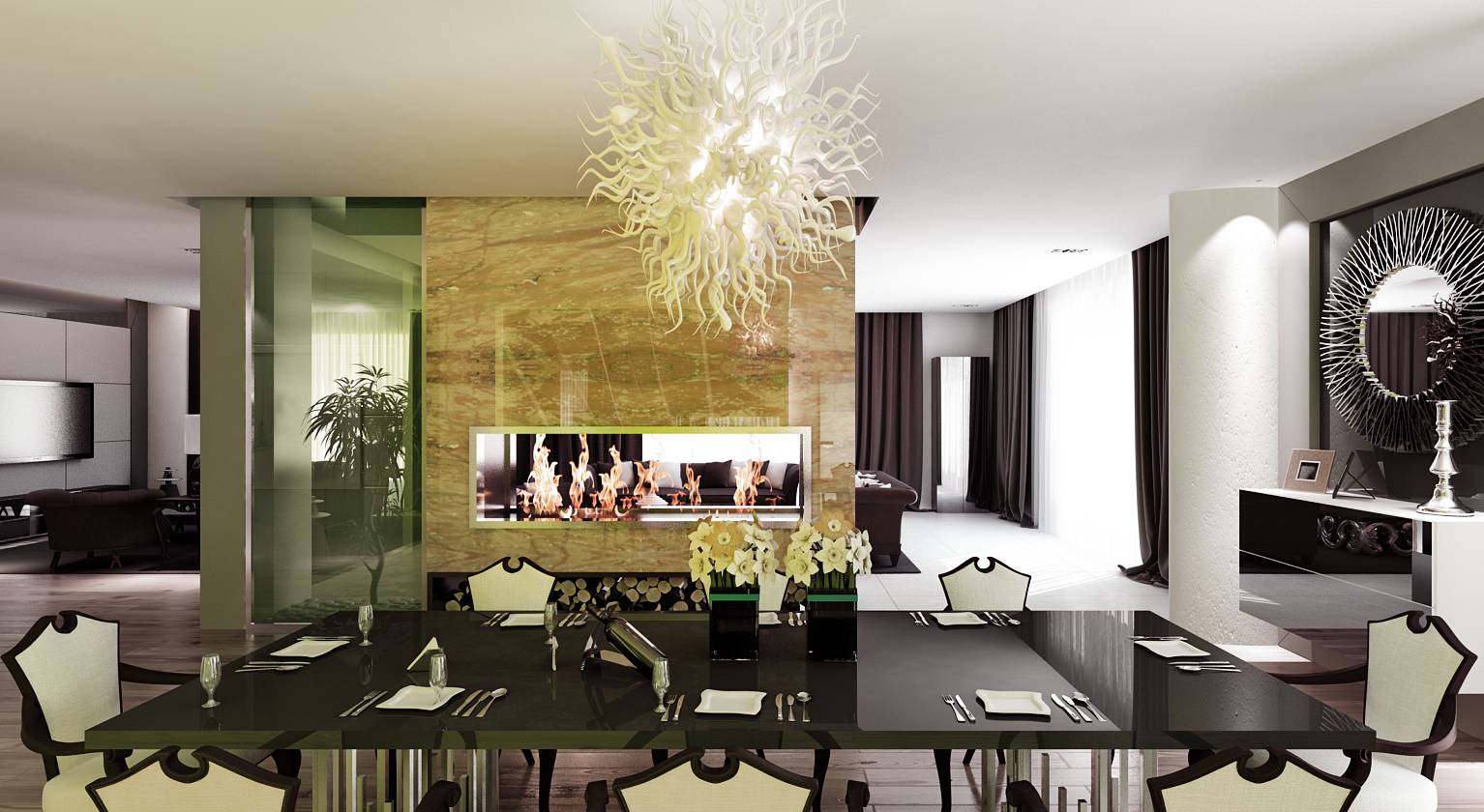 Перегородка с камином, отделанная солнечным ониксом, является центрообразующим элементом в организации общественного пространства современного дизайна частного дома. Вокруг нее располагаются столовая, гостиная, непосредственно каминная зона.