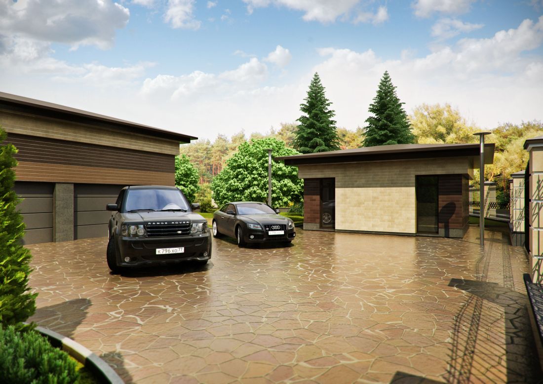Современный дизайн фасада частного дома сочетает два контрастных цвета, но при этом в одной палитре – кремовой и коричневой. Дом, гараж, строения на территории – всё выполенно в едином современном стиле.