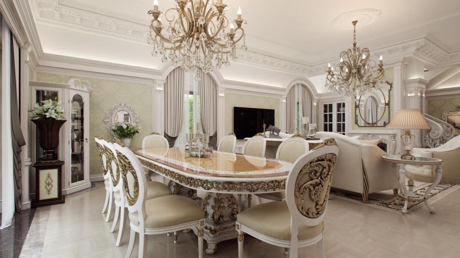 В зависимости от стилизации оформление потолка может быть выполнено с лепниной, росписью, резьбой, витражами, кессонами. В элитных интерьерах допускаются подвесные и натяжные конструкции. Белый цвет смотрится парадно и заодно увеличивает пространство.