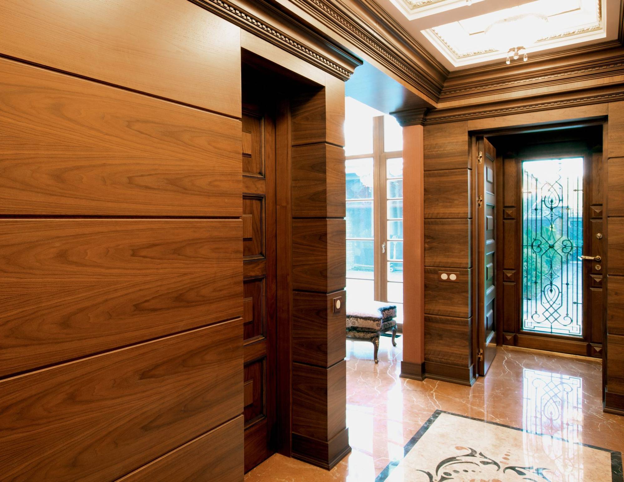 - Сложные, украшенные резьбой многослойные карнизы визуально продолжают стенную обшивку и создают обрамление для белоснежных потолков.