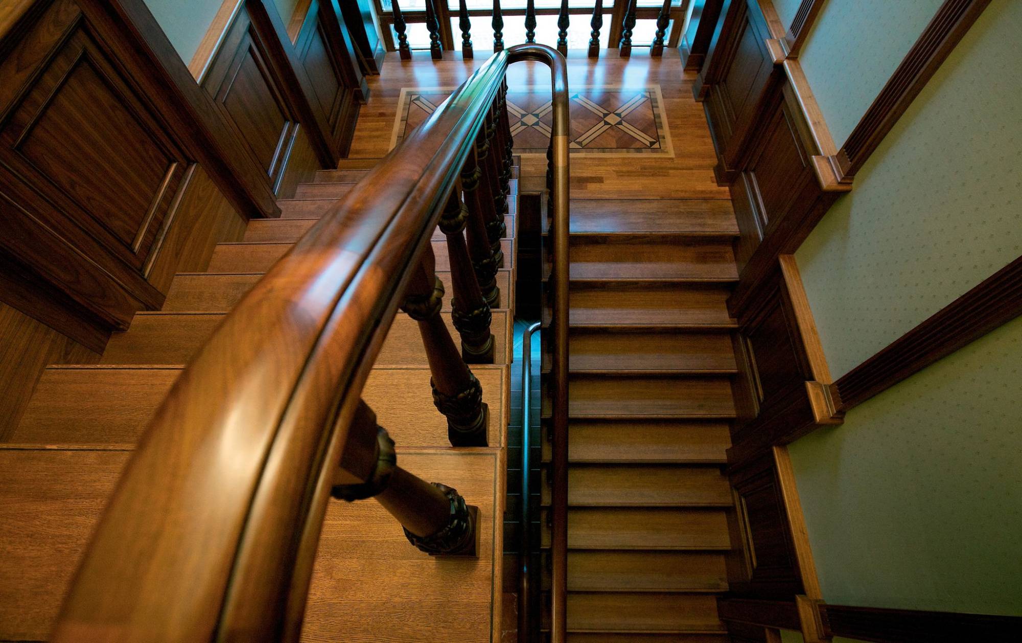 - Комбинирование дерева и обоев – каноническое для стиля, за счет подобранного оттенка можно регулировать «температуру» строгого интерьера. Так в прихожей стены оклеены обоями теплого кораллового цвета, который гармонично сочетается с сиреневой диванной группой; зону лестницы осветляют обои прохладного светло-оливкового тона.