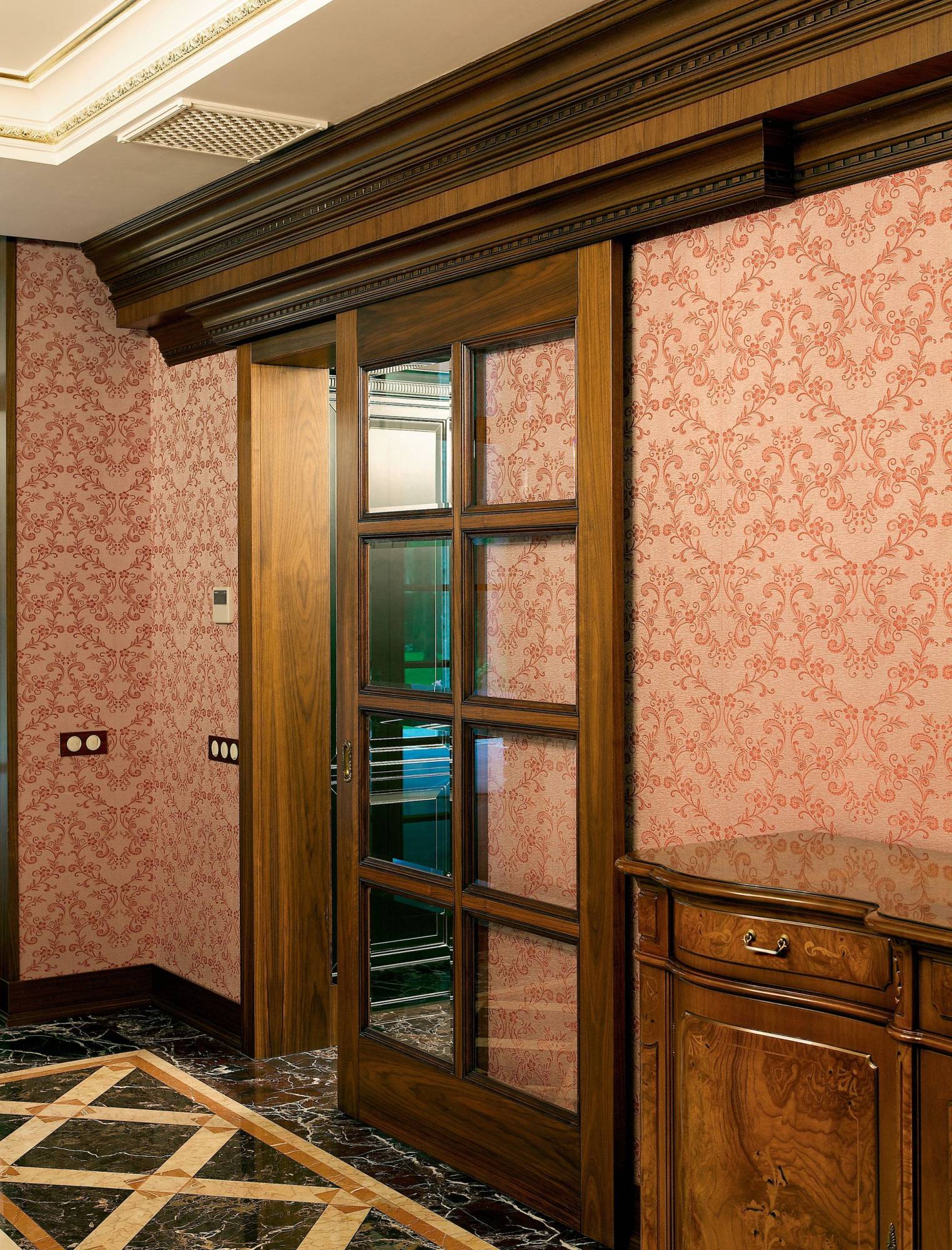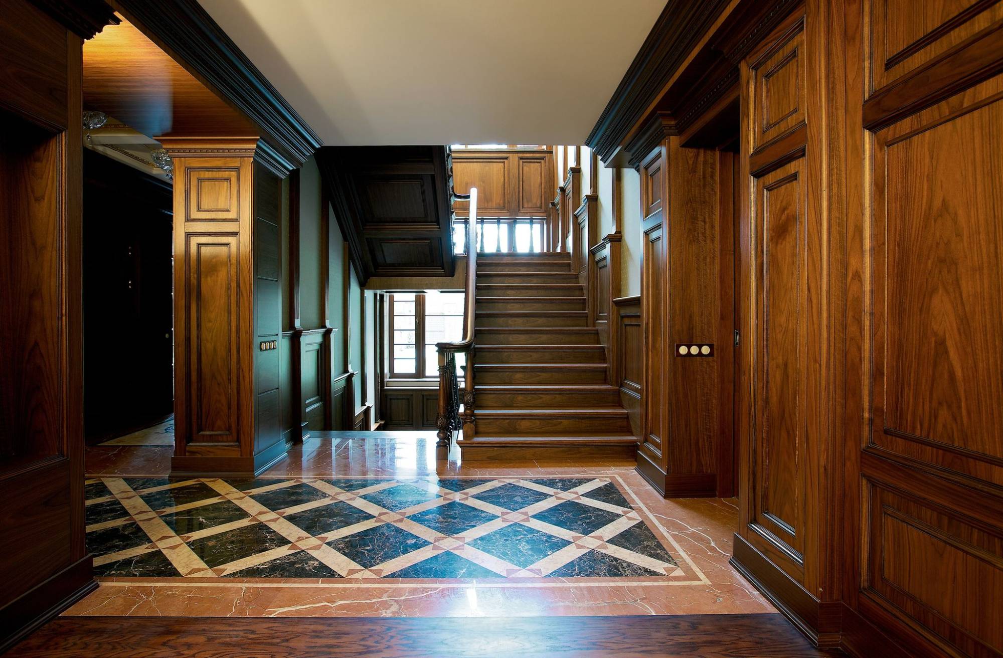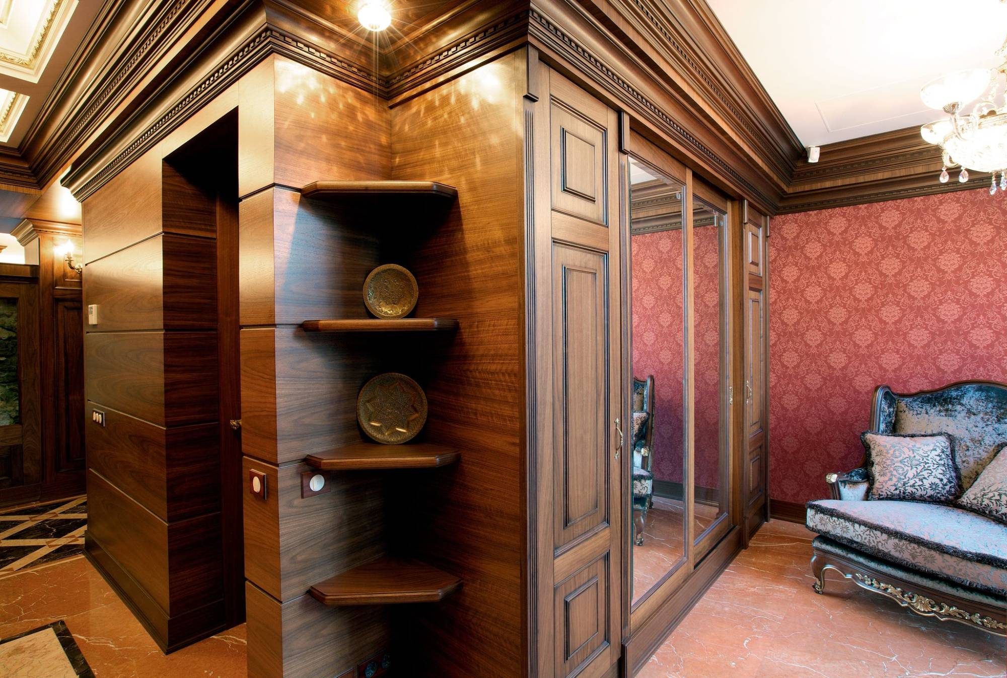 - Великолепные буазери с филенками насыщают стены классическим рельефом. Темную каштановую гамму поддерживает мебель из массива дуба, в частности шкаф с зеркалами в прихожей.