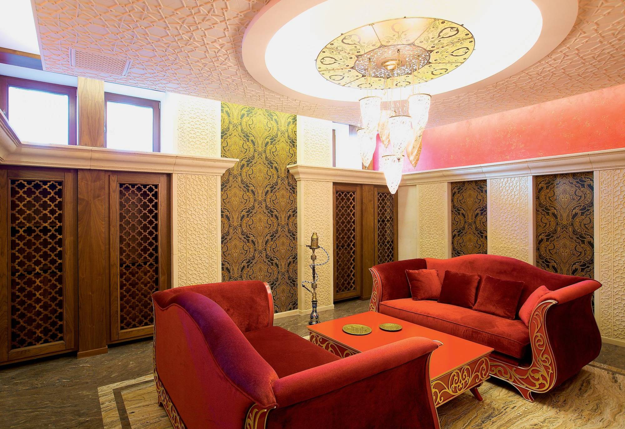 В зависимости от стилизации оформление потолка может быть выполнено с лепниной, росписью, резьбой, витражами, кессонами. В элитных интерьерах допускаются подвесные и натяжные конструкции. Белый цвет смотрится парадно и заодно увеличивает пространство.