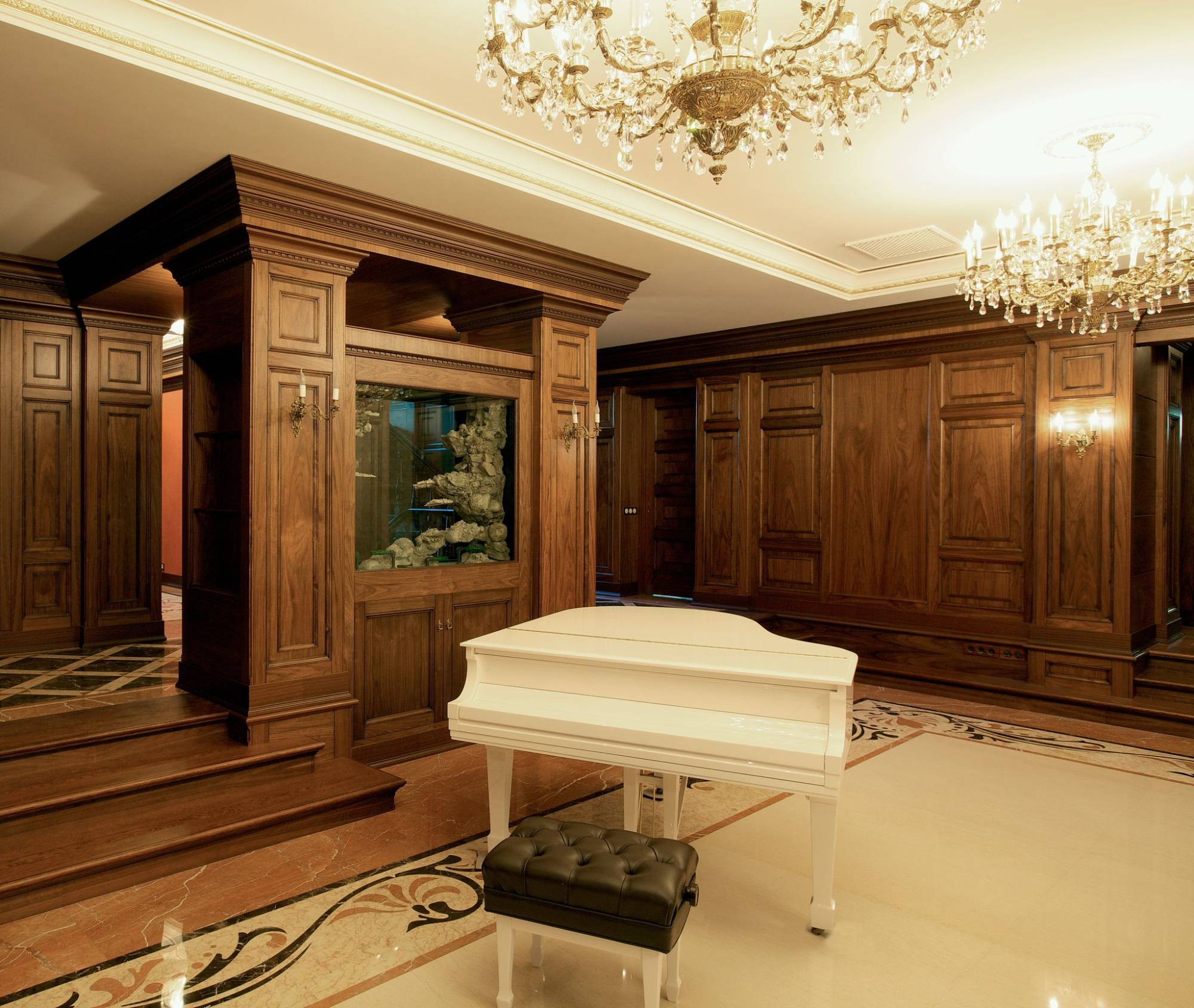 Для загородного особняка авторы «ТопДом» разработали представительный интерьер в классическом направлении. Ведущими финишными покрытиями стали дерево насыщенных коричневых оттенков и мрамор терракотовых, бежевых и темно-серых тонов. Организация парадной части включает прихожую с зоной отдыха и панорамным остеклением, холл с проходом к межэтажной лестнице, в столовую и гостиную. Комната для приема гостей расположена чуть ниже основного уровня, что позволило спроектировать на границе с коридором красивую перегородку с декоративным панно и боковые ступени. В цокольном этаже разместились домашний кинотеатр и кальянная комната.