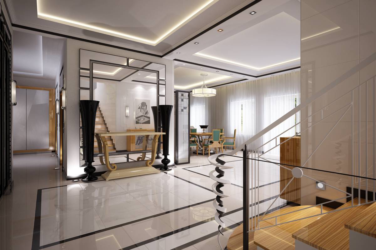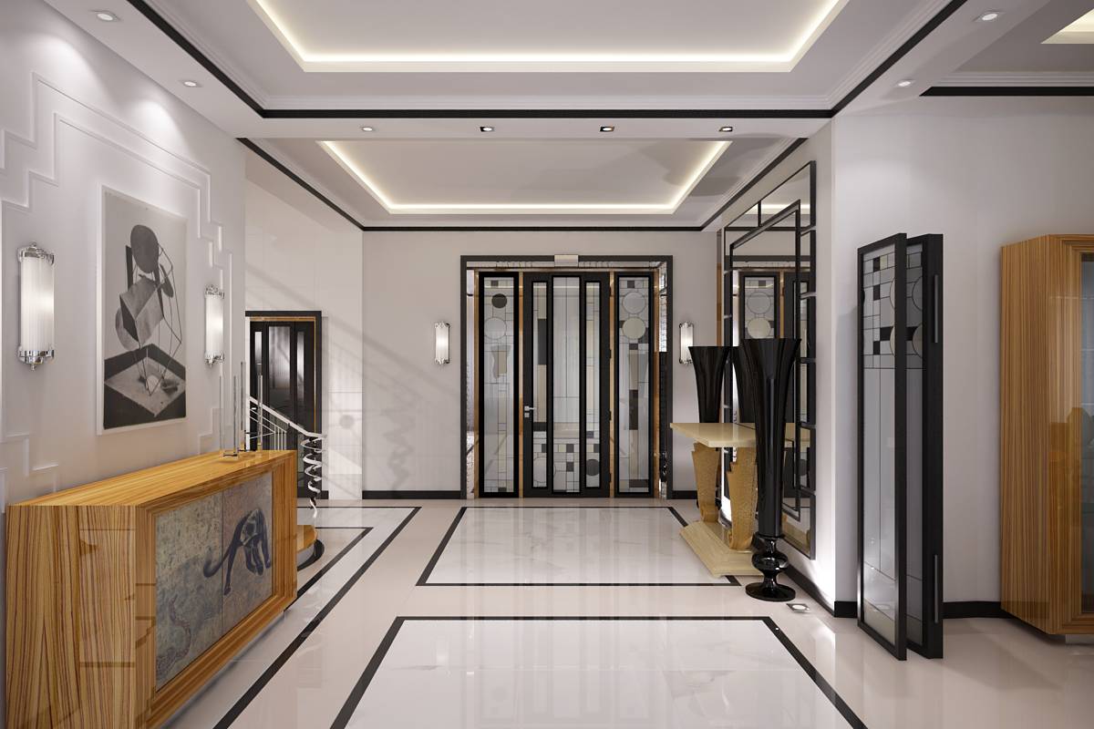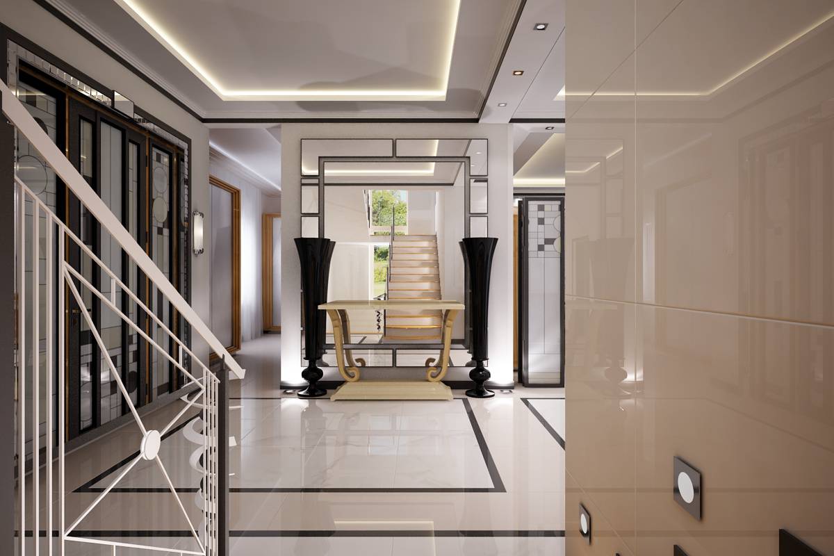 В основе дизайна интерьера дома – подчеркнутое обращение к геометрическим формам. В декоре напольного покрытия, объемных потолков, оформлении дверных проемов во всех комнатах легко читаются прямые углы, обозначенные контрастными кантами.