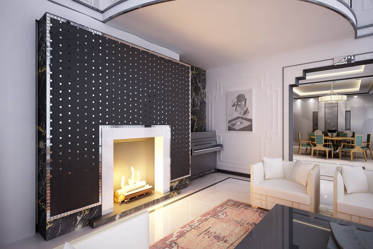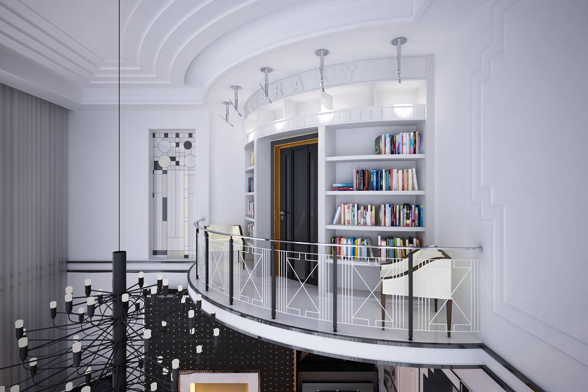 Интересным планировочным решением в двусветной гостиной станет вынесение сюда балкона библиотеки, расположенной на втором этаже. Балкон частично нависает над зоной камина, образуя внизу уютный уголок – как раз для фортепиано.