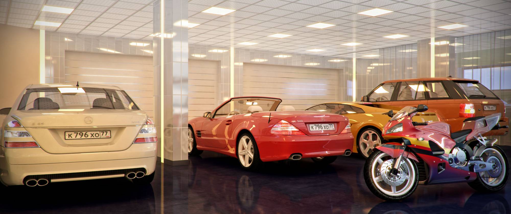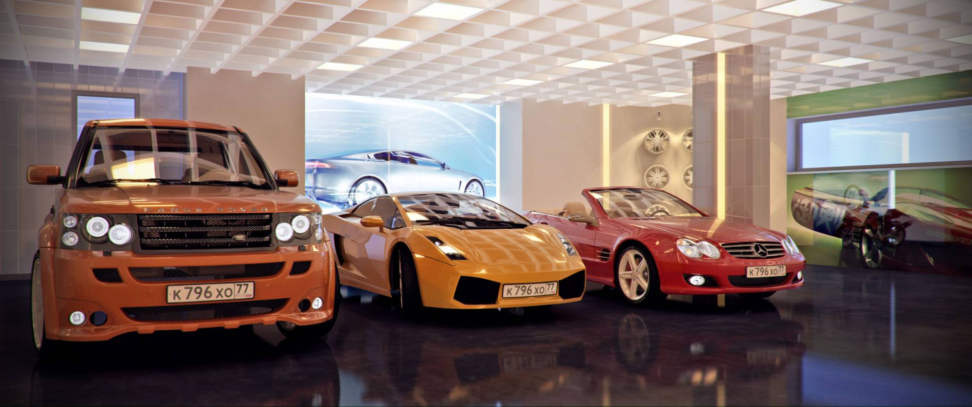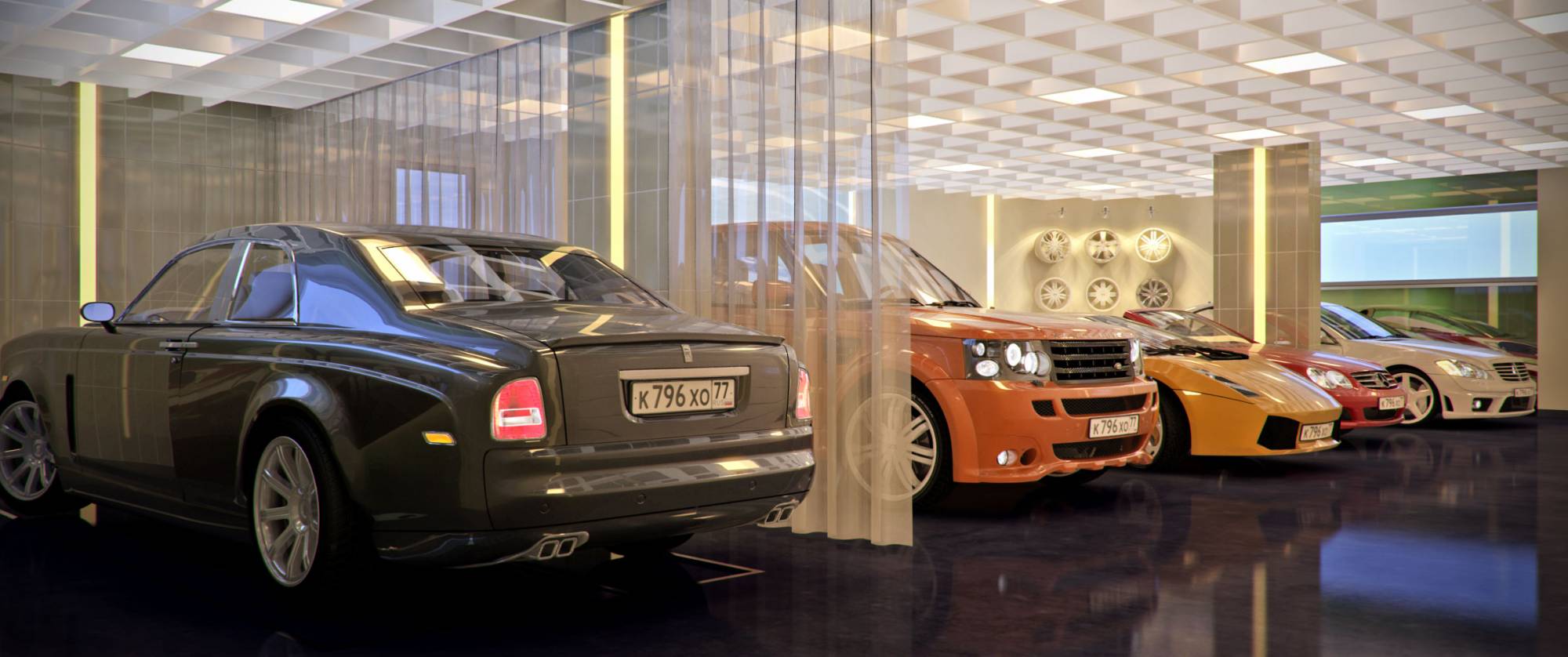 Одну из угловых зон в дизайне интерьера гаража занимает стенд с автомобильными дисками. Шесть точечных светильников (по три сверху и снизу) выгодно подчеркивают красоту хрома. Рядом с дисками в стене выполнена широкая ниша для хранения мотоцикла. Она также подсвечена и оформлена красивым постером на автомобильную тематику. В качестве мобильной перегородки между автомобилями в дизайне гаража предложено использовать полупрозрачную штору.