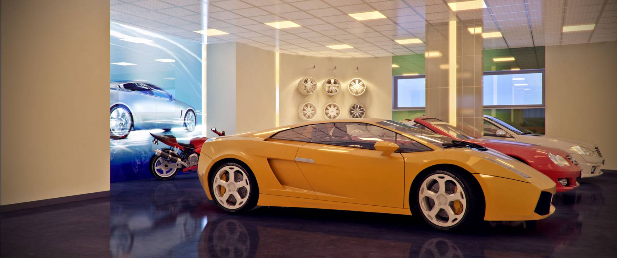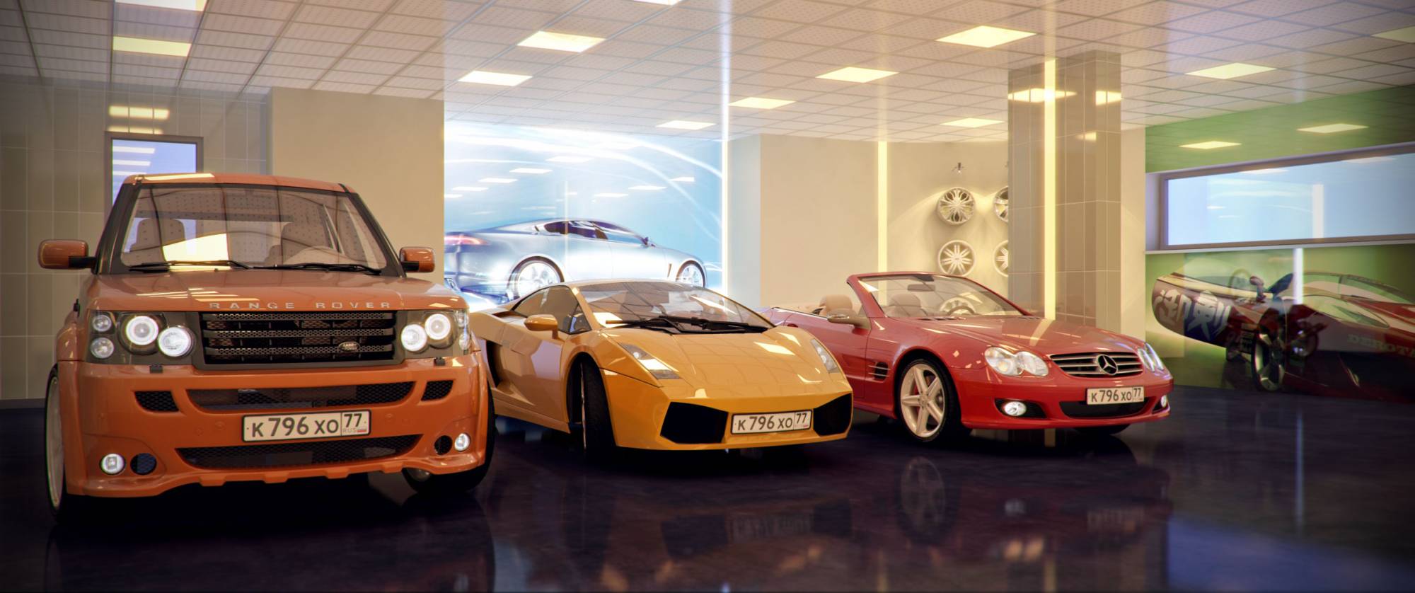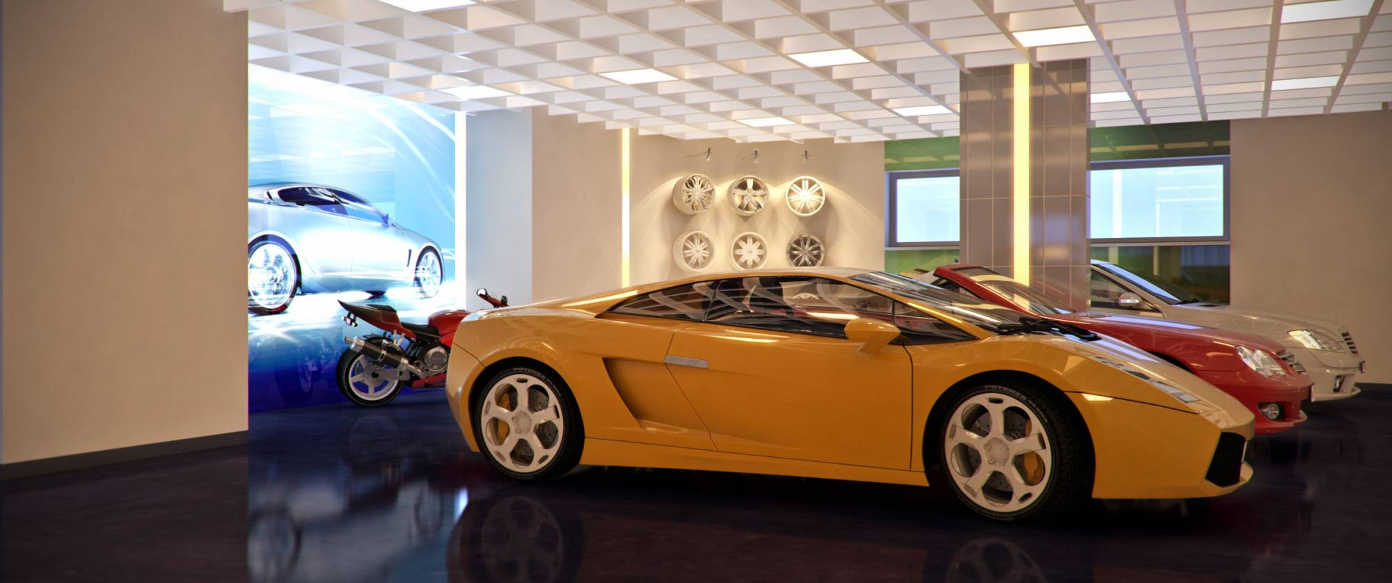 Одну из угловых зон в дизайне интерьера гаража занимает стенд с автомобильными дисками. Шесть точечных светильников (по три сверху и снизу) выгодно подчеркивают красоту хрома. Рядом с дисками в стене выполнена широкая ниша для хранения мотоцикла. Она также подсвечена и оформлена красивым постером на автомобильную тематику. В качестве мобильной перегородки между автомобилями в дизайне гаража предложено использовать полупрозрачную штору.