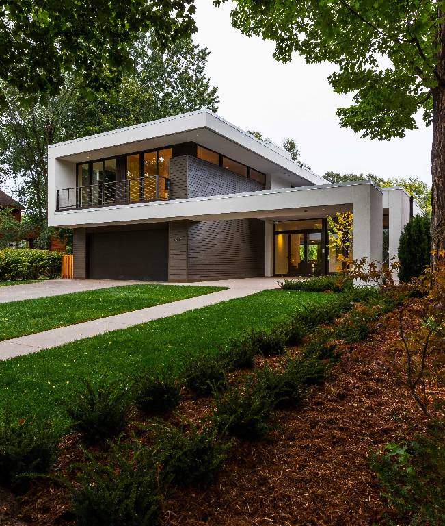 Благодаря архитектурным особенностям коттеджа (с характерным для скандинавского минимализма геометризмом), ведущим решением становится панорамное остекление обоих этажей. В экстерьере и интерьере дома преобладает эко стиль – отделка деревом, с сохранением природной цветовой палитры.