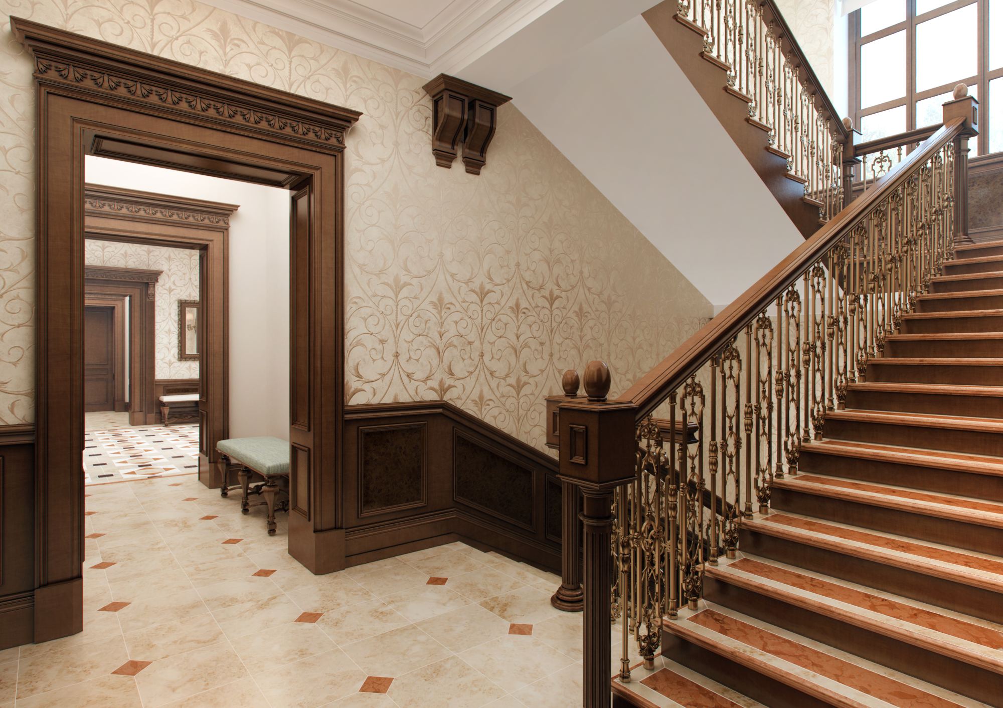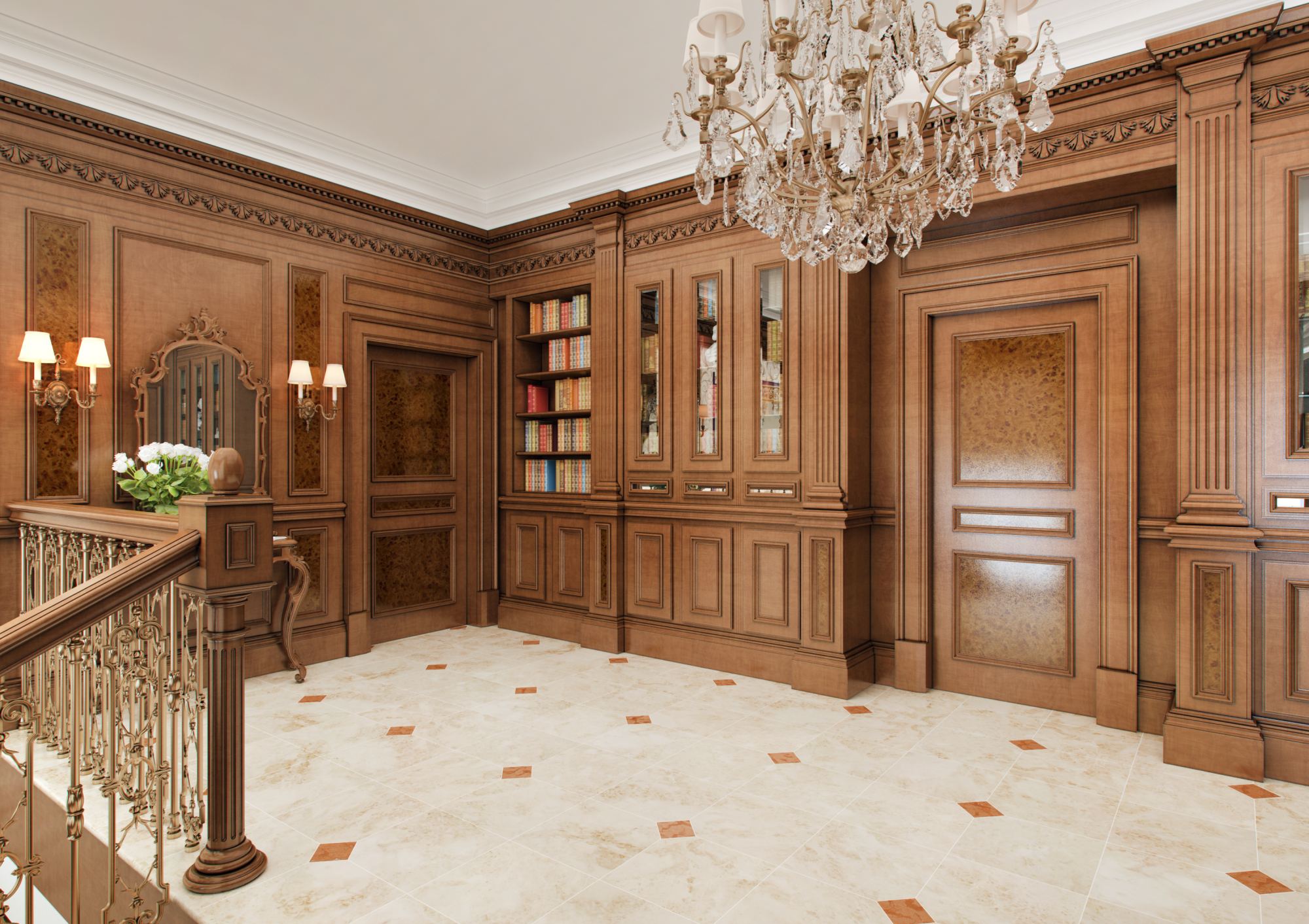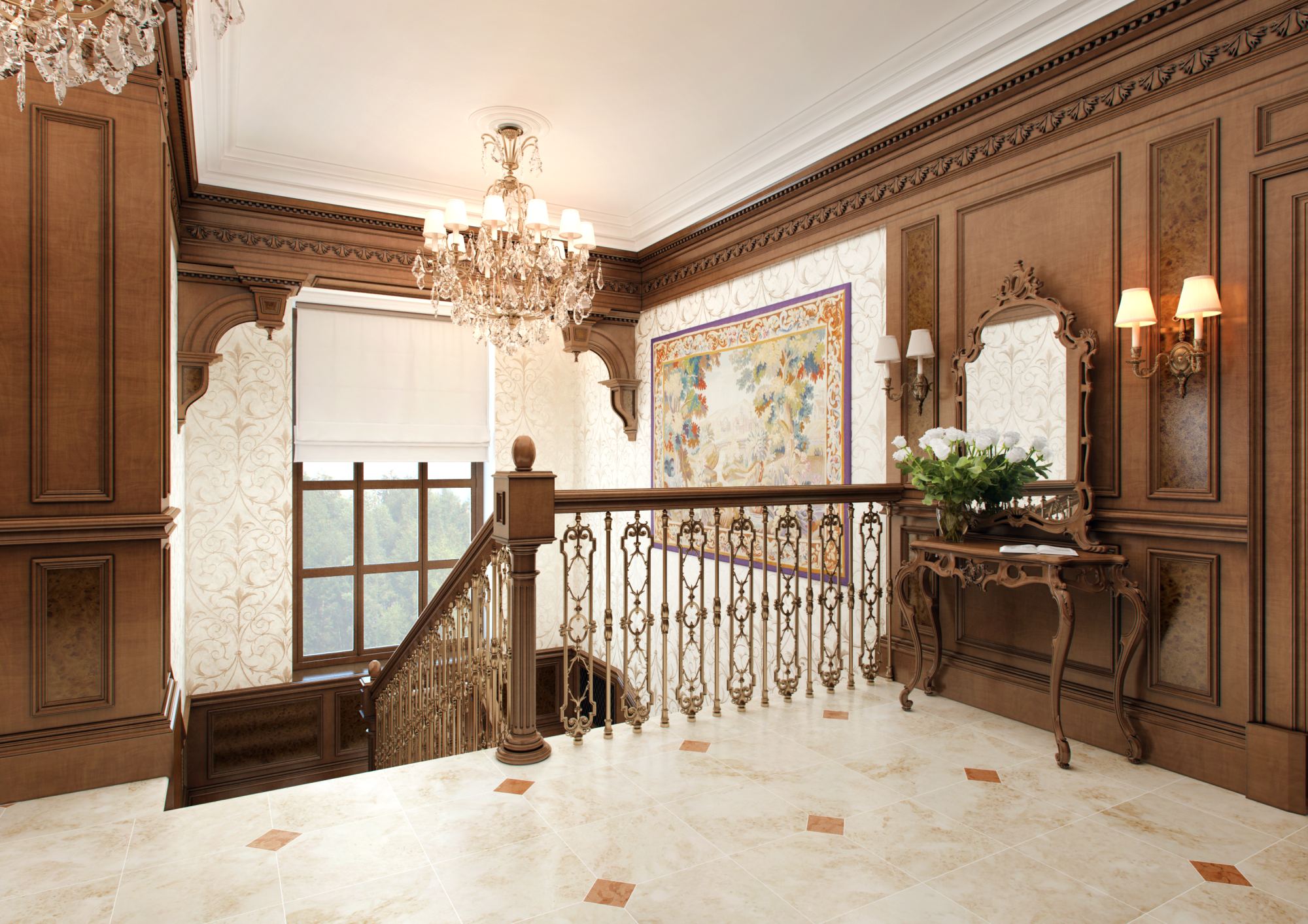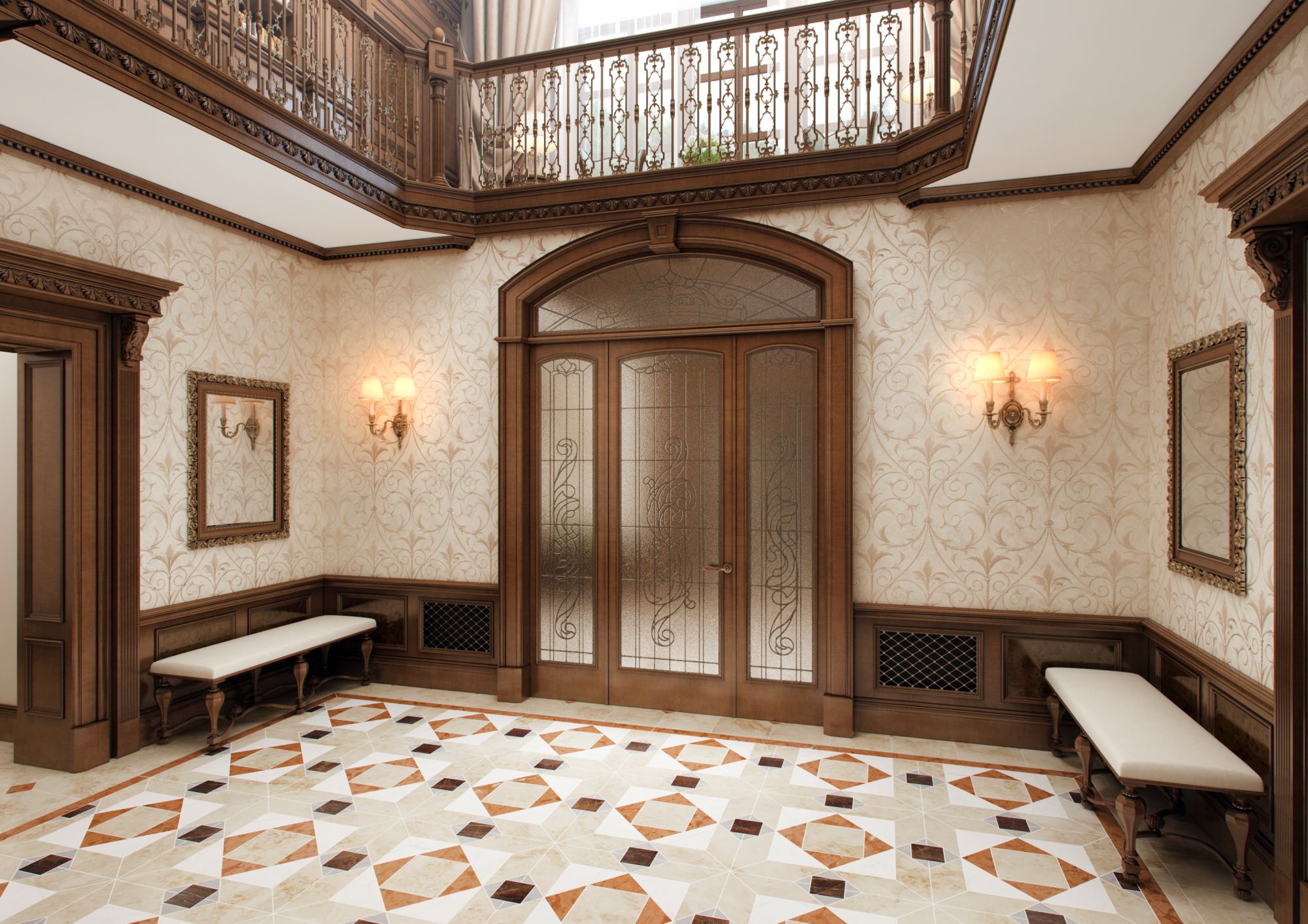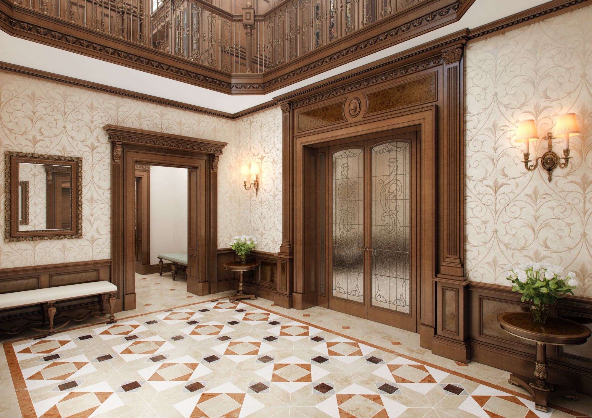 Мраморный пол миндального оттенка и резные стеновые панели в отделке холла
