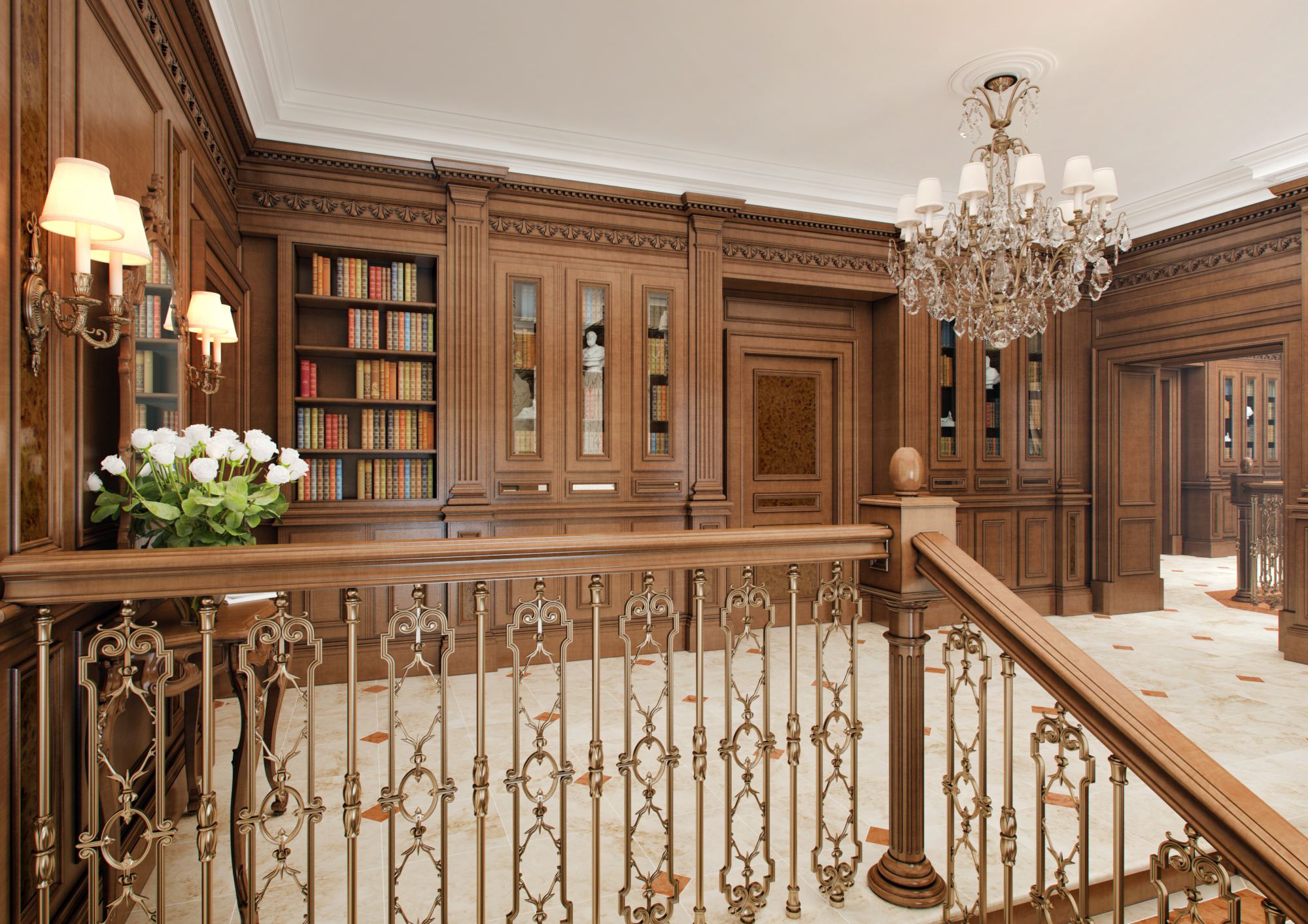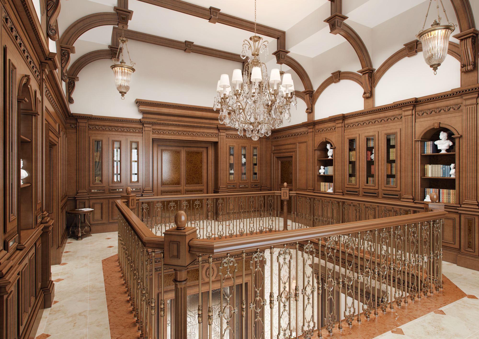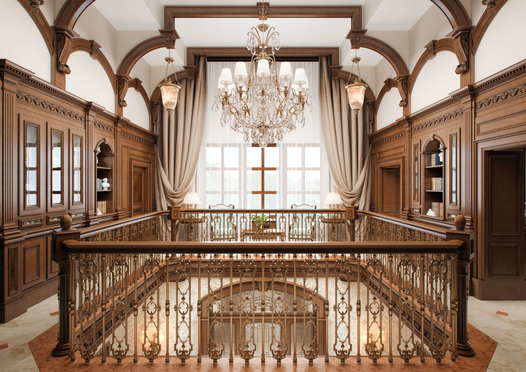 Ажурная позолоченная балюстрада в дизайне-проекте холла 3 этажа