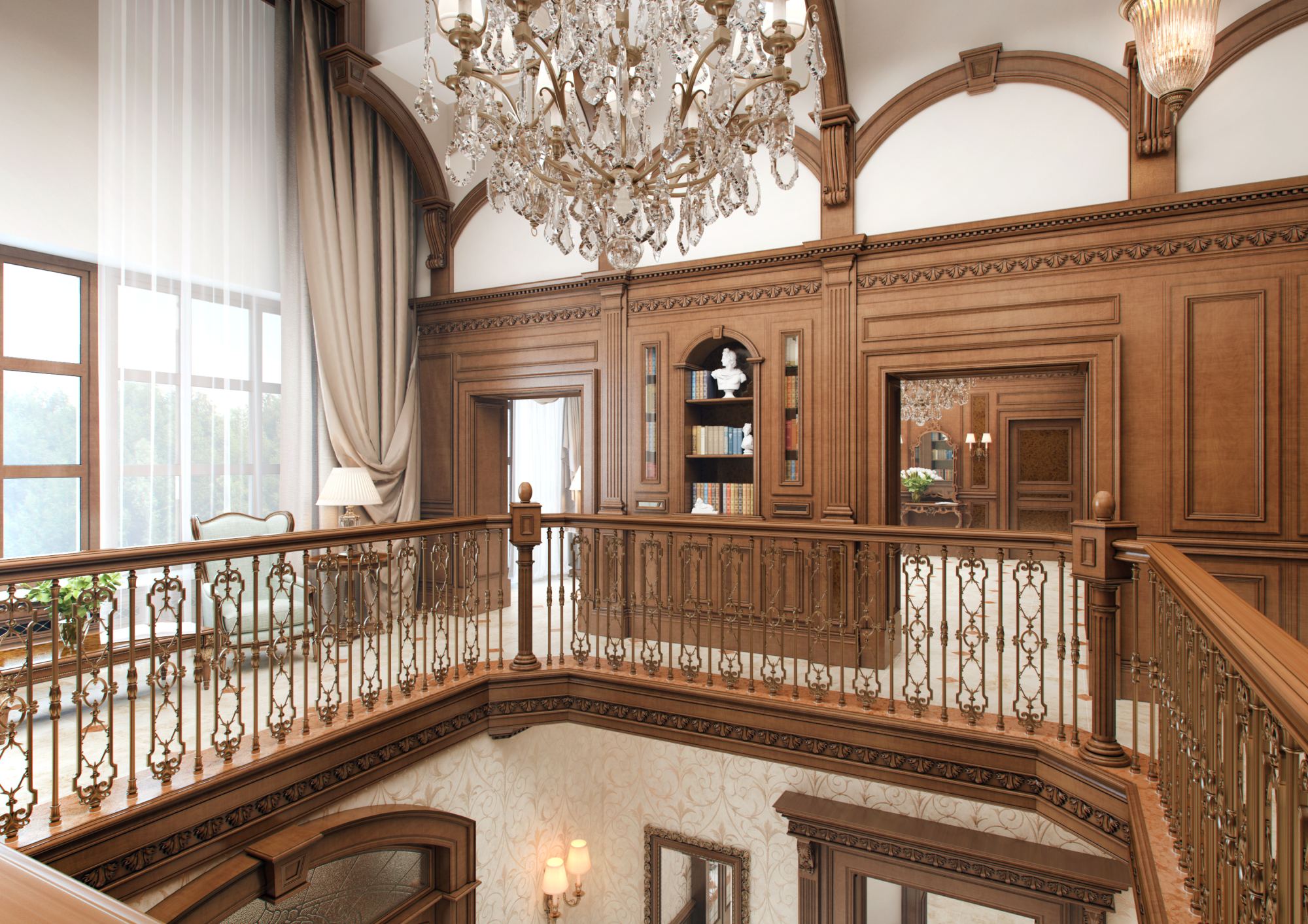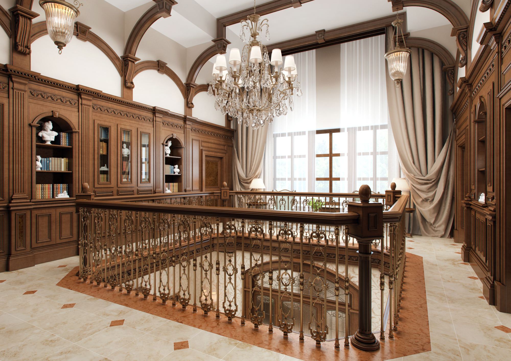 Обстановка холла с ажурной балюстрадой и зоной отдыха