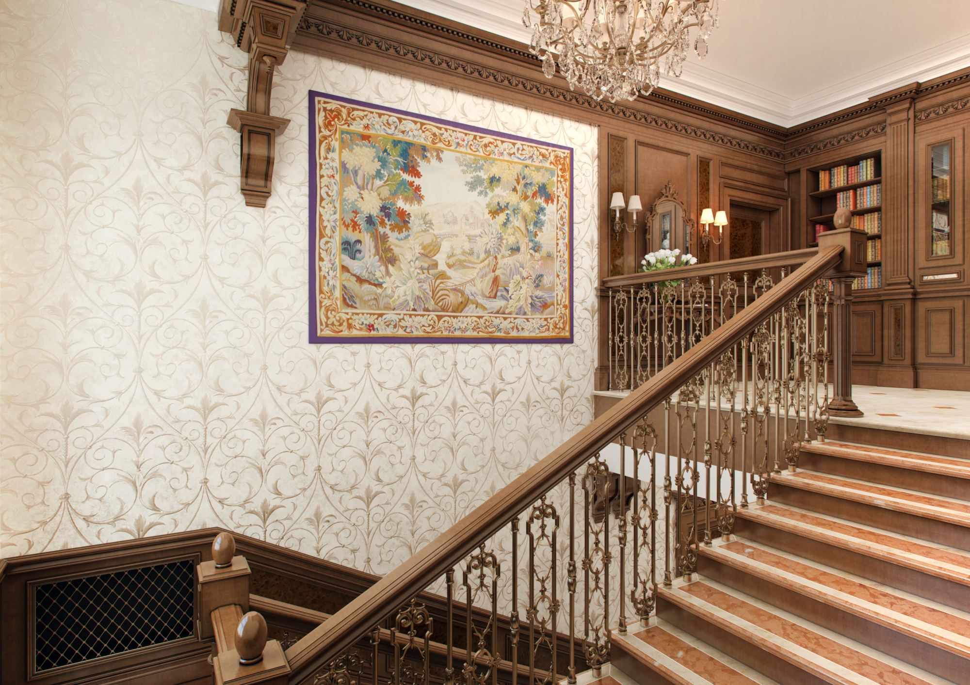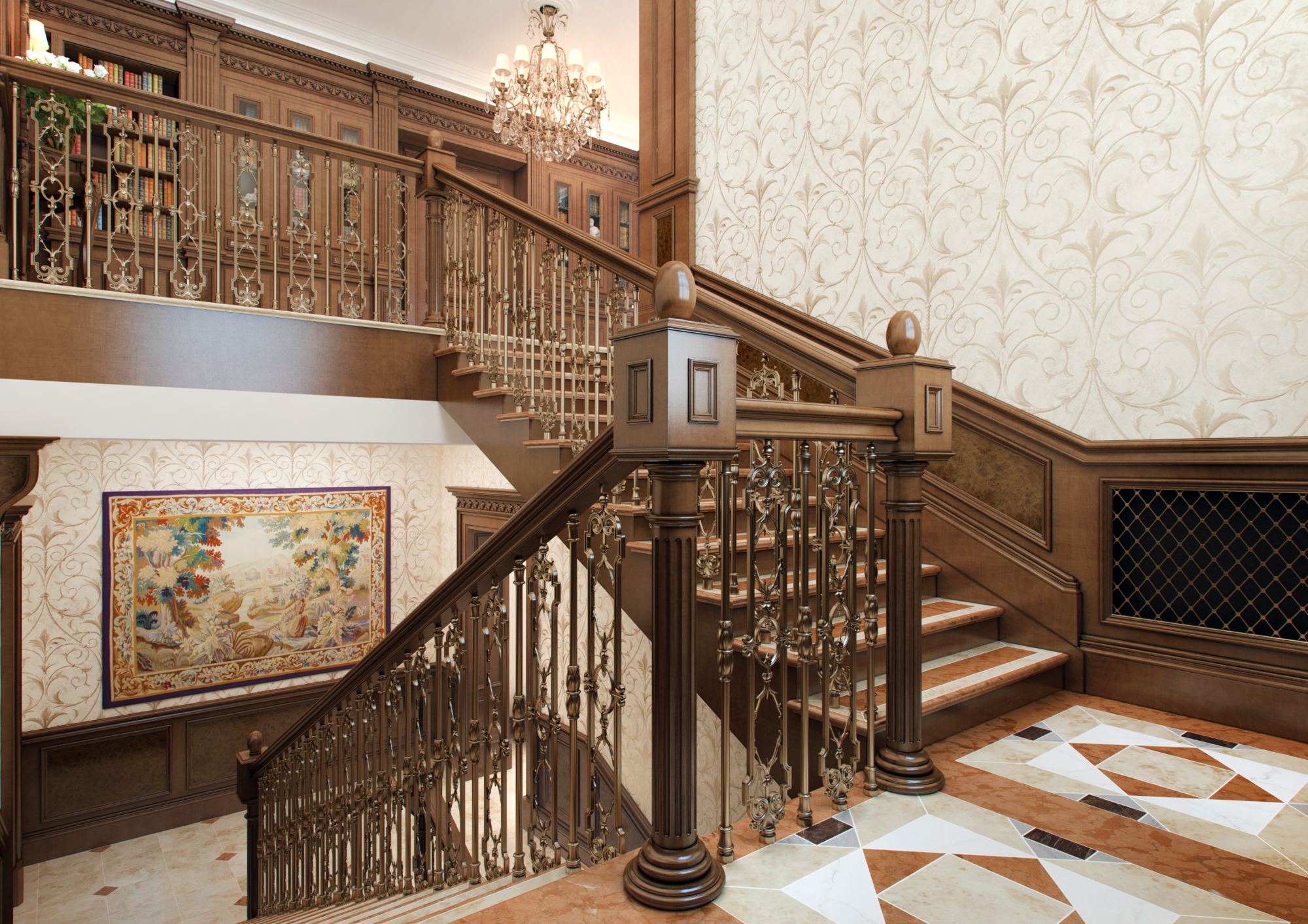 Инкрустированный мраморный пол и ступени в декоре лестничного пролета