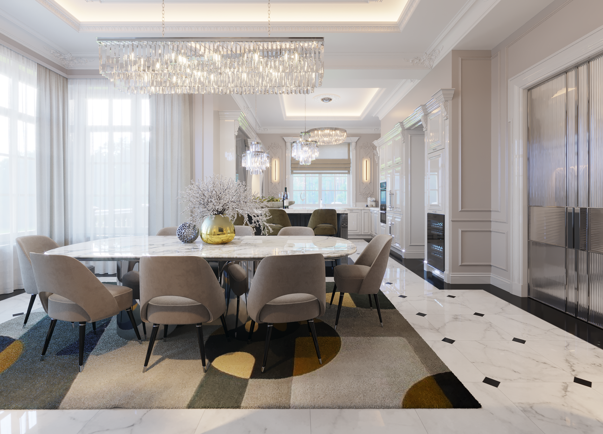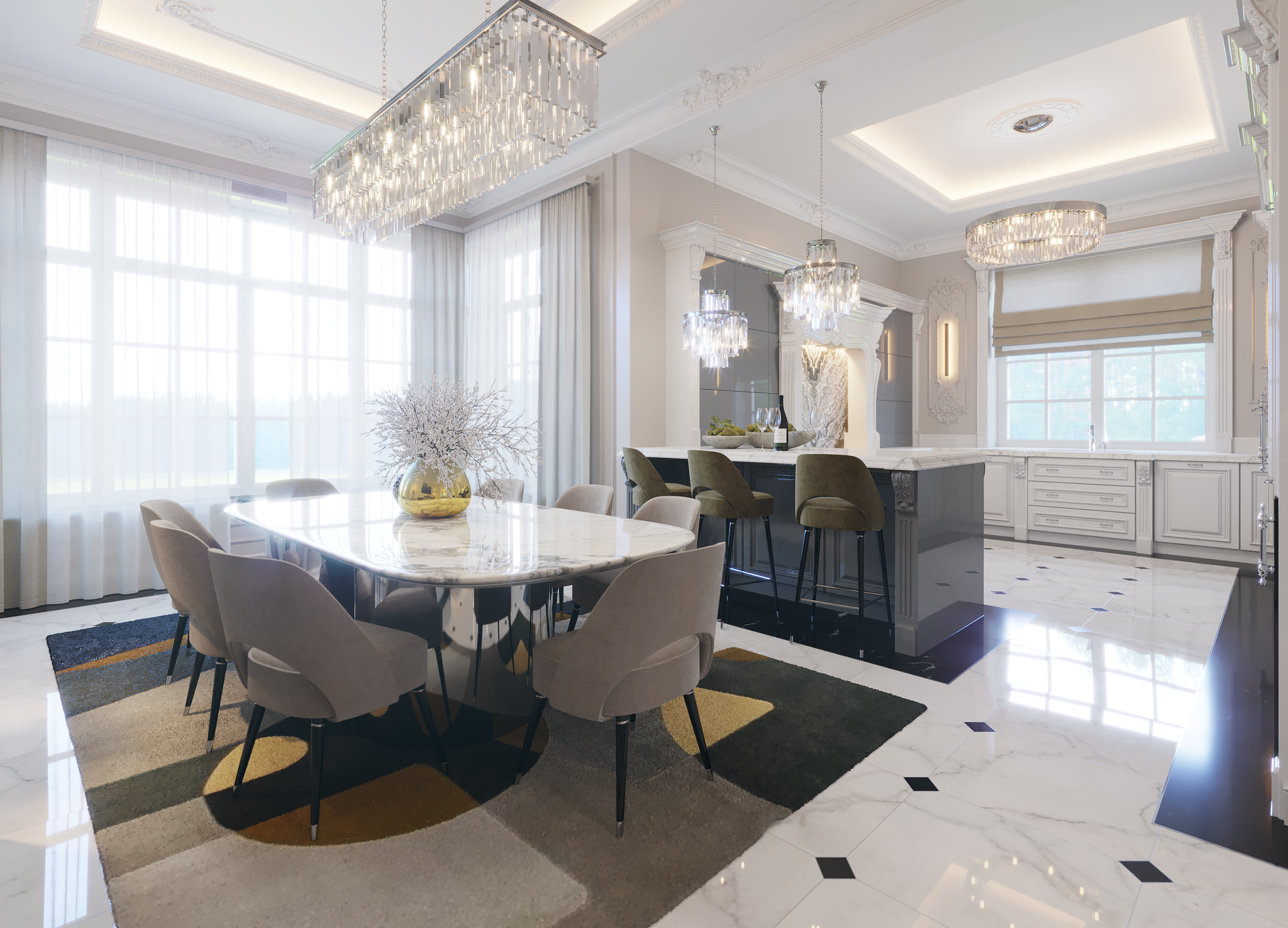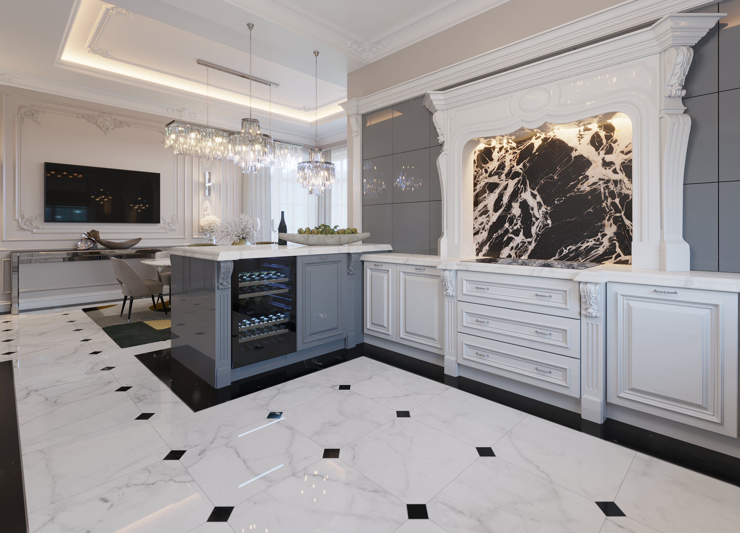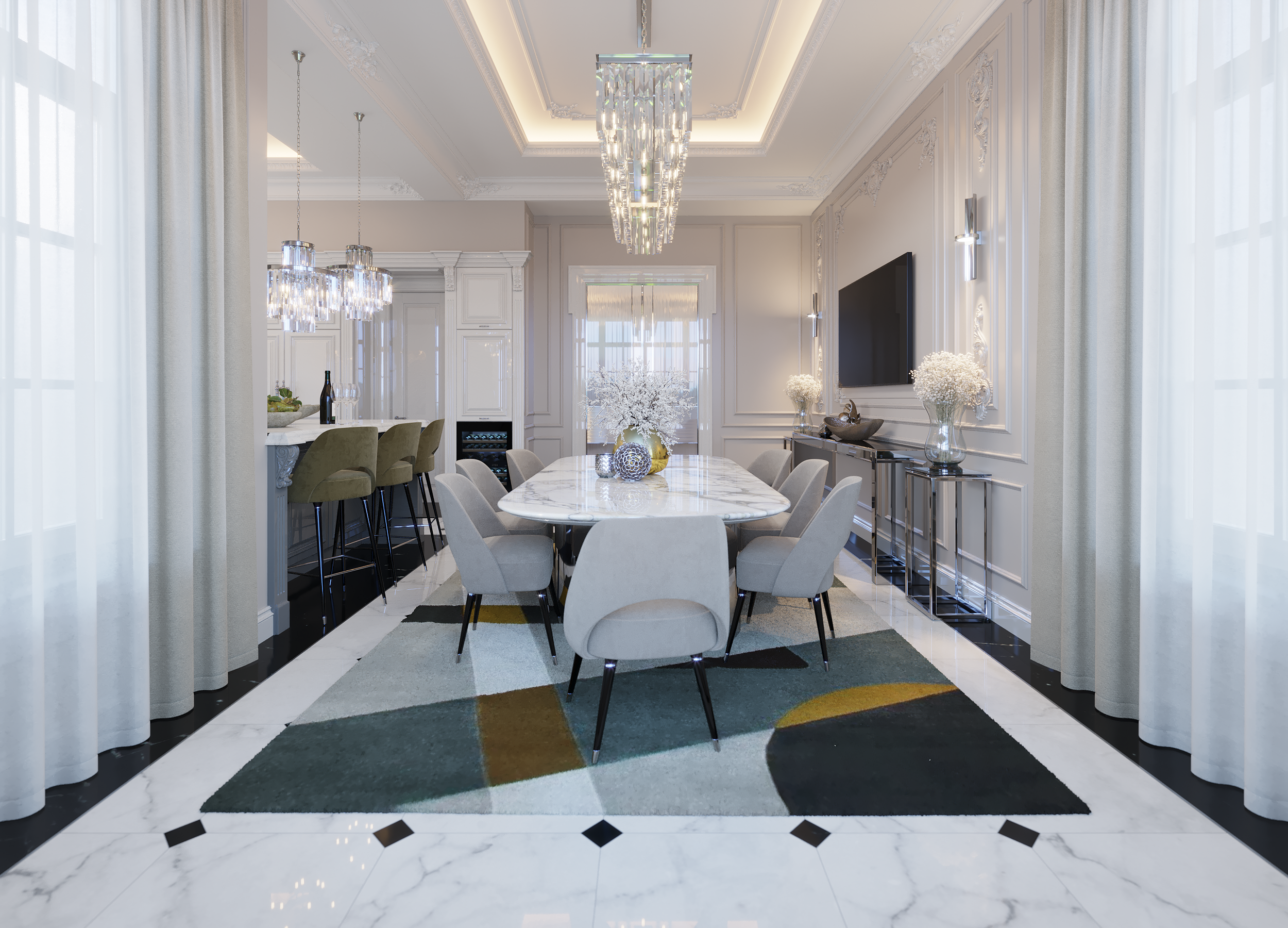 Бело-серая столовая рядом со стойкой кухни