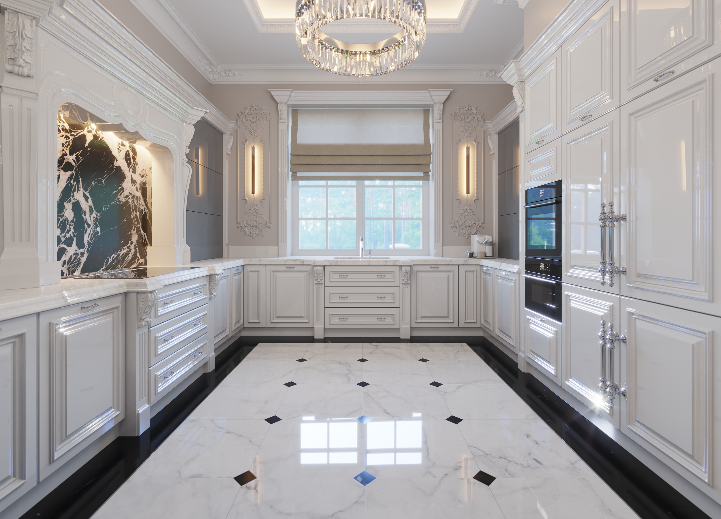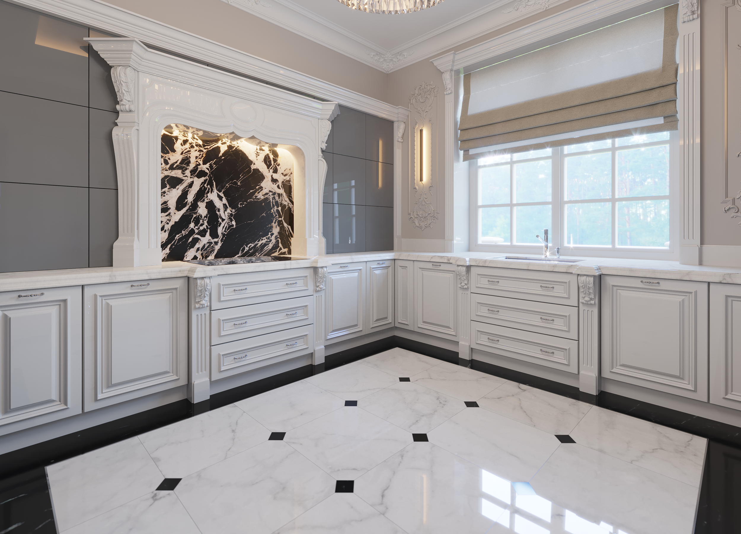Классический интерьер большой кухни с окном у раковины