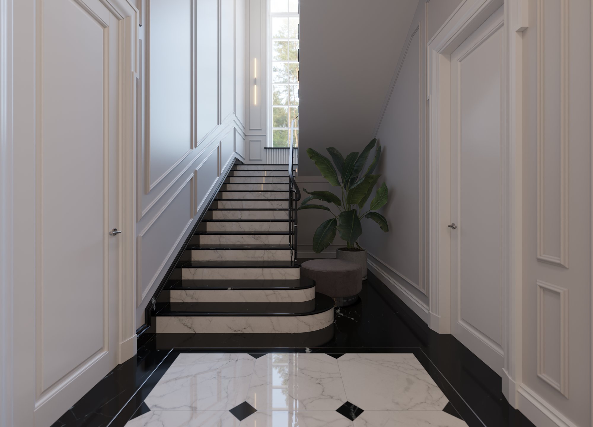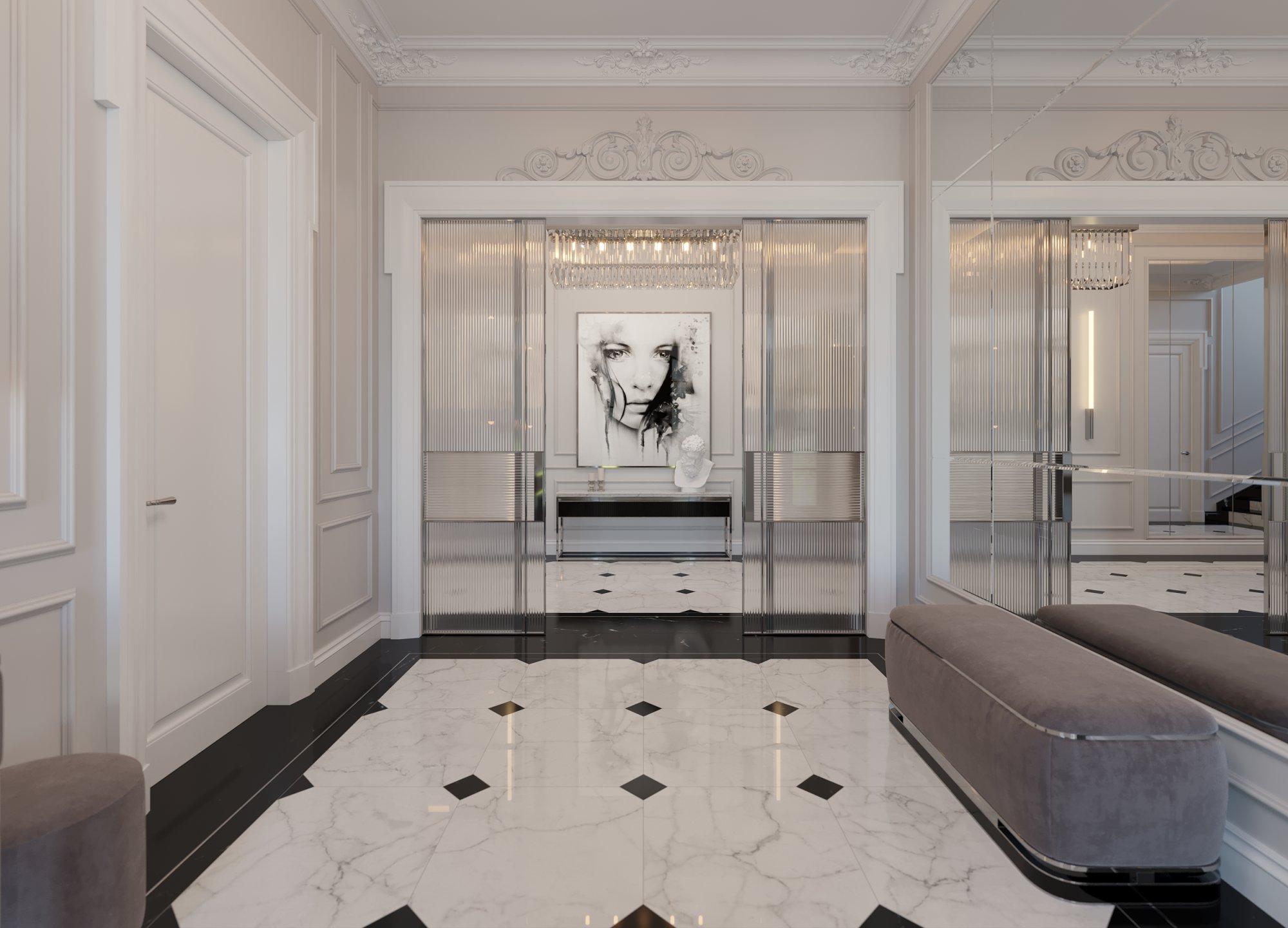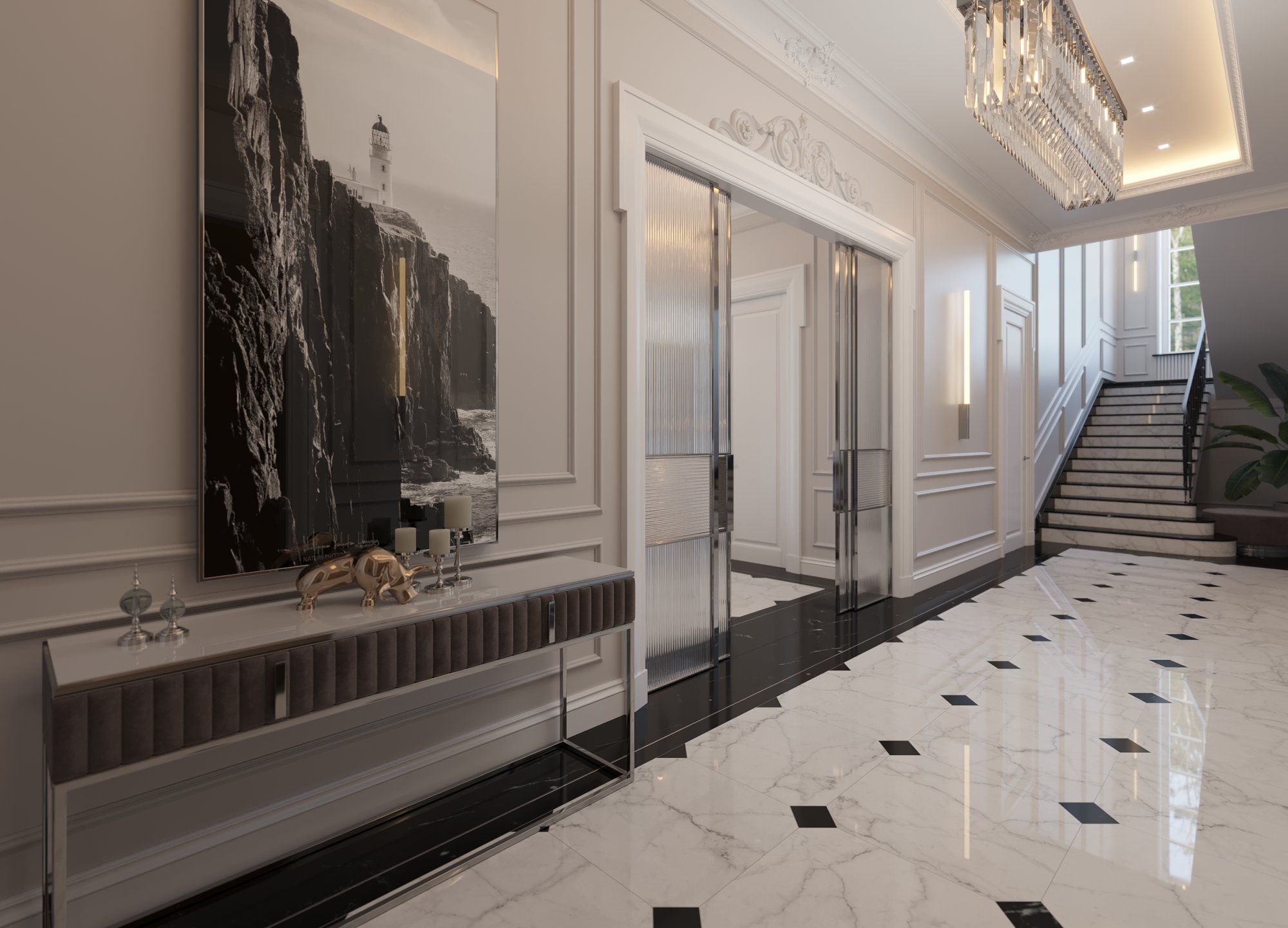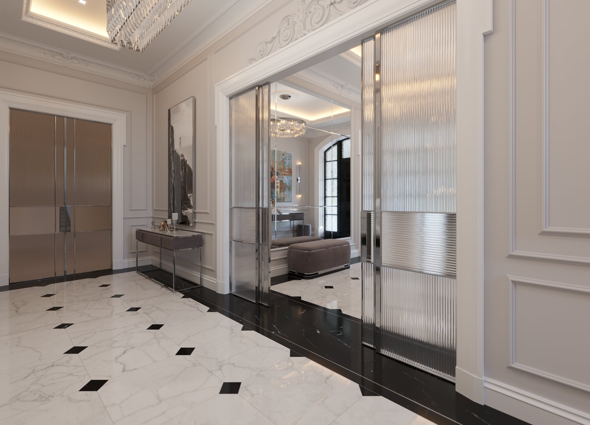 Раздвижные стеклянные двери в дизайне холла с лестницей