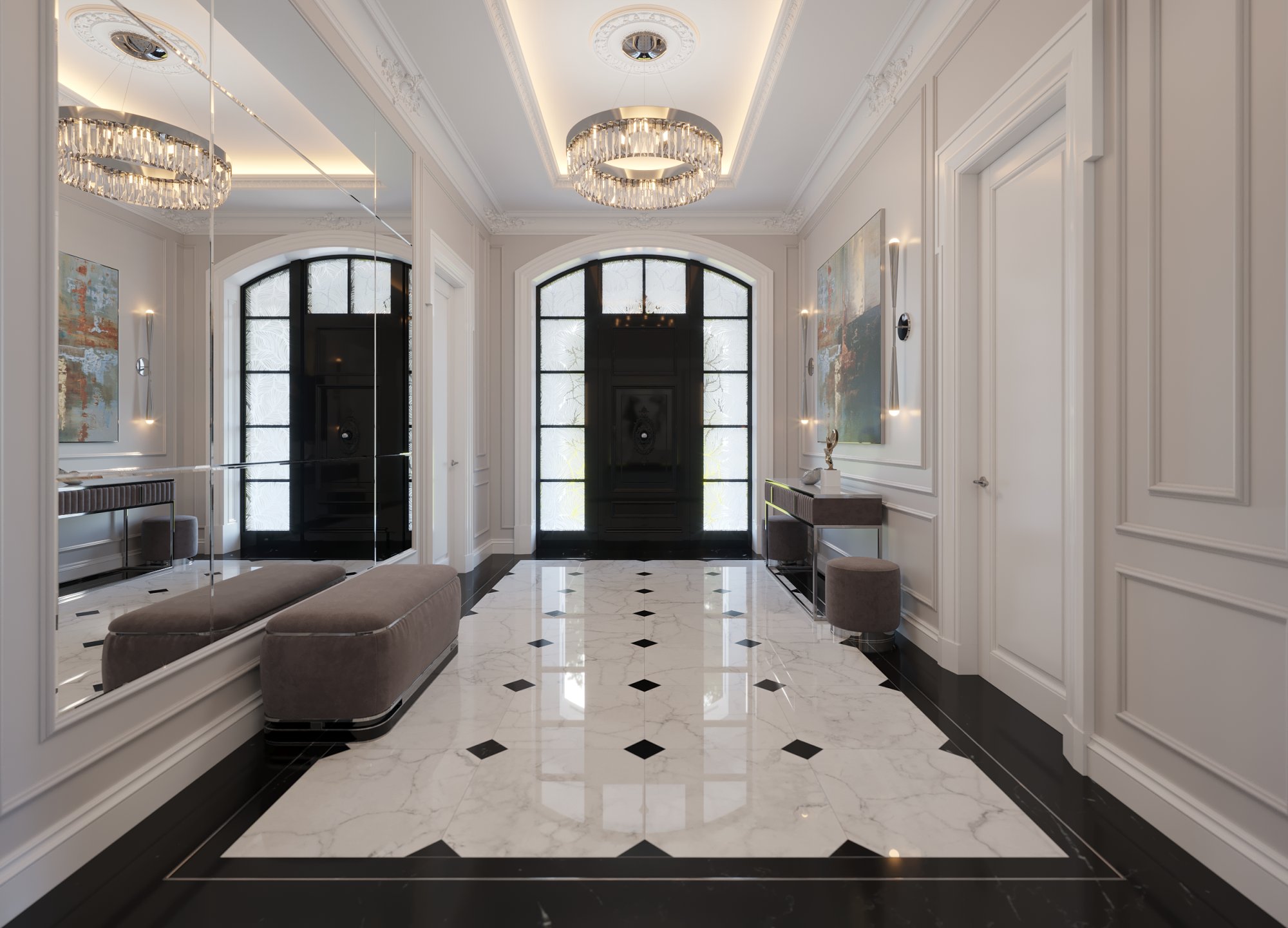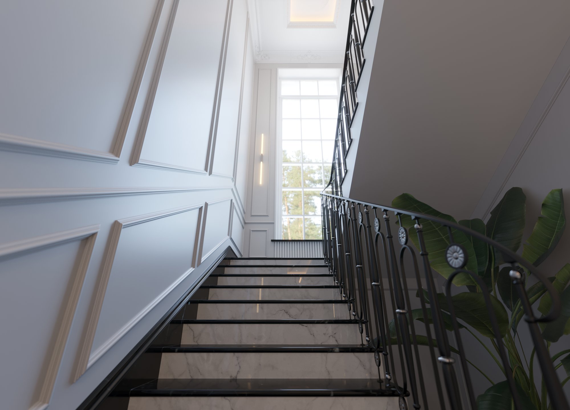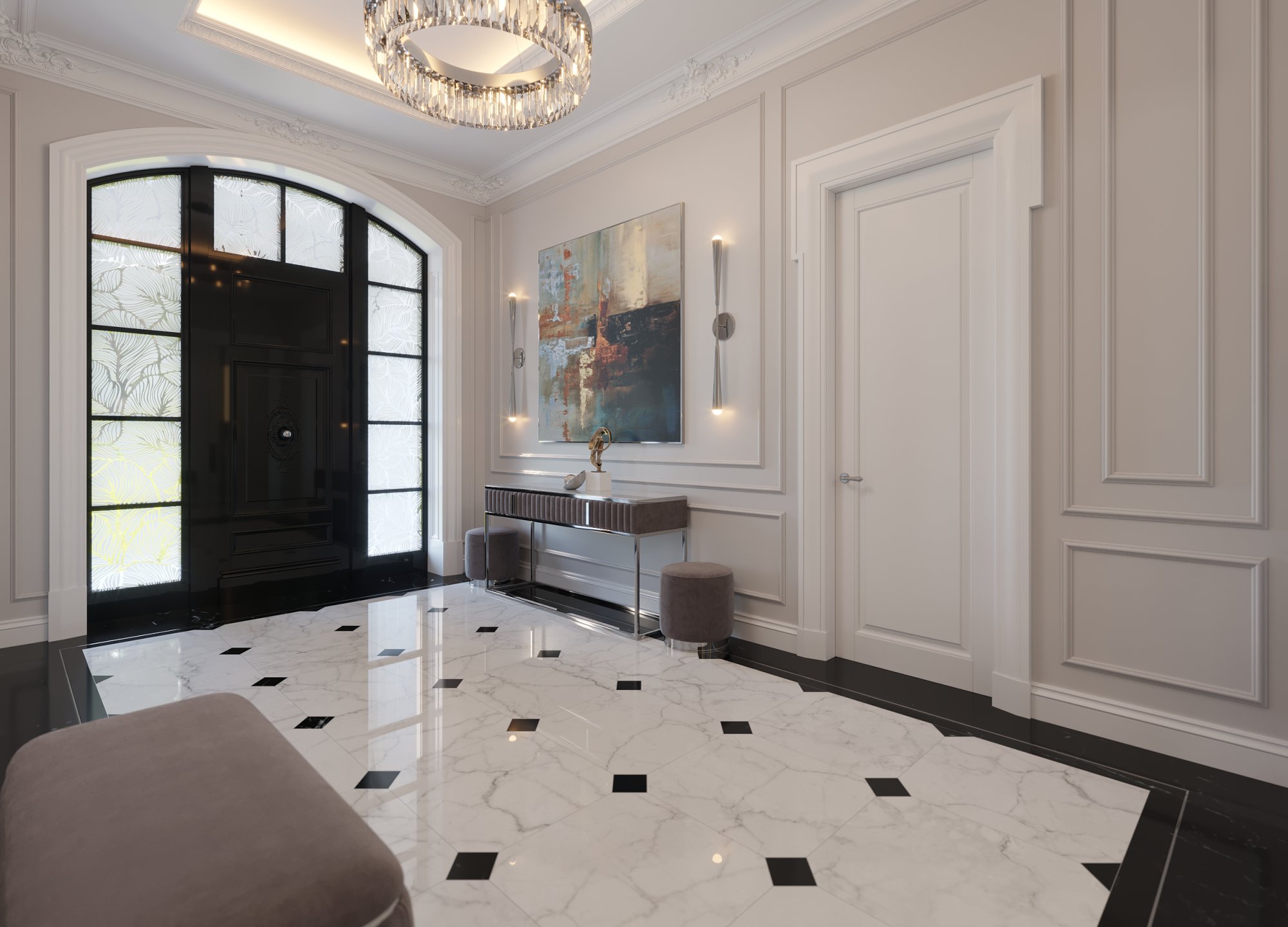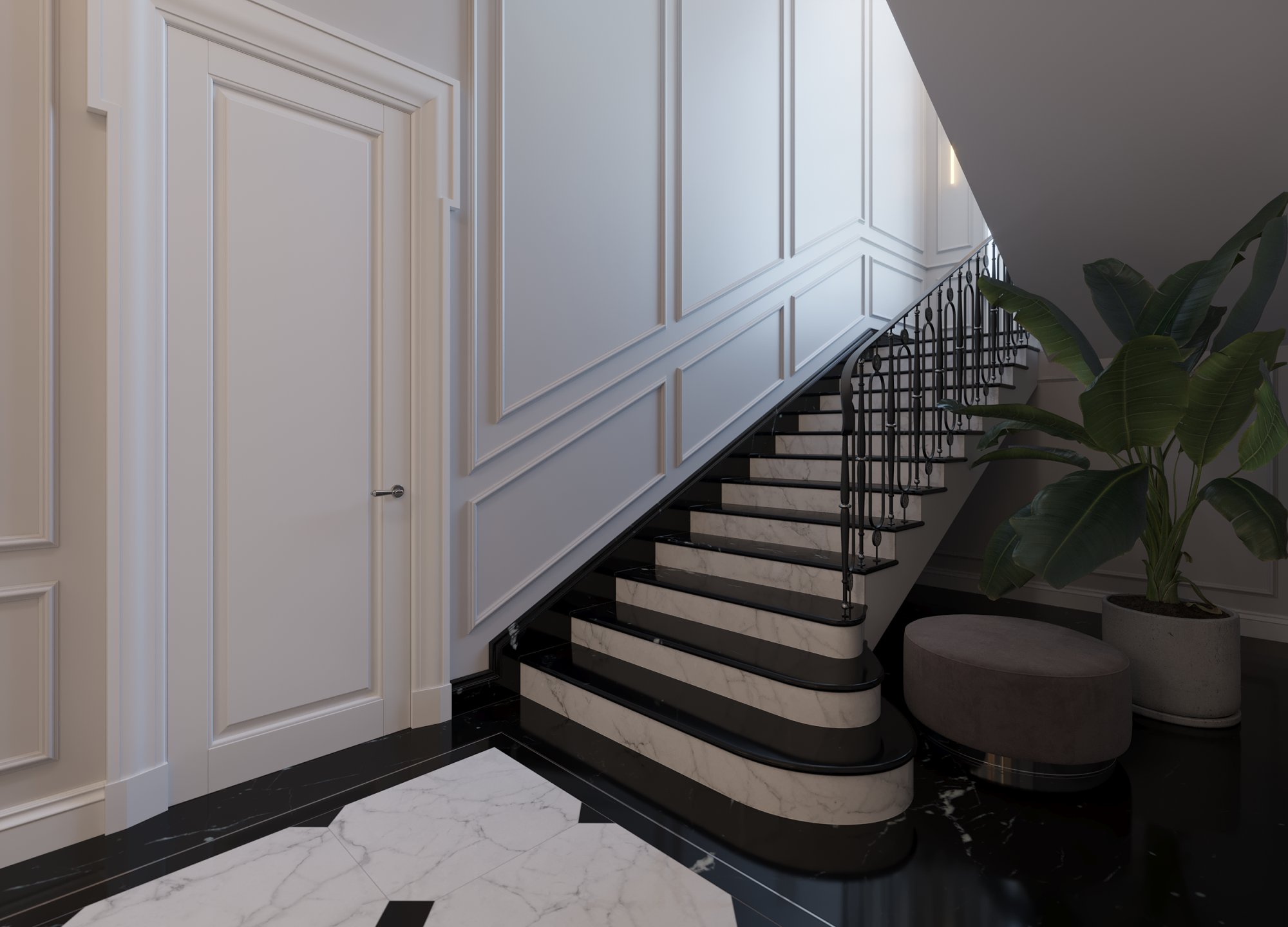 Раздвижные стеклянные двери в дизайне холла с лестницей