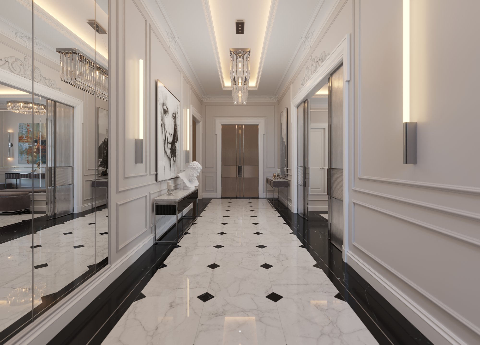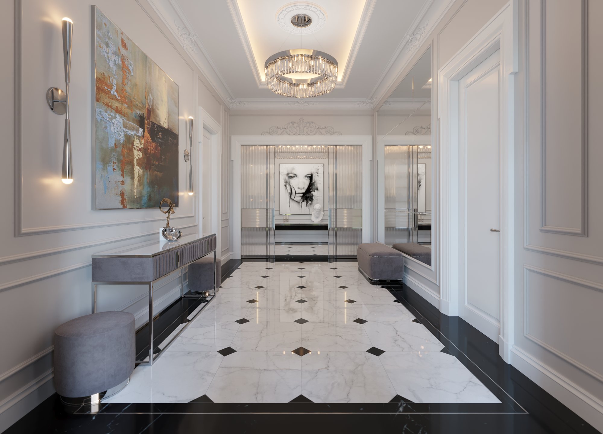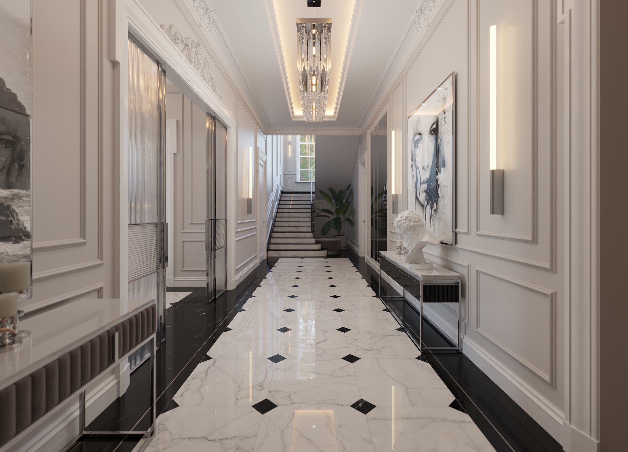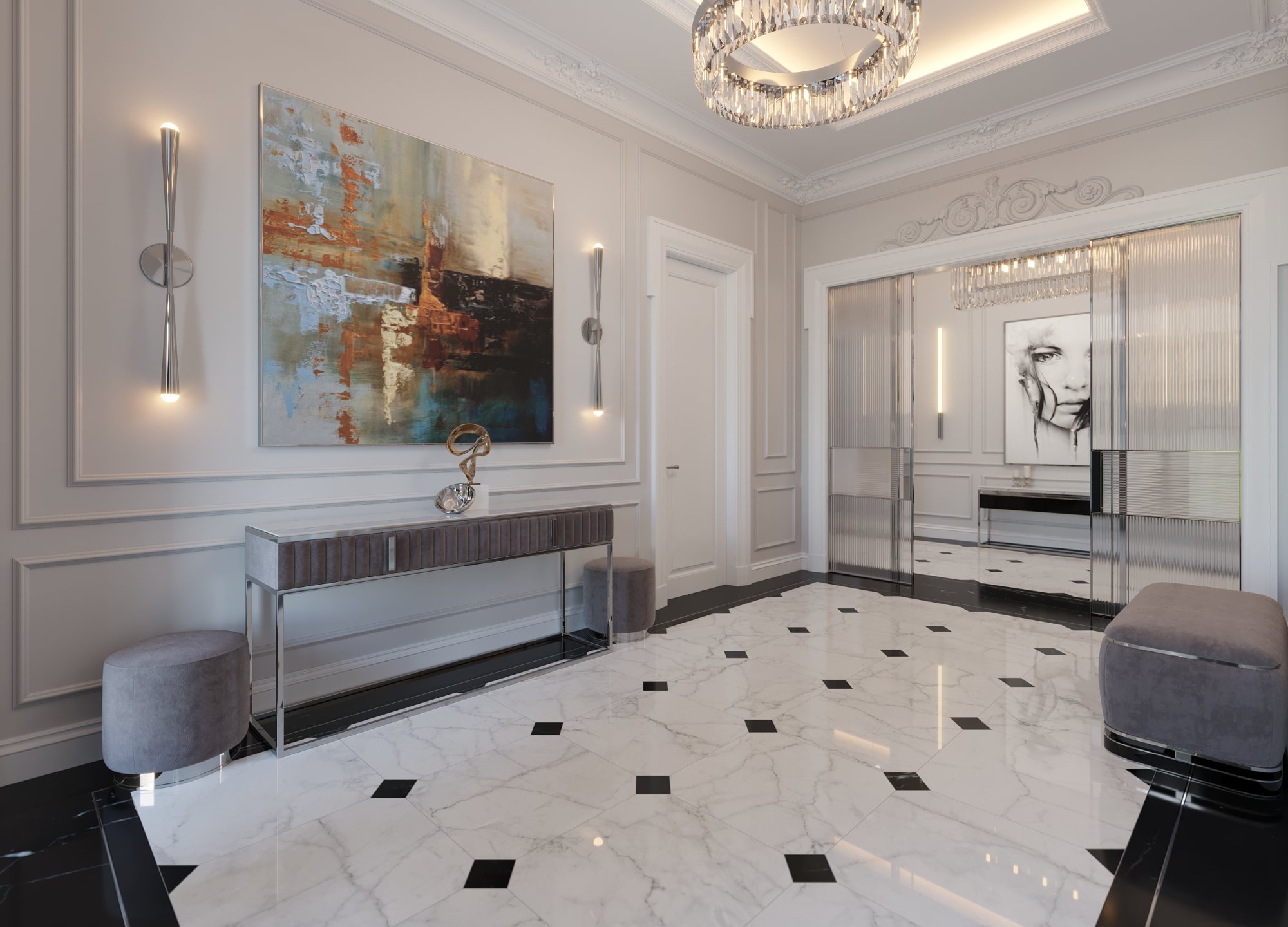 Раздвижные стеклянные двери в дизайне холла с лестницей