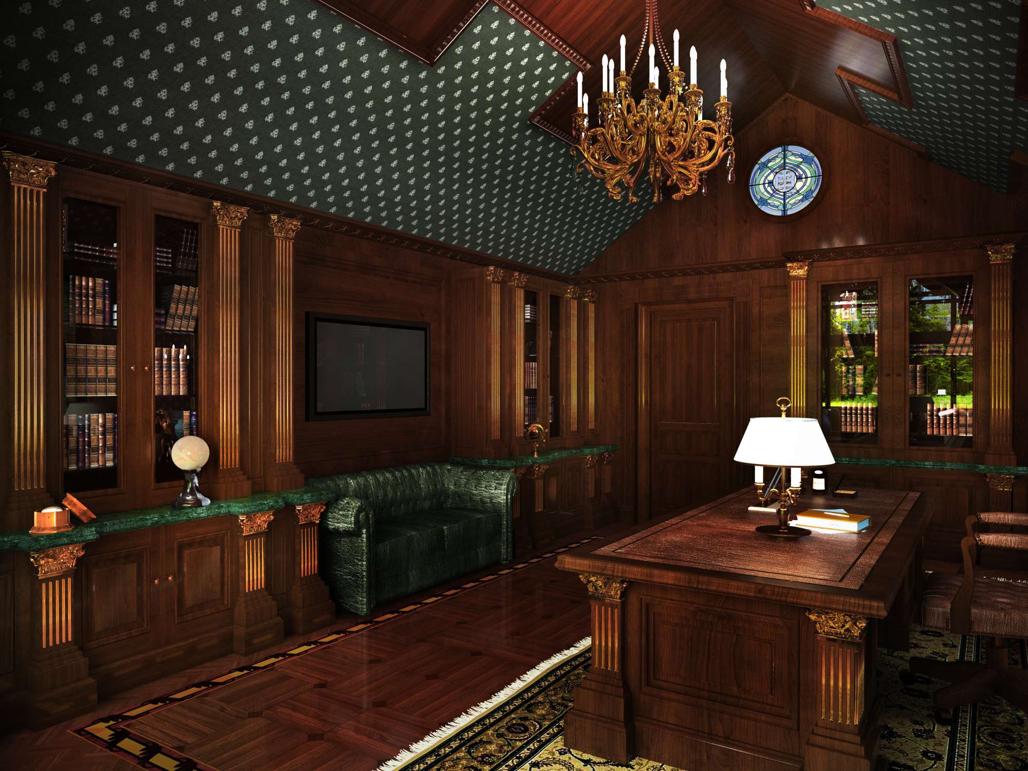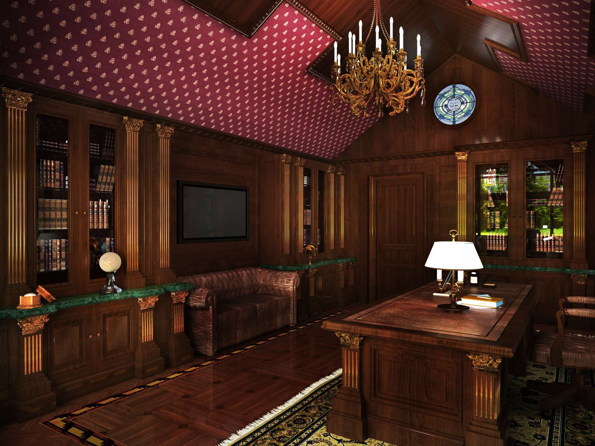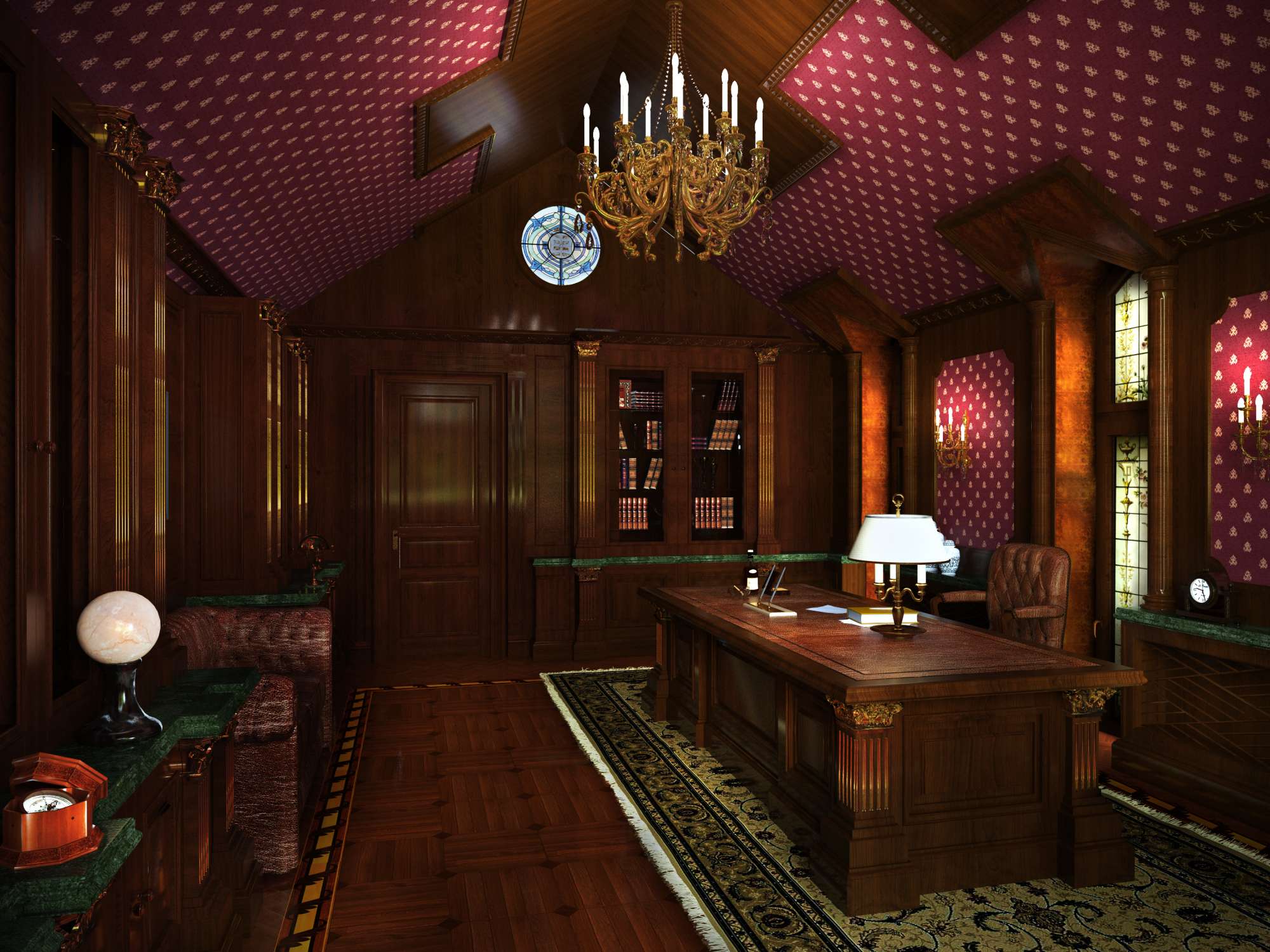 Дизайн-проект интерьера кабинета разработан в традиционных для стиля темных тонах. Активно использованное в оформлении дерево дополняется обоями темного винного оттенка, которыми отделаны потолок и стены.