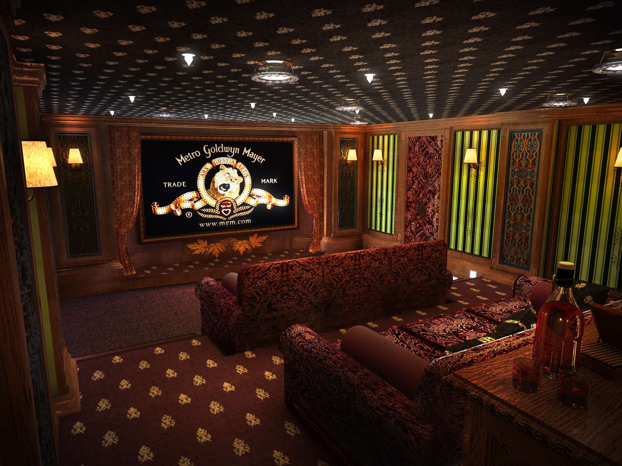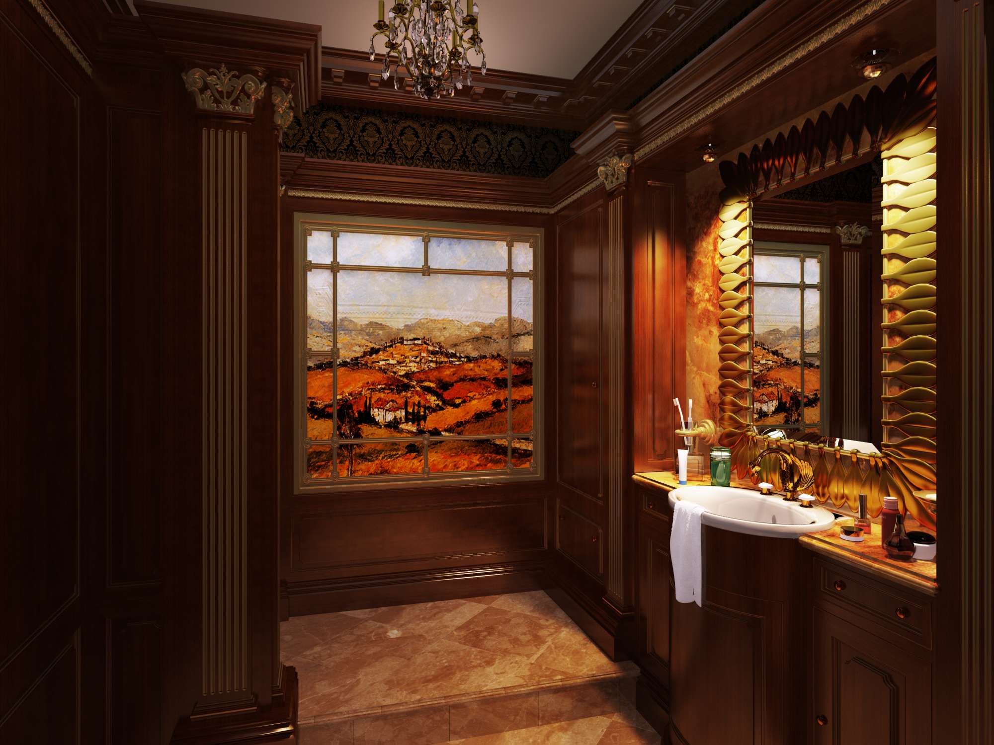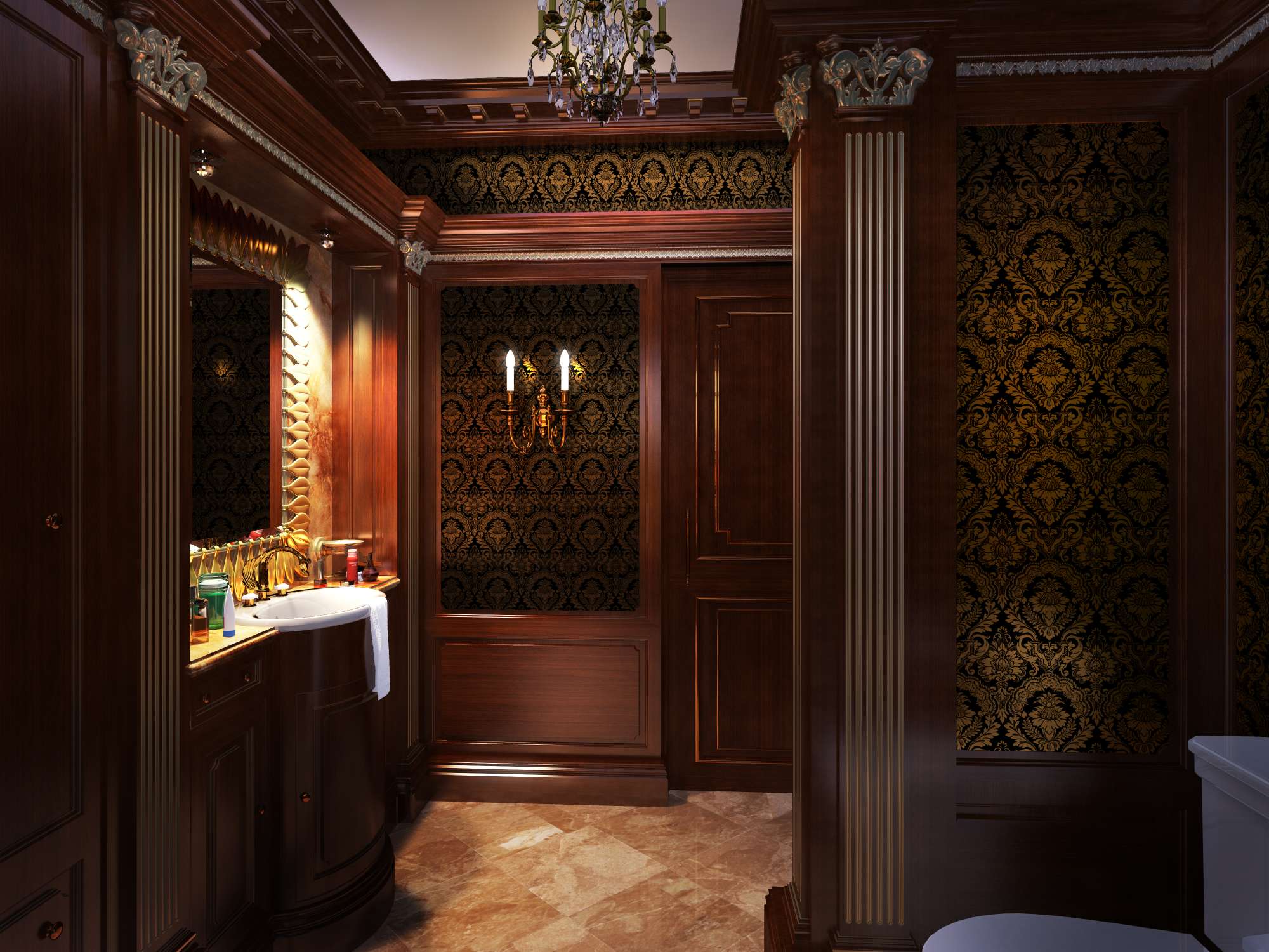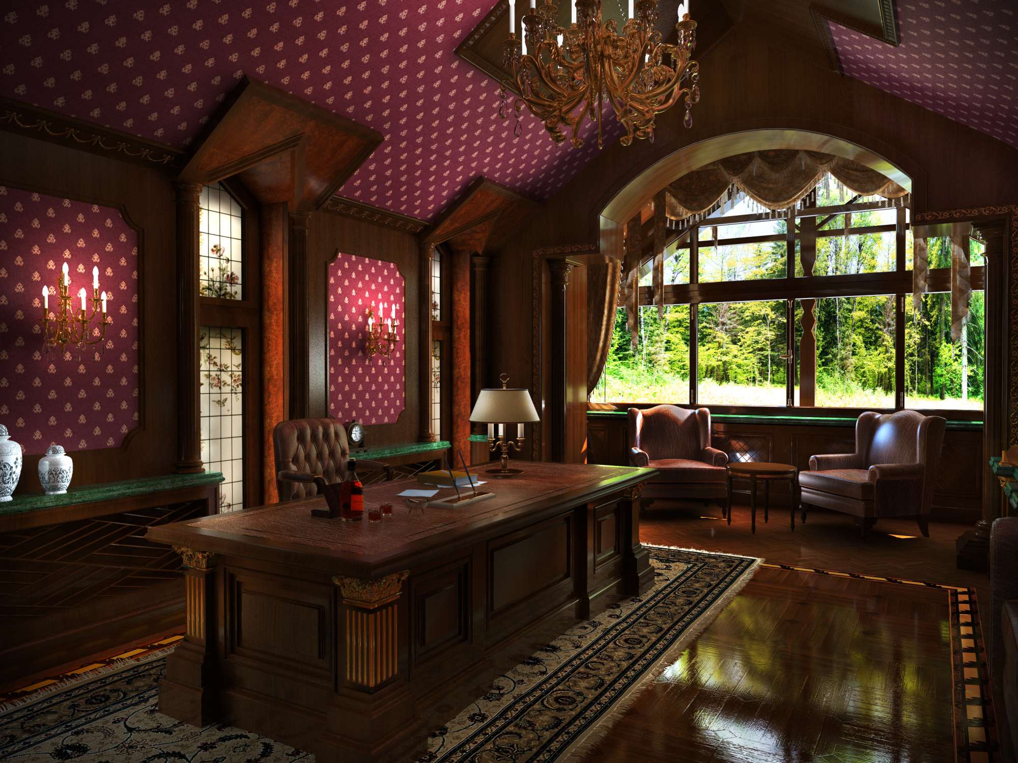 Дизайн-проект интерьера кабинета разработан в традиционных для стиля темных тонах. Активно использованное в оформлении дерево дополняется обоями темного винного оттенка, которыми отделаны потолок и стены.