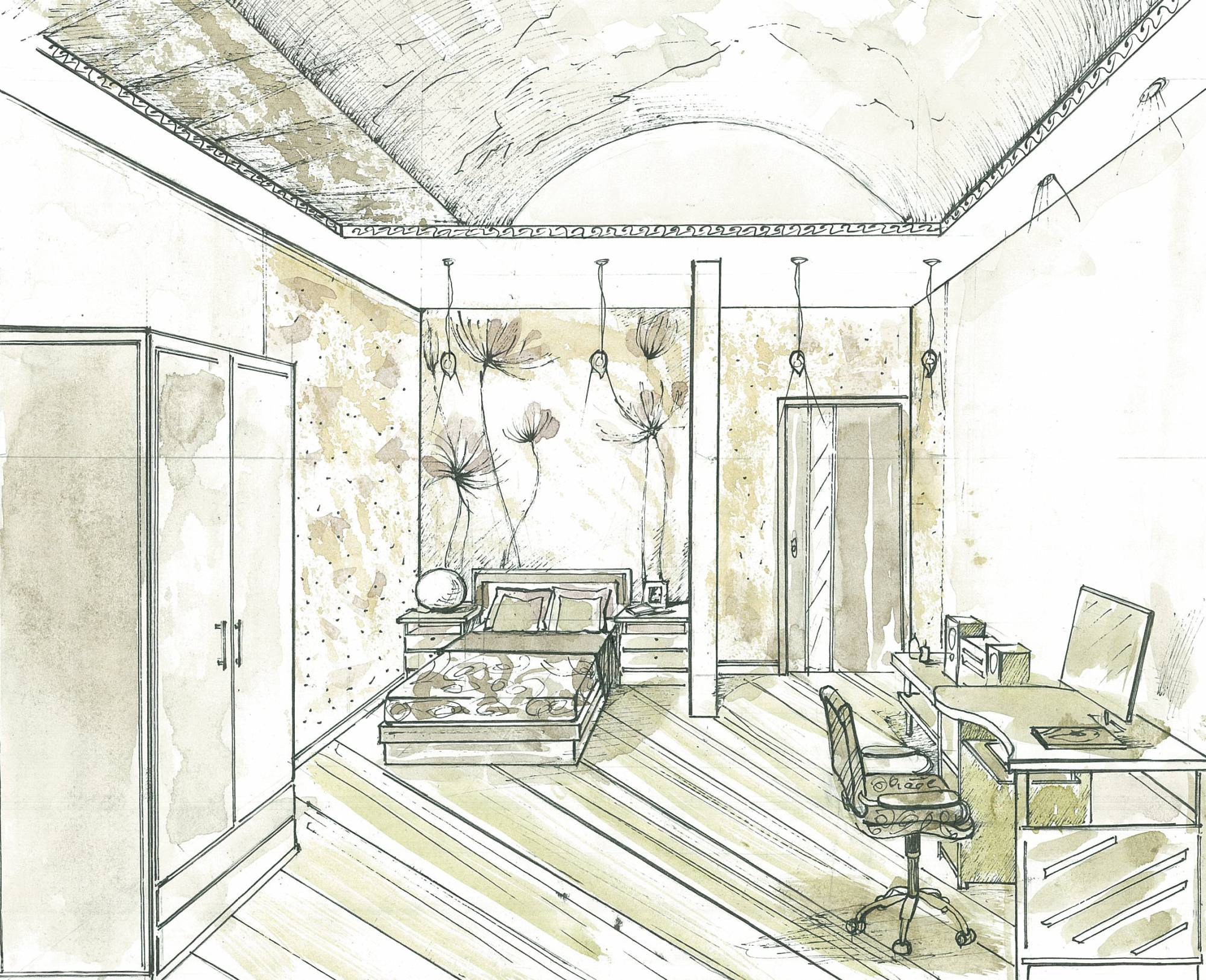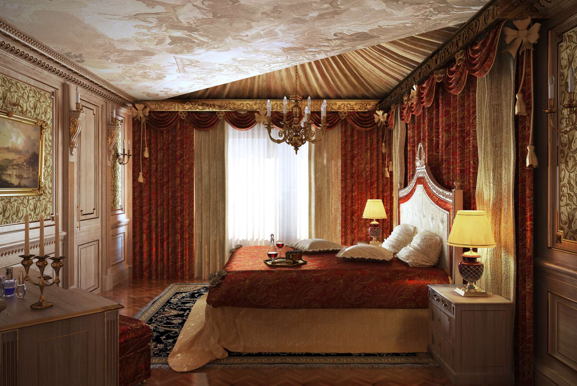 Роскошное убранство спальной комнаты создается сочетанием благородных тканей в оформлении стен и потолка с расписанным средневековым сюжетом потолком, позолоченным декором деревянных панелей.