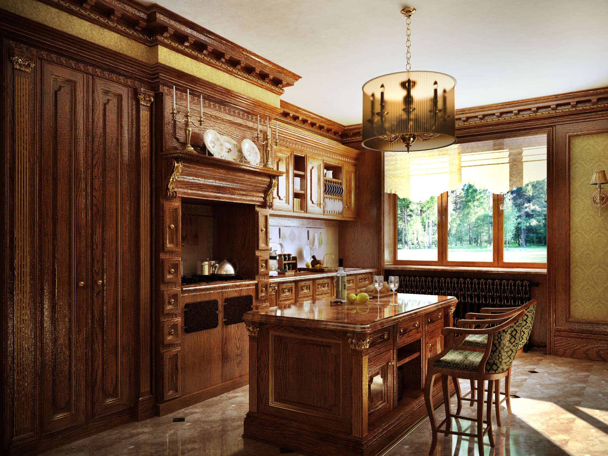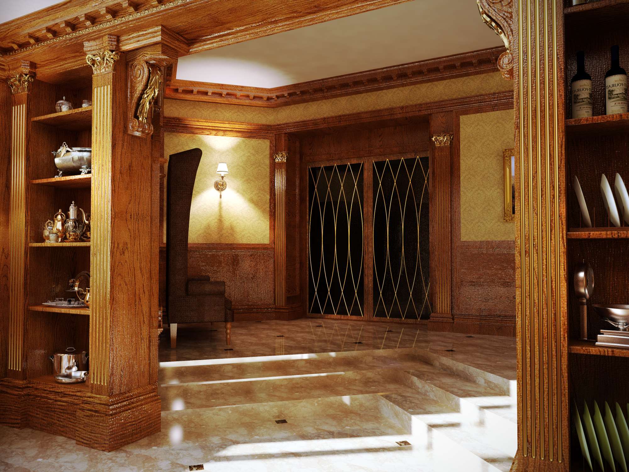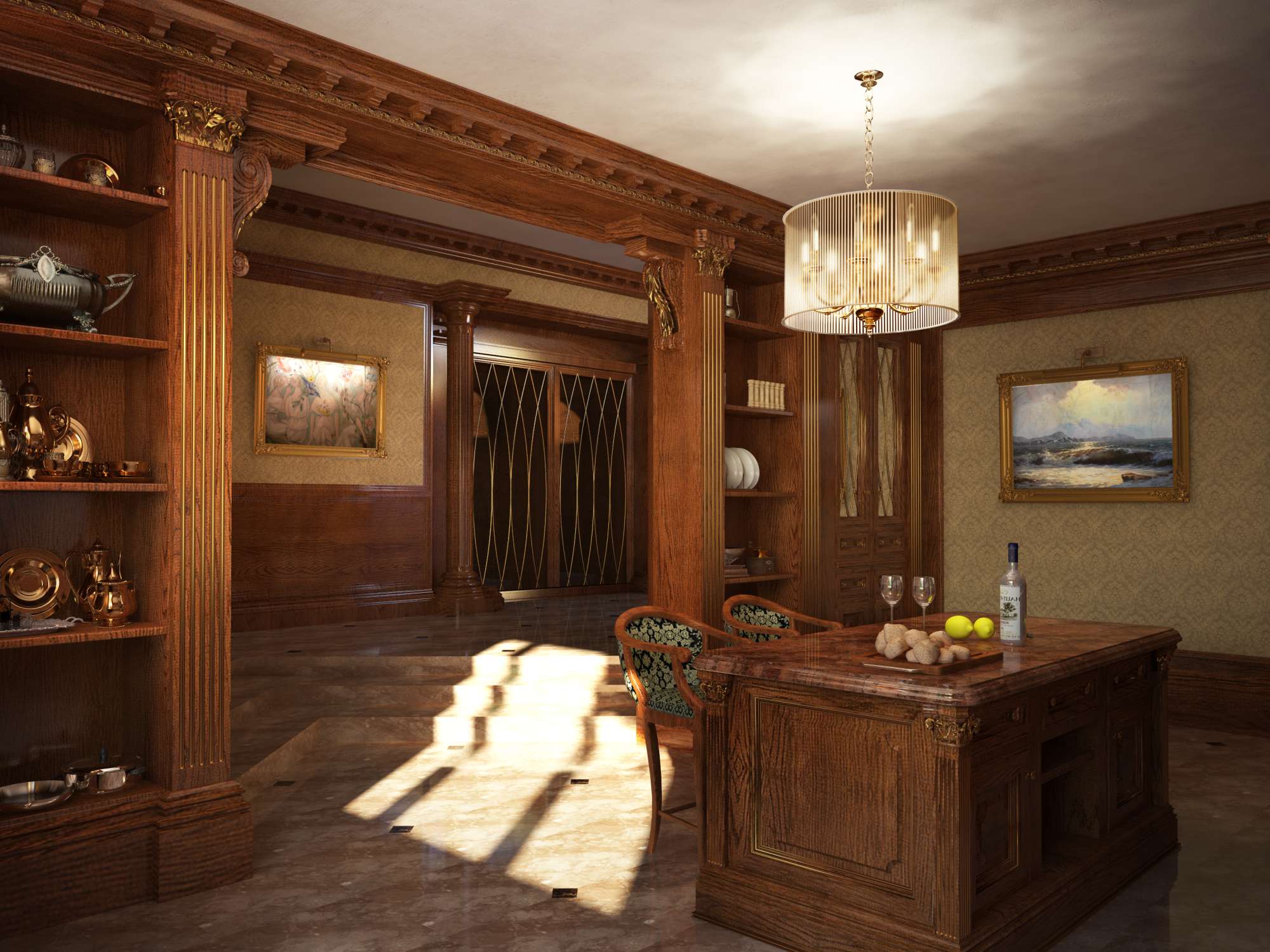 Характерные мотивы продолжены в интерьере кухни, бильярдной, вестибюля и соседней с ним проходной комнаты.
