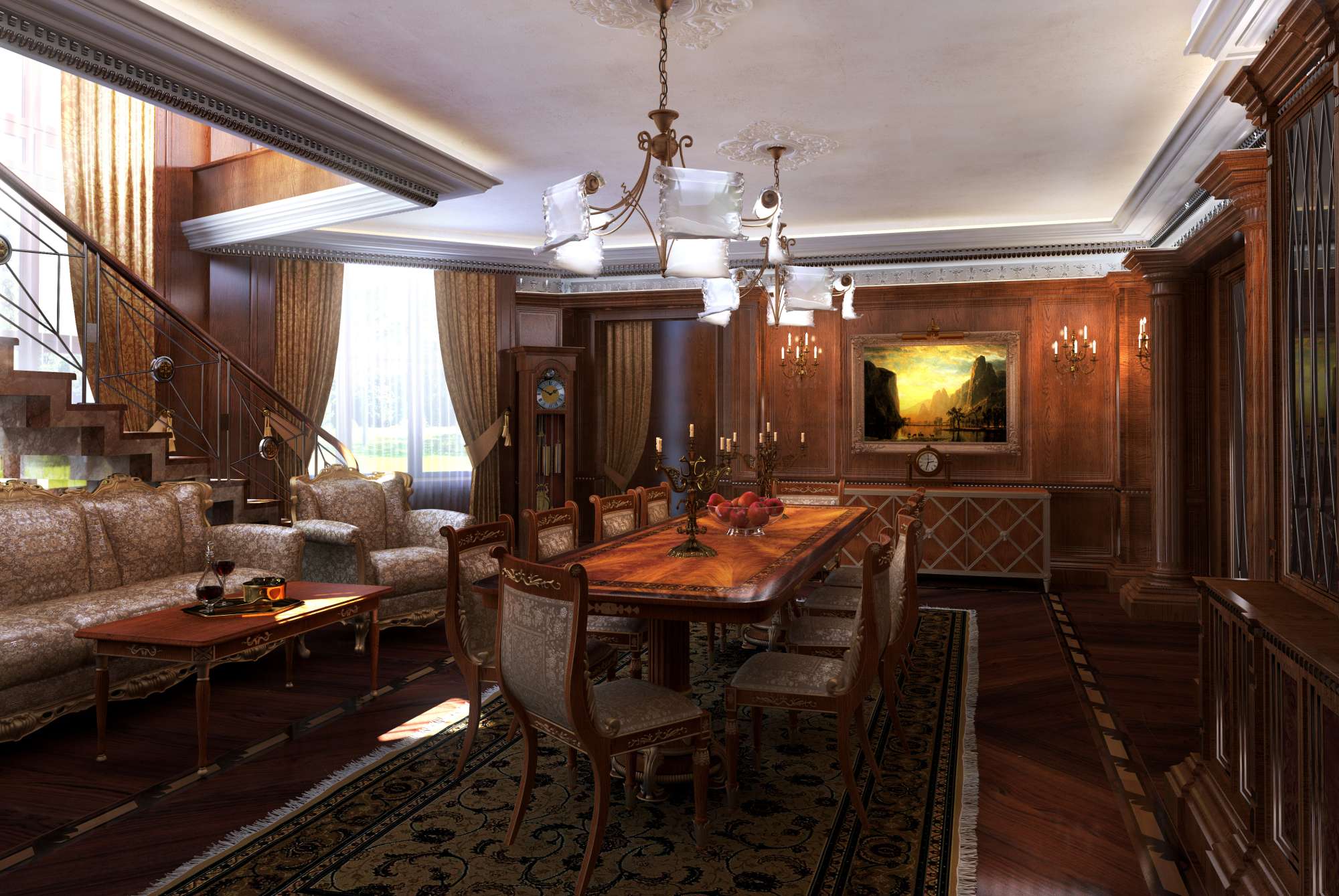 Английский стиль привлекателен в первую очередь своей аристократичностью, подчеркнутой в деталях, как в данном проекте. Все стены столовой обшиты красным деревом, лакированные поверхности органичны с зеркальными фацетными полотнами дверей и вставок мебели.