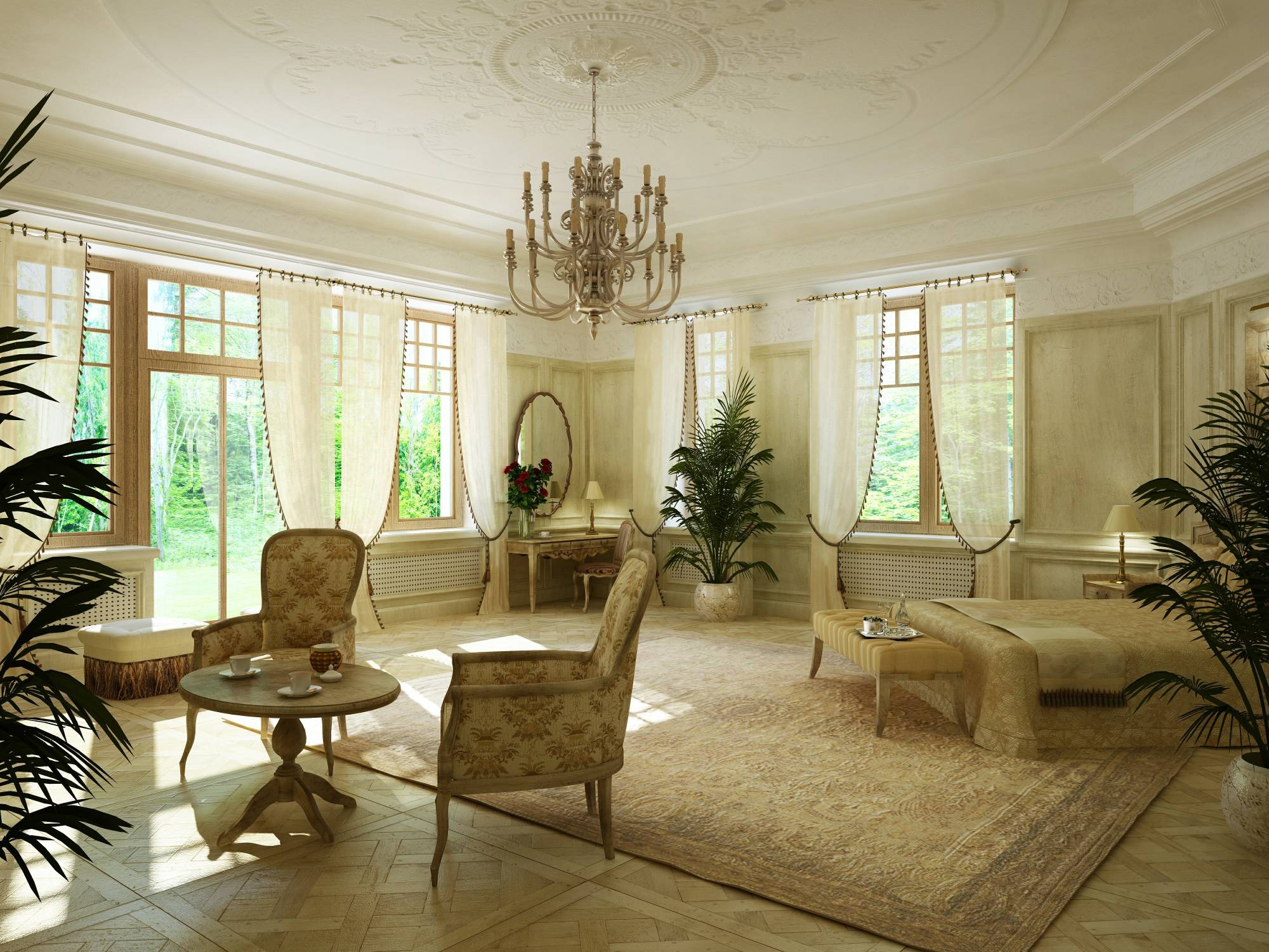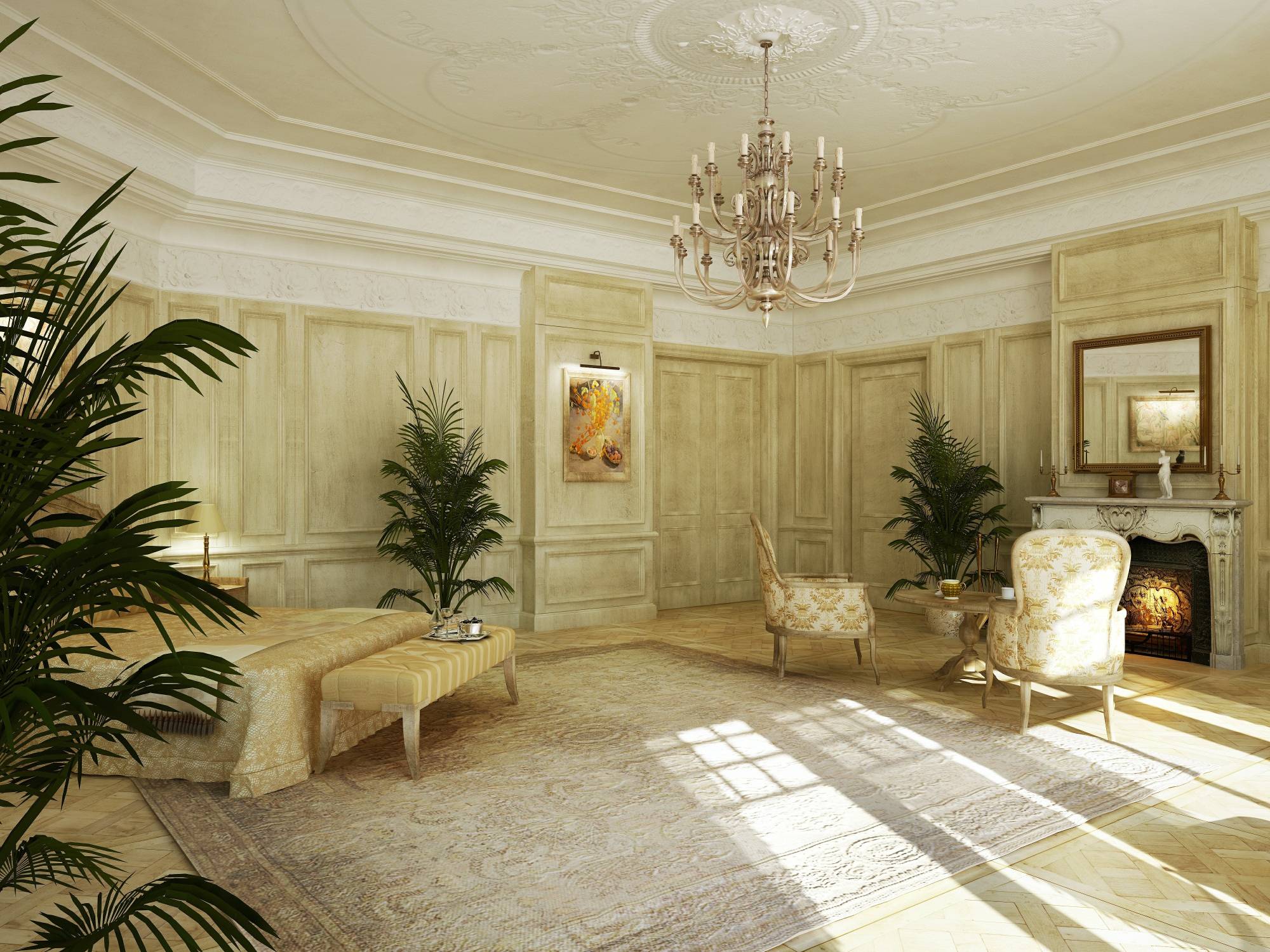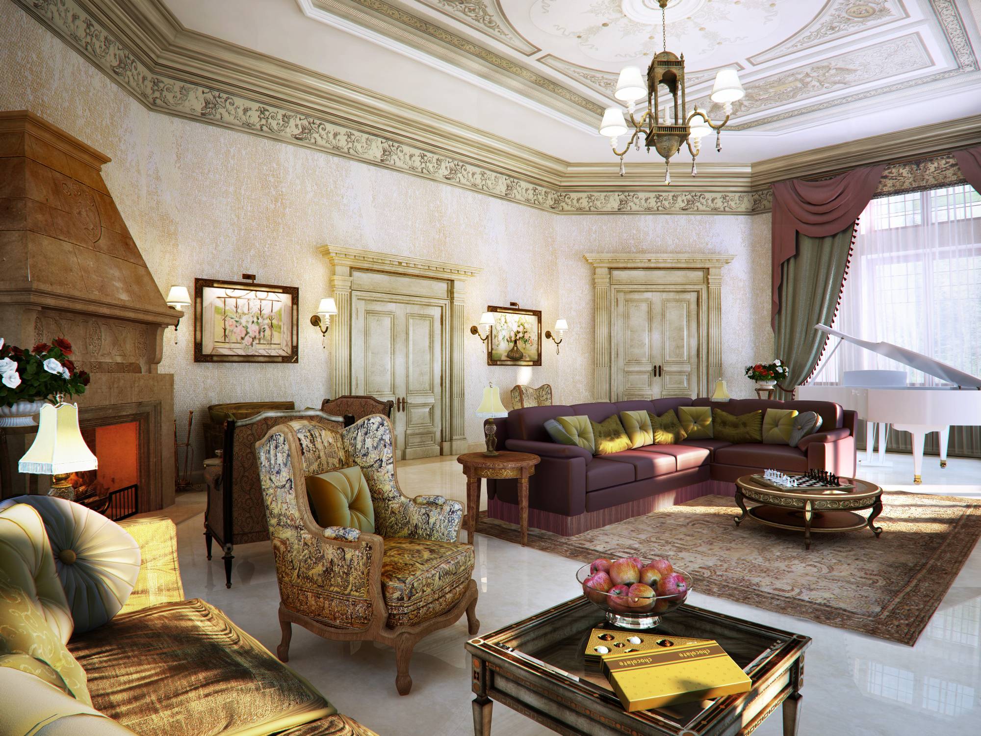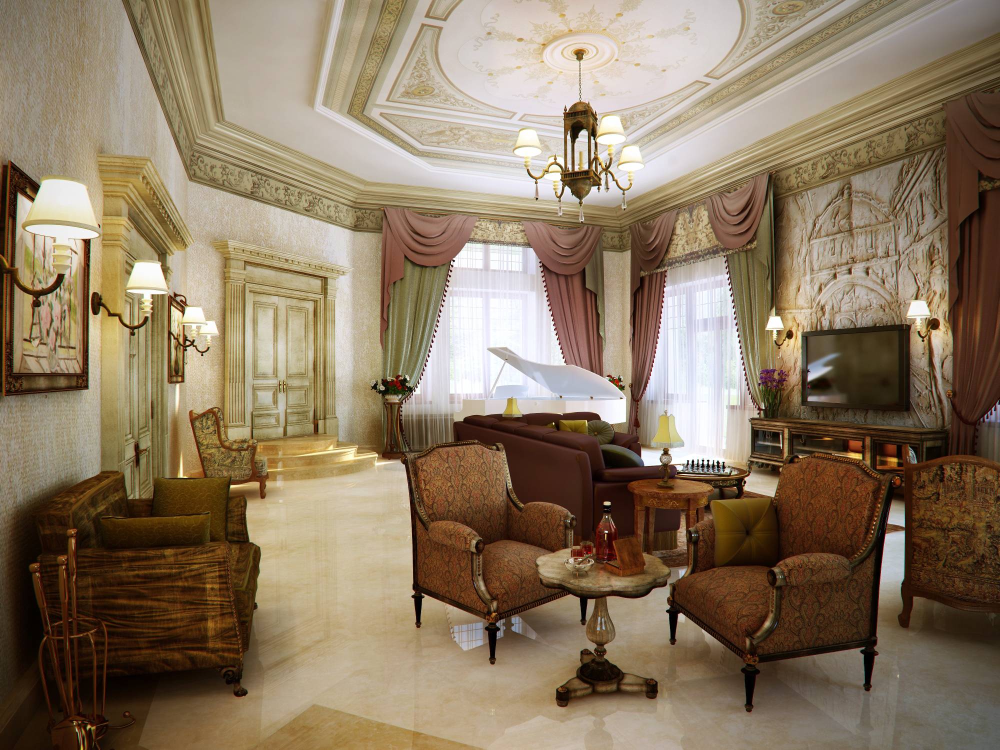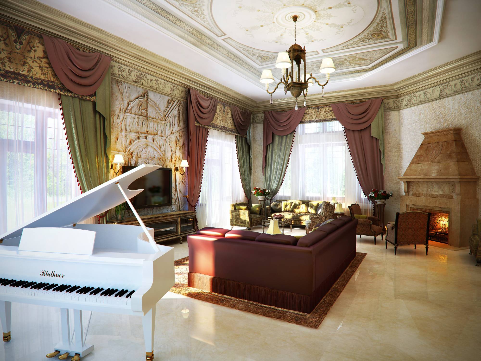У торцевого окна организована еще одна потрясающая диванная группа, а угол отведен каминной зоне. В основе цветовой гаммы – бежево-серые оттенки стен, потолка и облицованного мрамором пола, в качестве акцентов – винные и изумрудные портьеры.