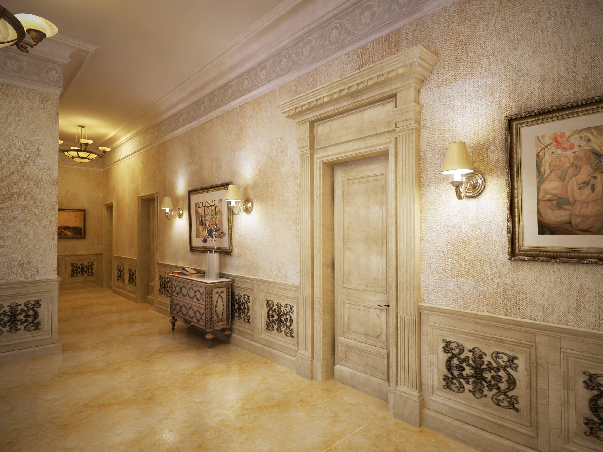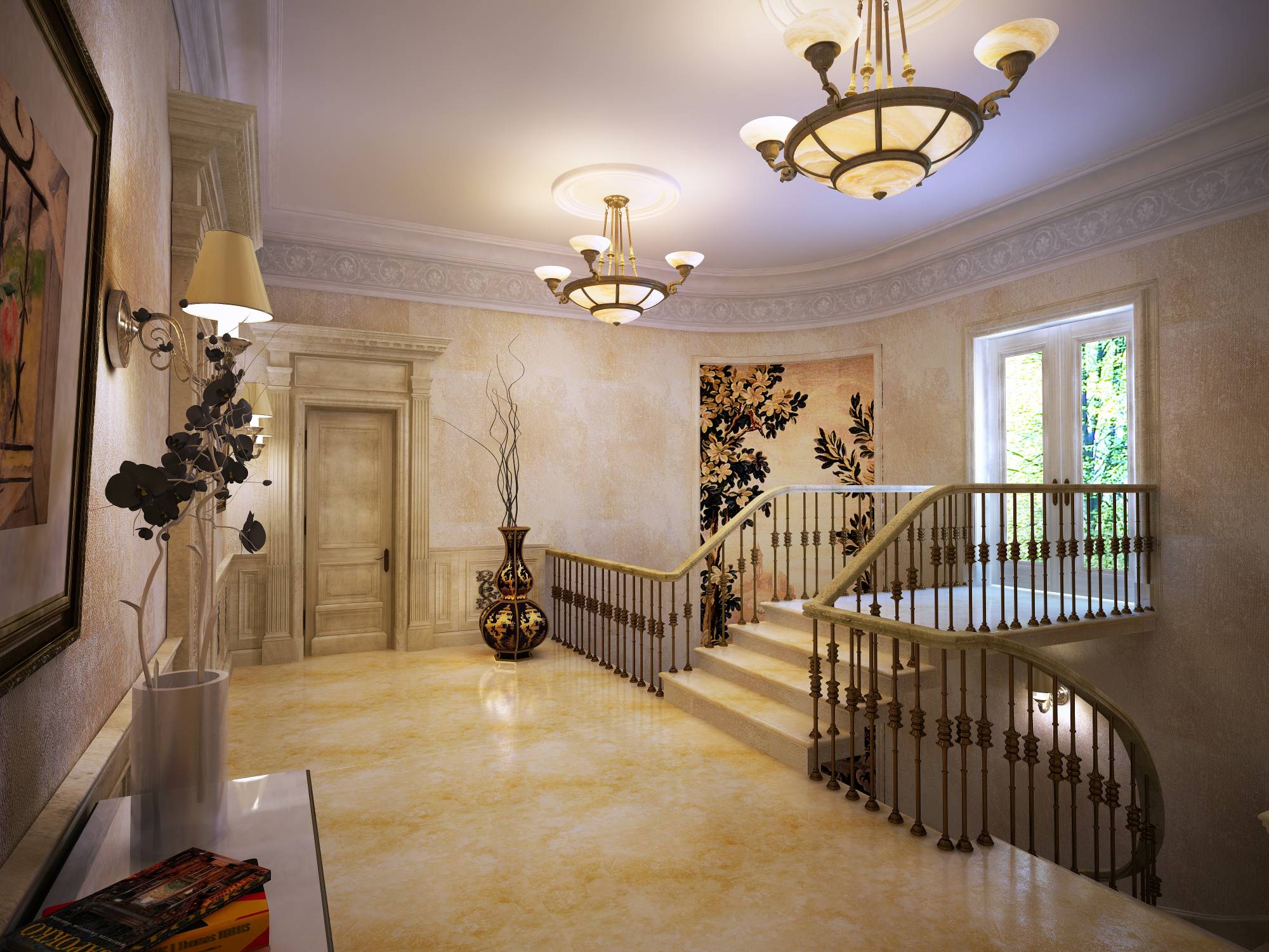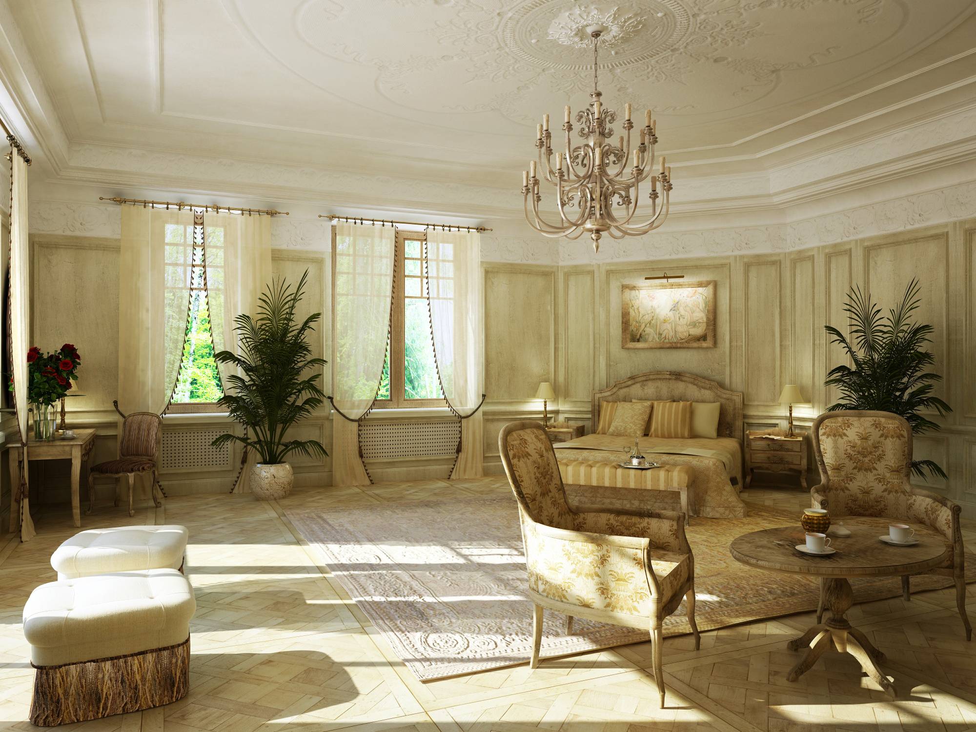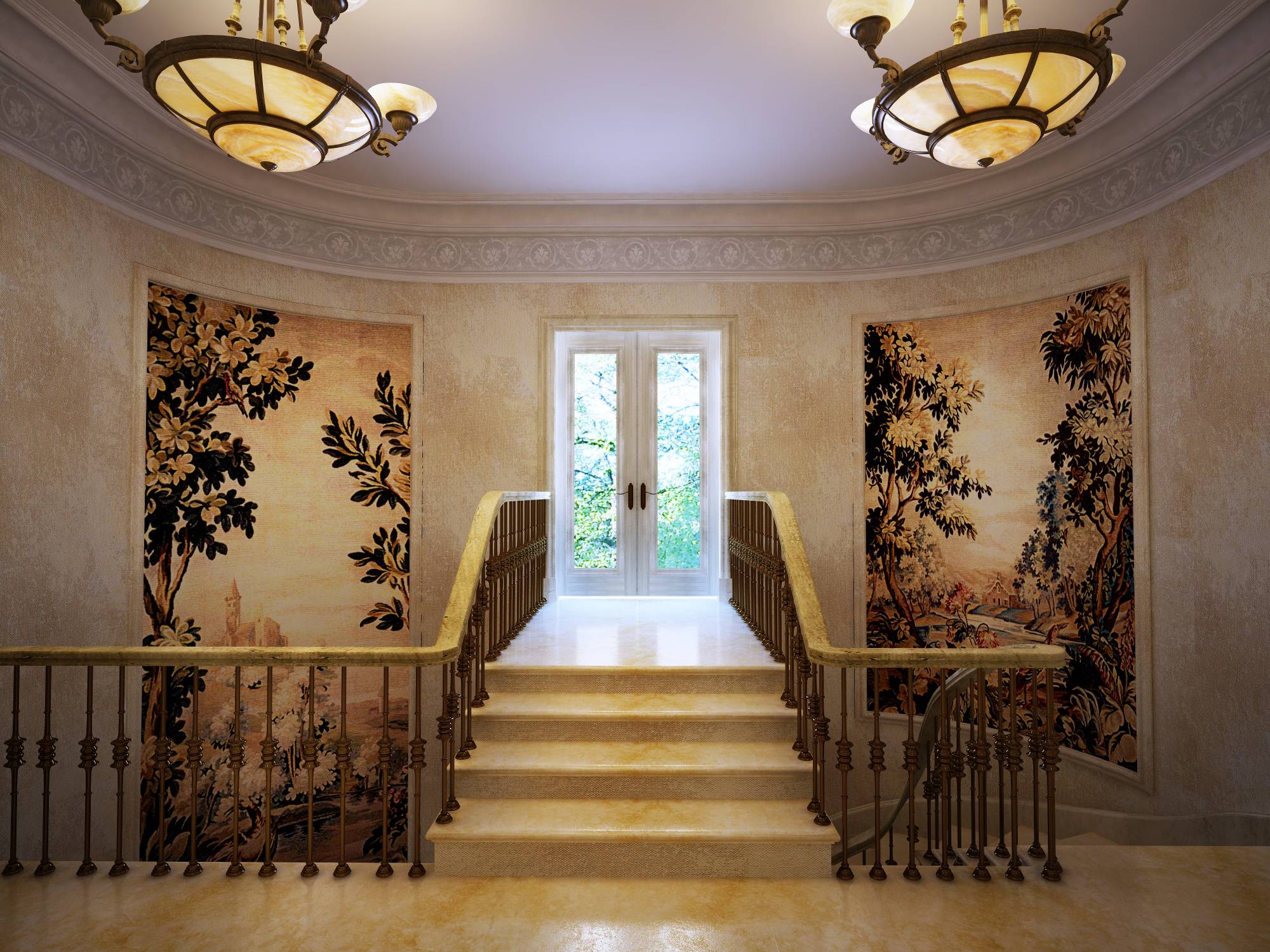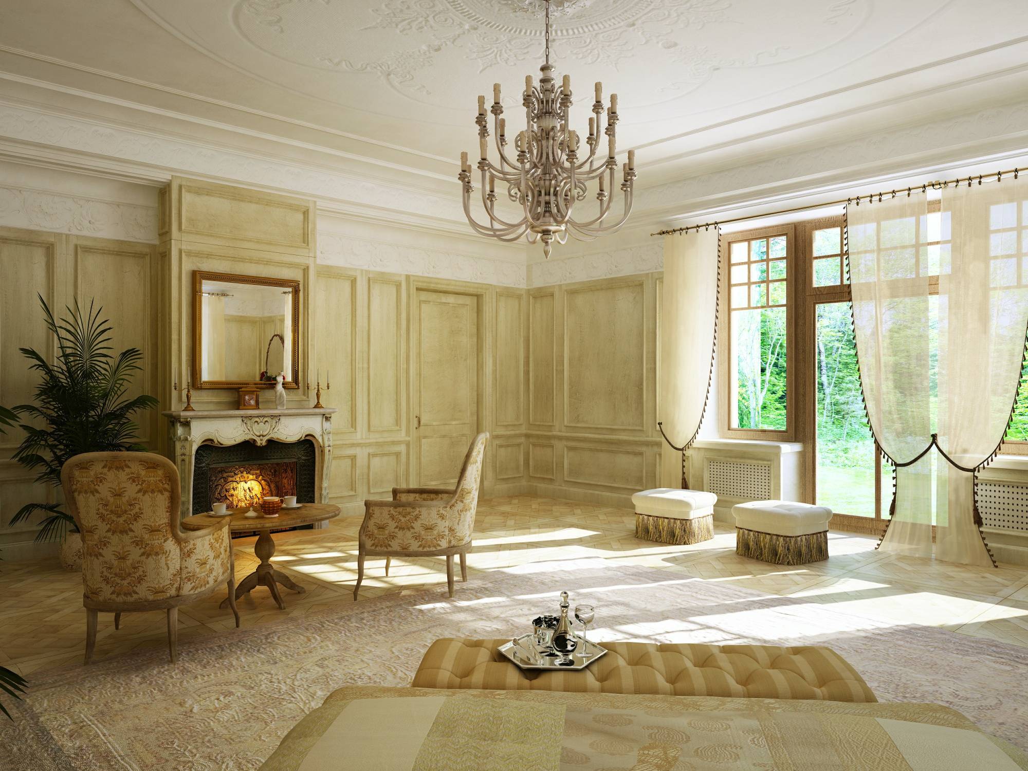 У торцевого окна организована еще одна потрясающая диванная группа, а угол отведен каминной зоне. В основе цветовой гаммы – бежево-серые оттенки стен, потолка и облицованного мрамором пола, в качестве акцентов – винные и изумрудные портьеры.