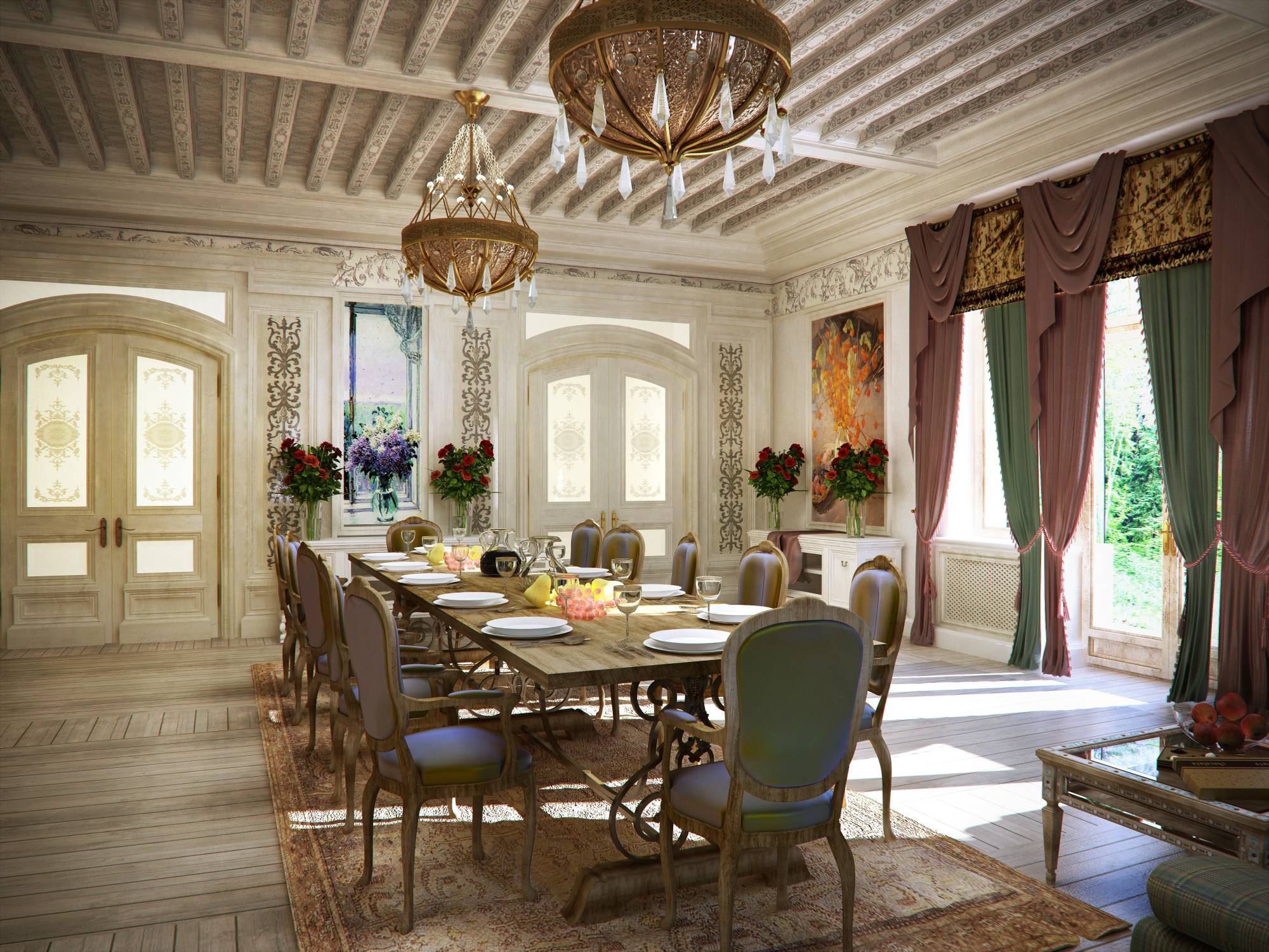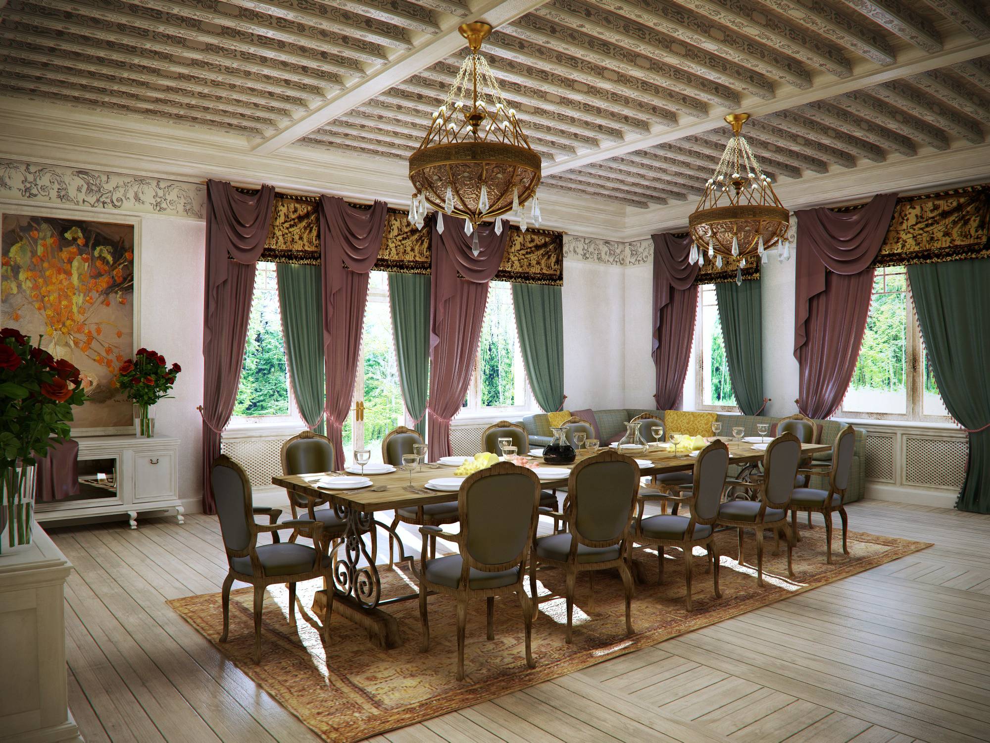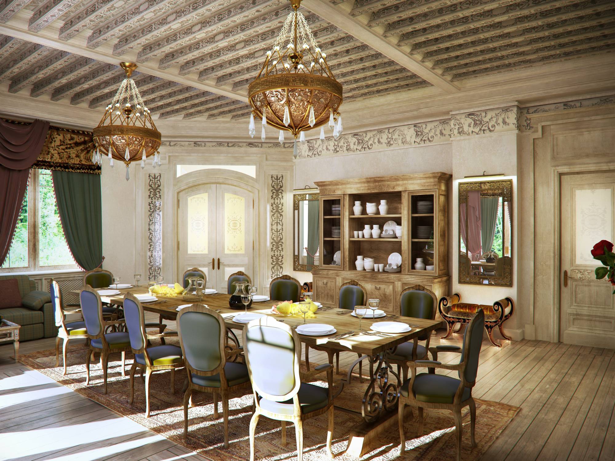 Такой же цветовой ансамбль главенствует в интерьере столовой. Дощатый пол перекликается здесь с многочисленными потолочными балками, патинированная мебель отлично вписывается в атмосферу аристократичной старины.