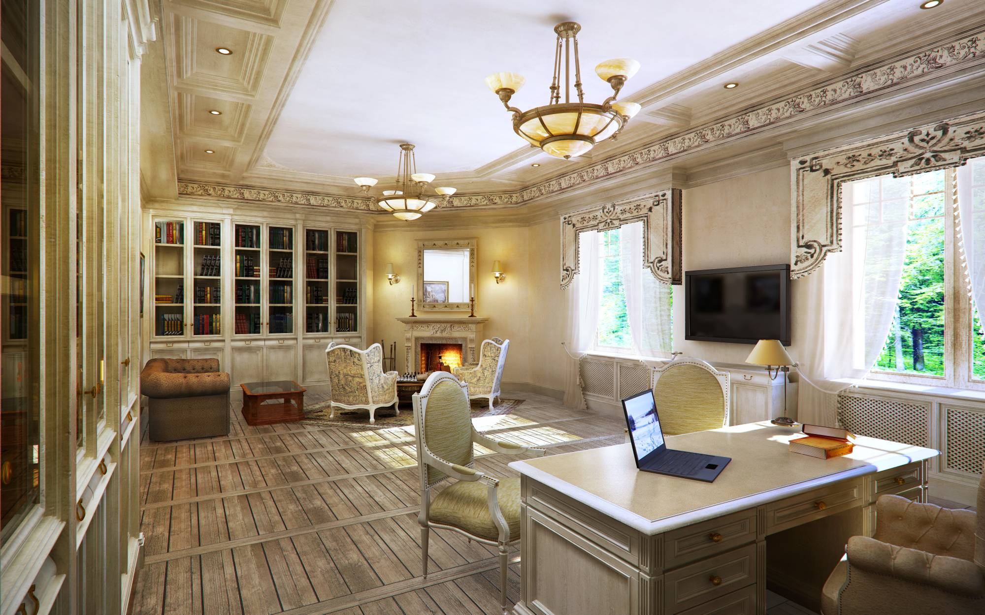 В этом же духе выдержан и бесподобный дизайн кабинета. Рабочее пространство организовано у боковой стены, к слову, стены в этом месте полностью заняты книжными стеллажами. Противоположная часть отдана месту для отдыха с камином.