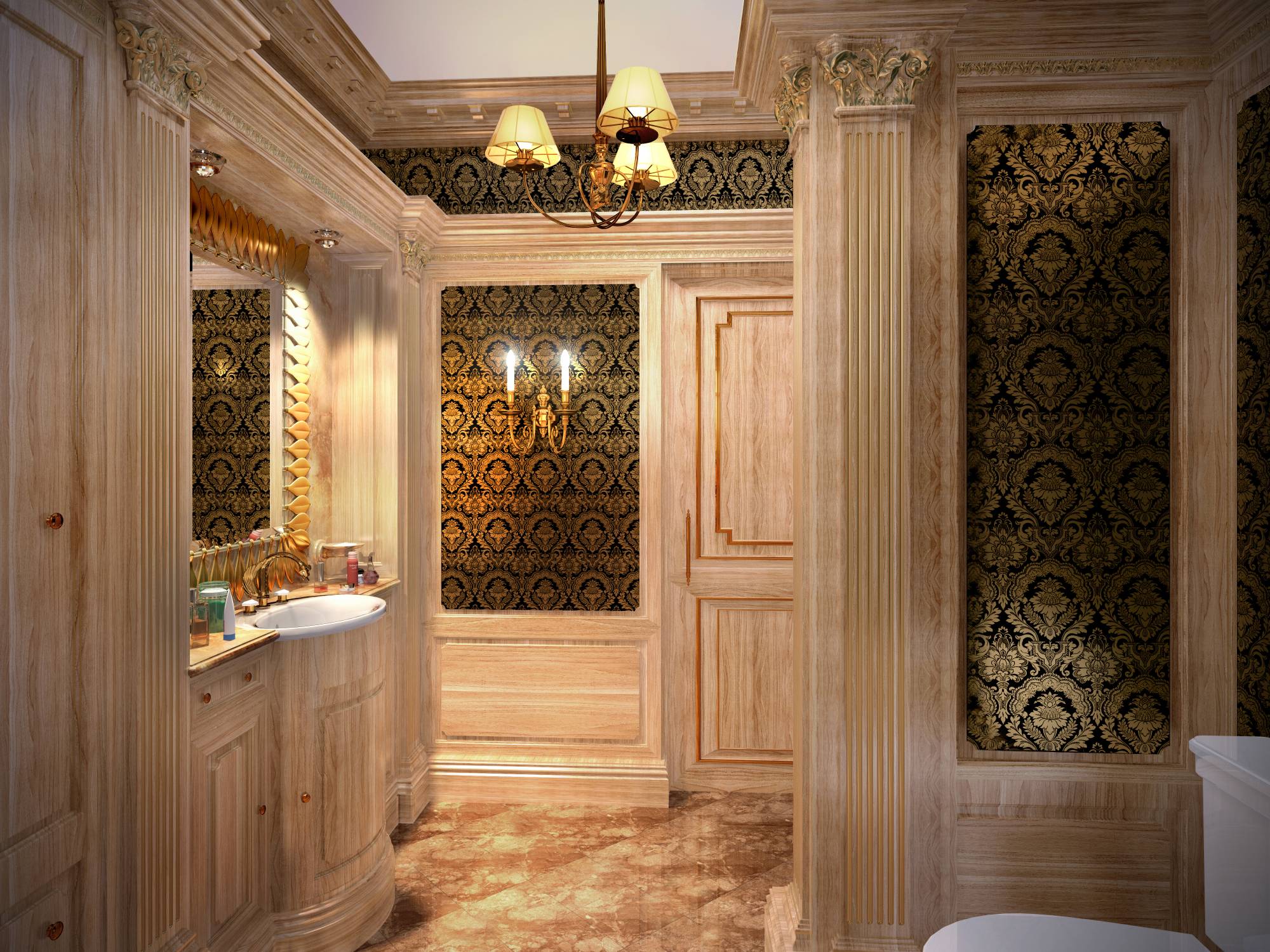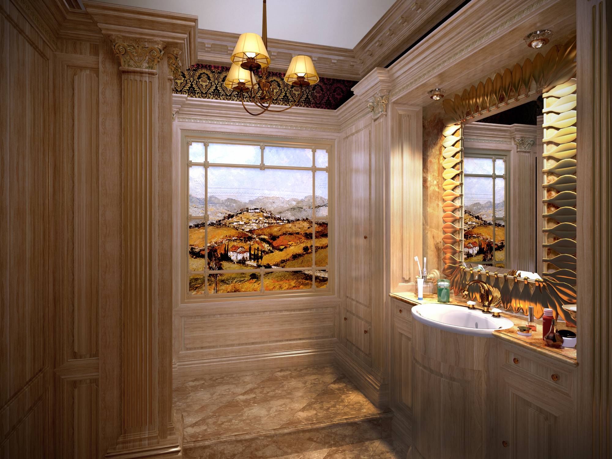 Дизайн санузла выполнен в оттенках слоновой кости. Золотые краски в его гамму вносят настенный витраж, рама зеркала и рисунок обоев, использованных в отделке стен.