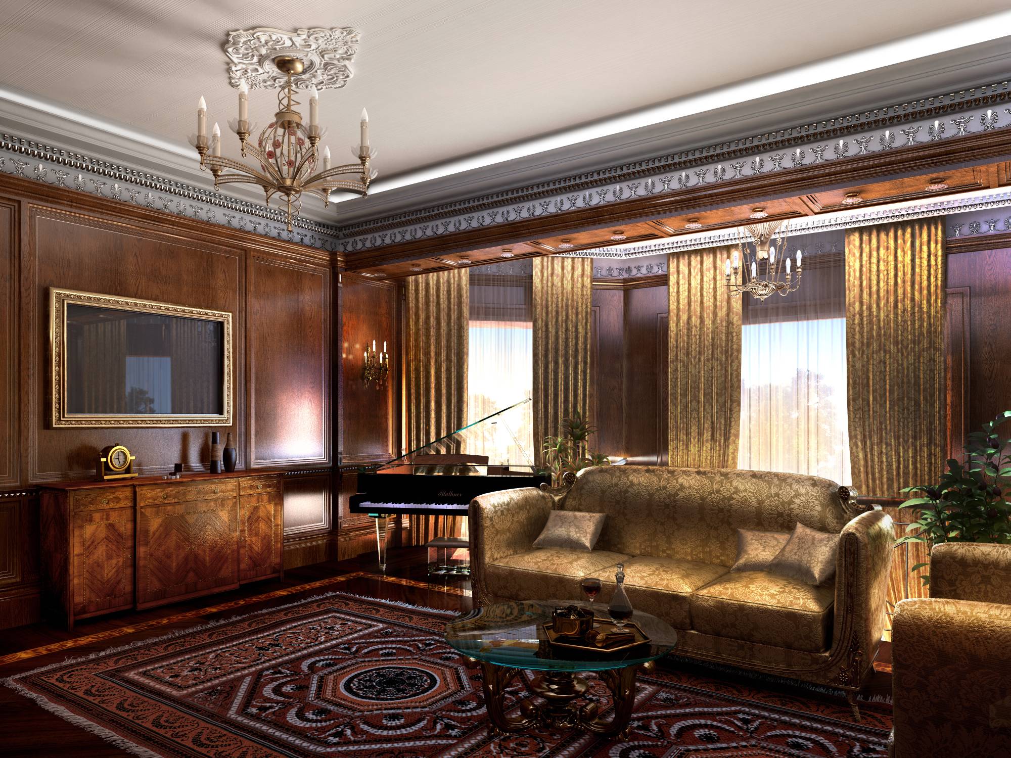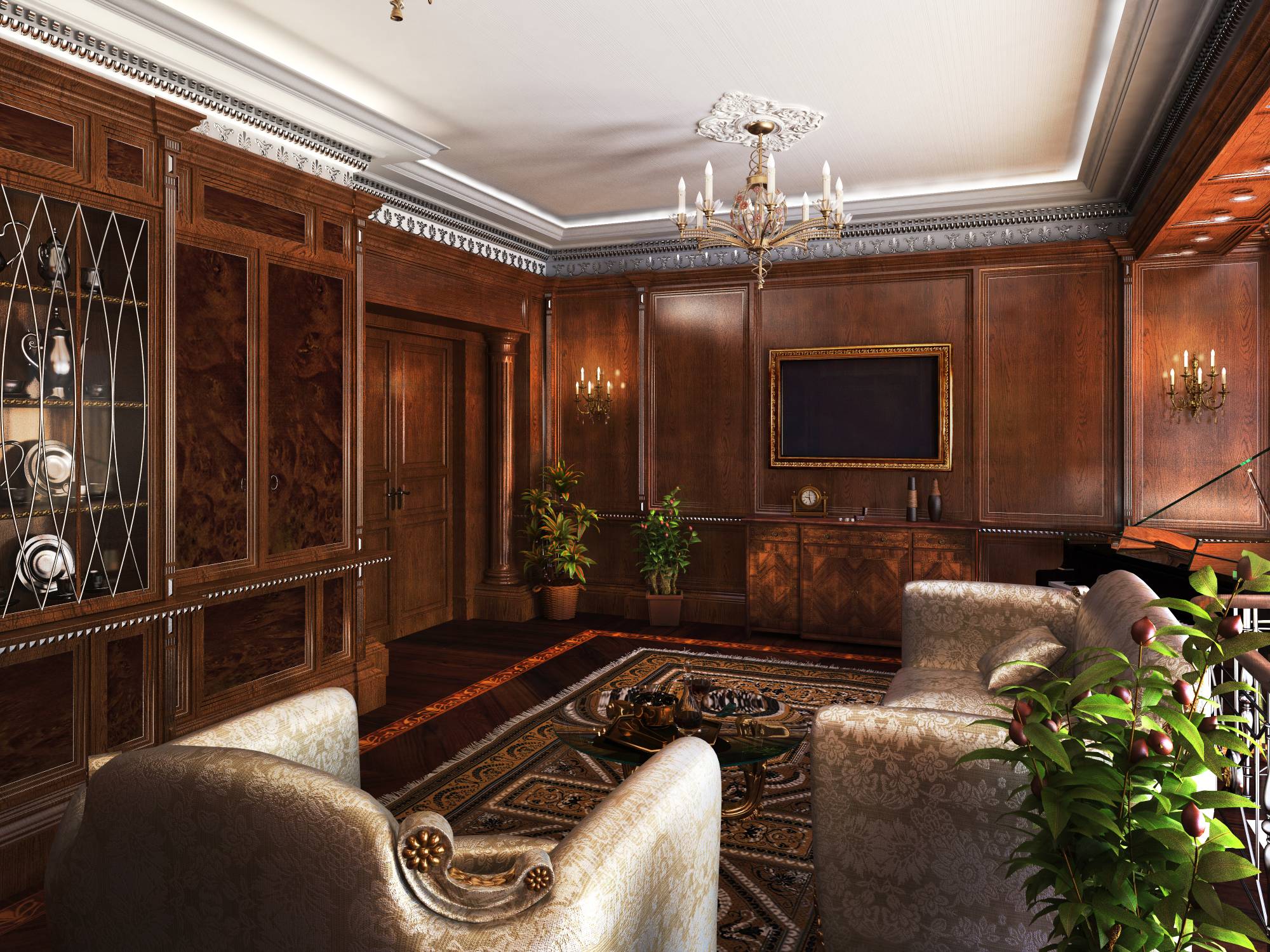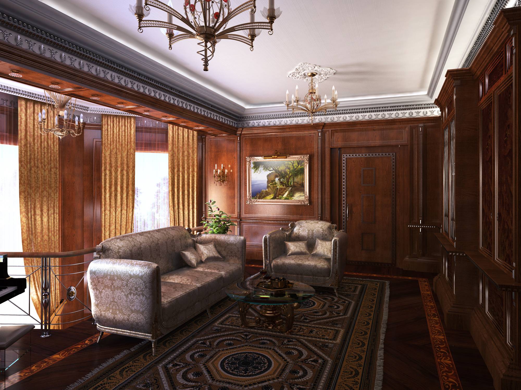 Лестница, поднимающаяся вдоль эркерных окон на верхний уровень, ведет в гостиную. В центре комнаты, спинкой к перилам, установлен диван с роскошной серебристой обивкой. Диванная группа дополняется креслом, обращенным к ТВ-зоне. Справа от этой зоны, перед одним из двусветных эркерных окон расположился рояль.