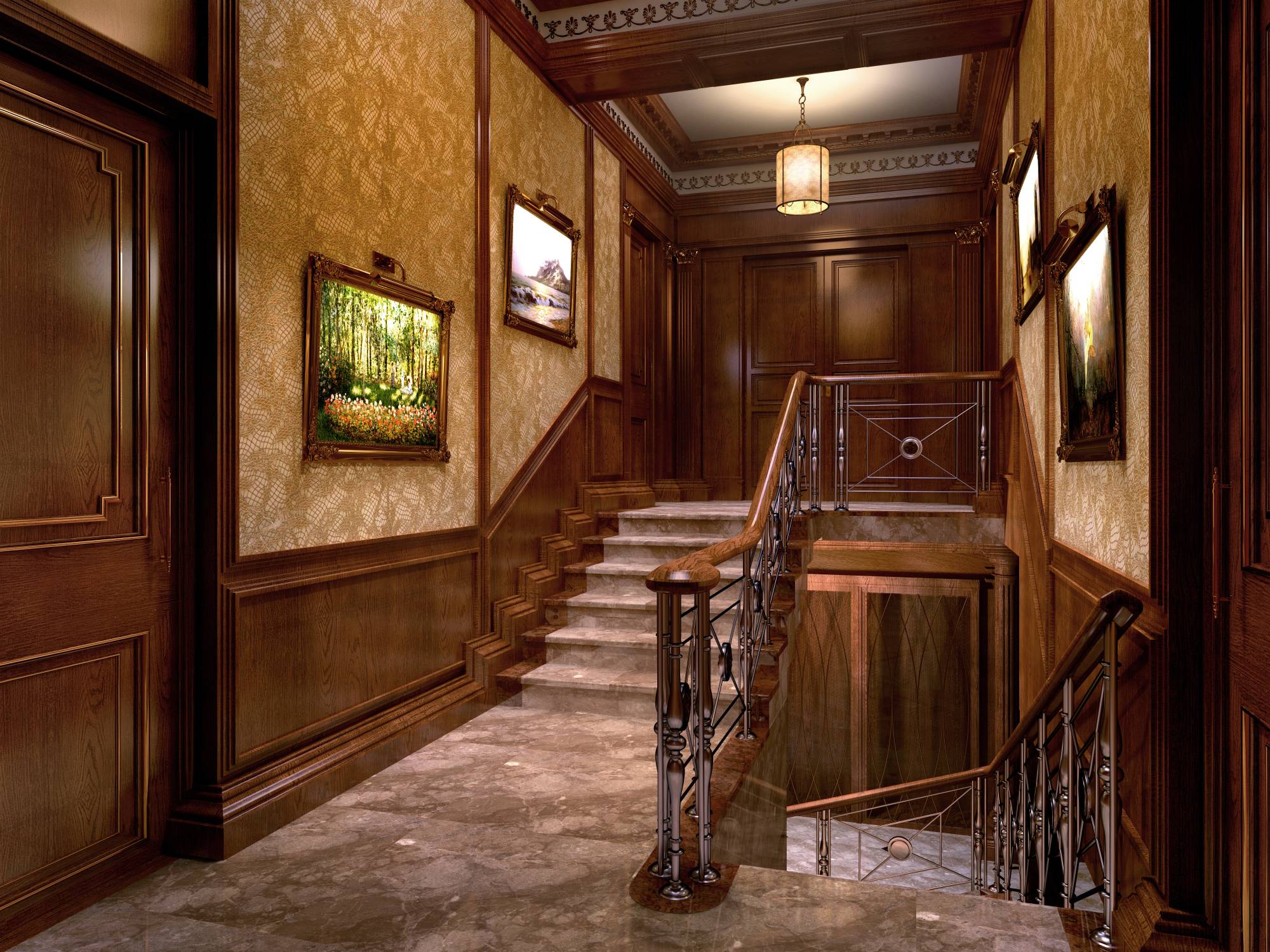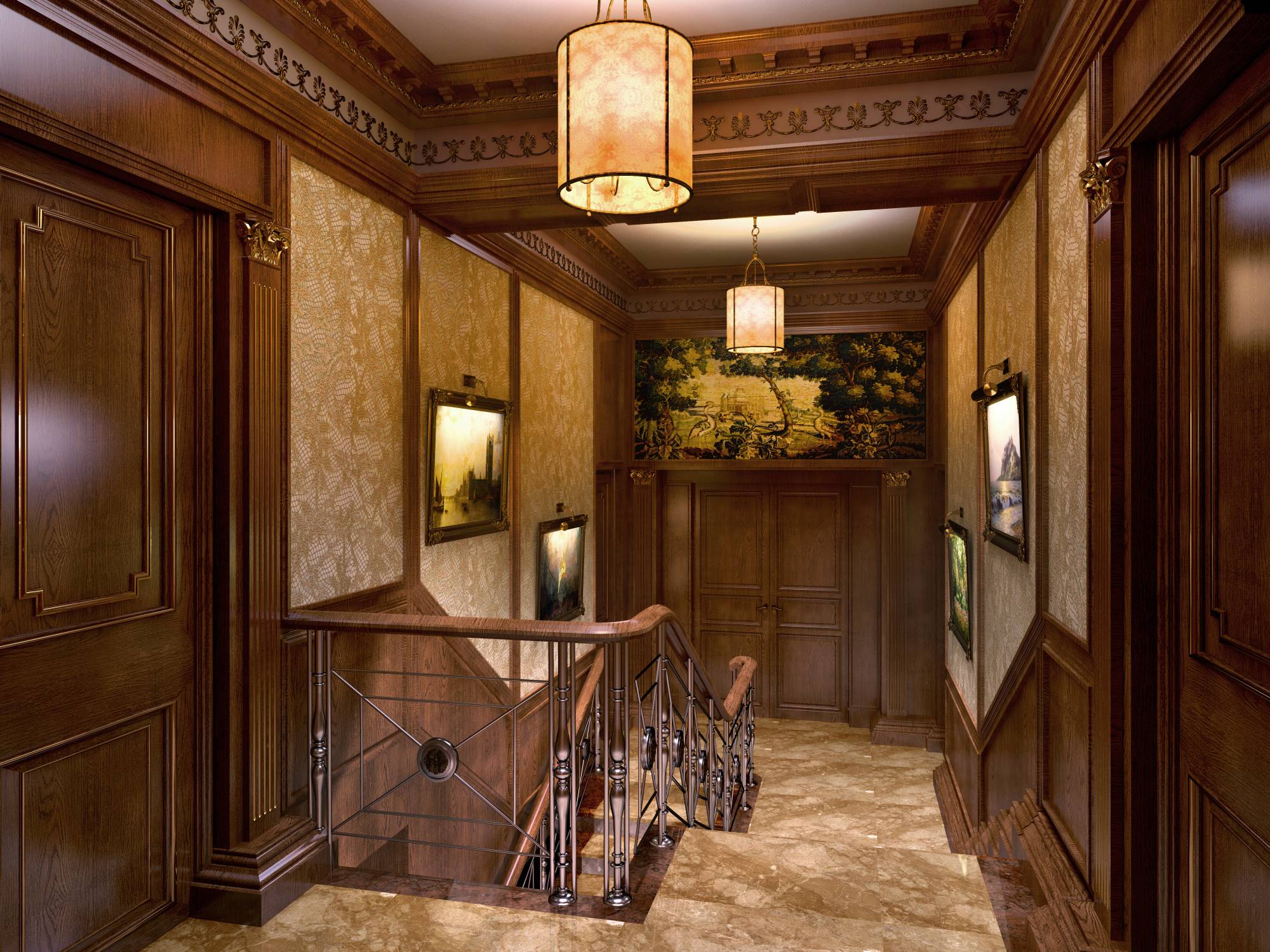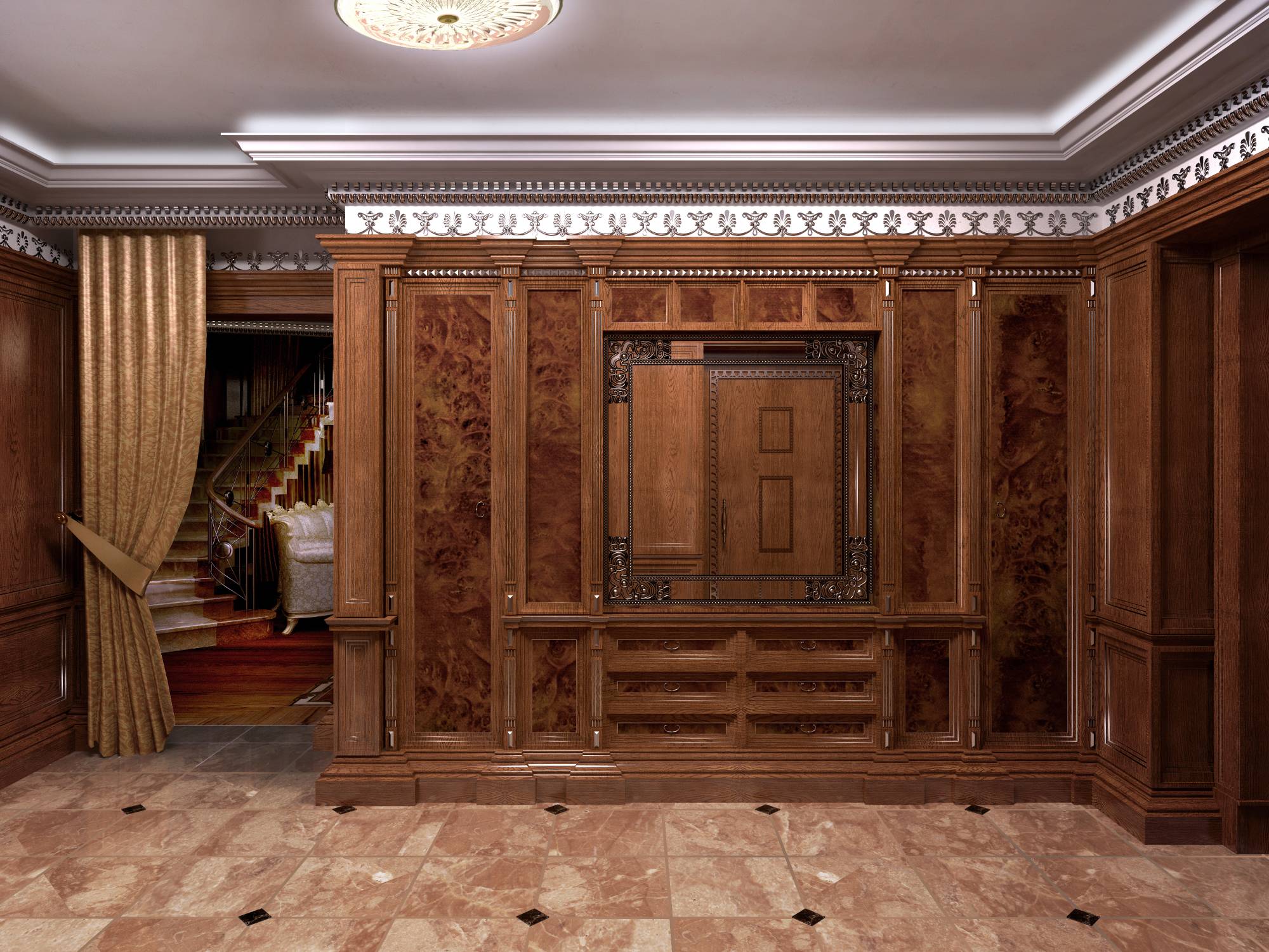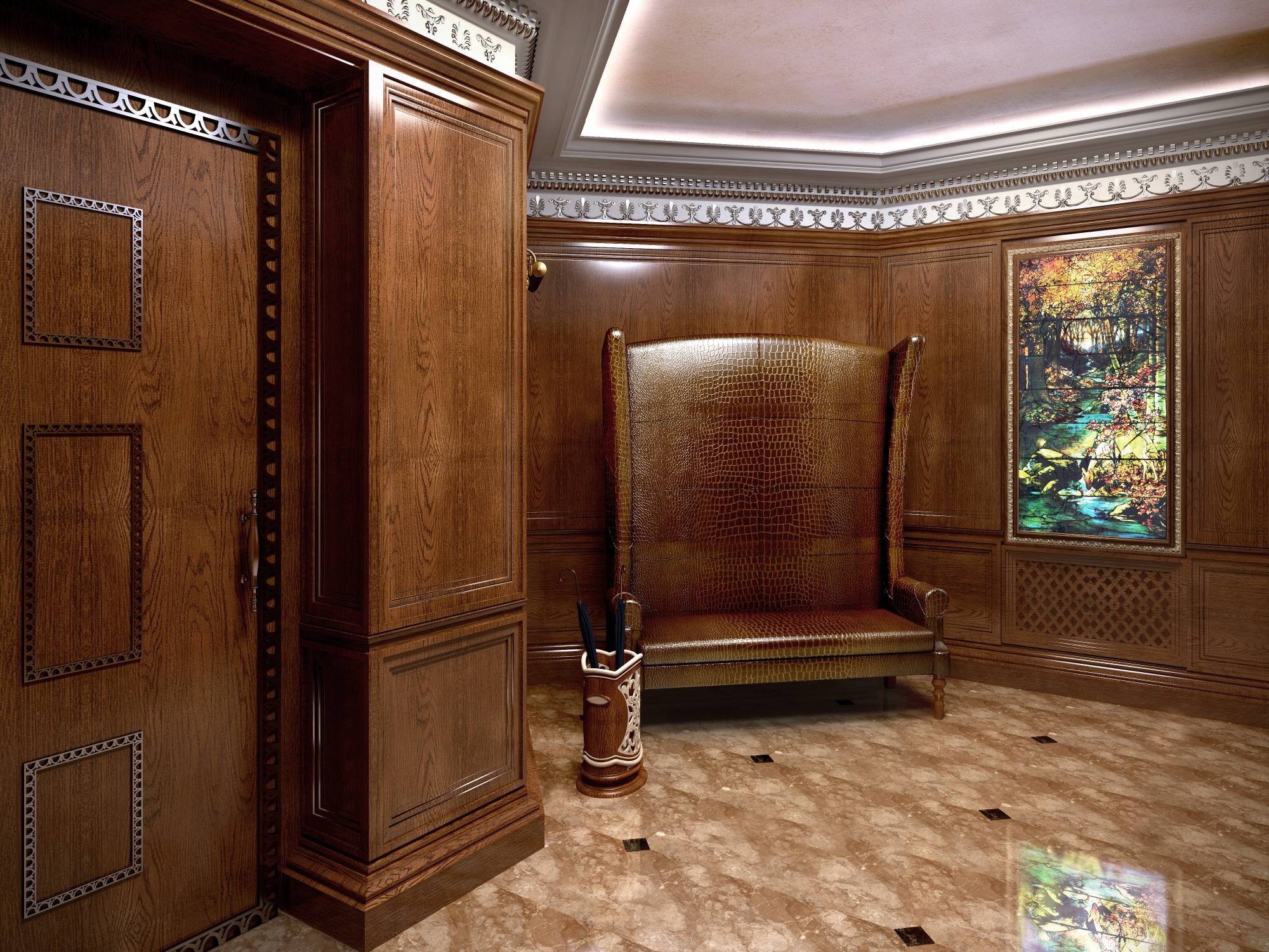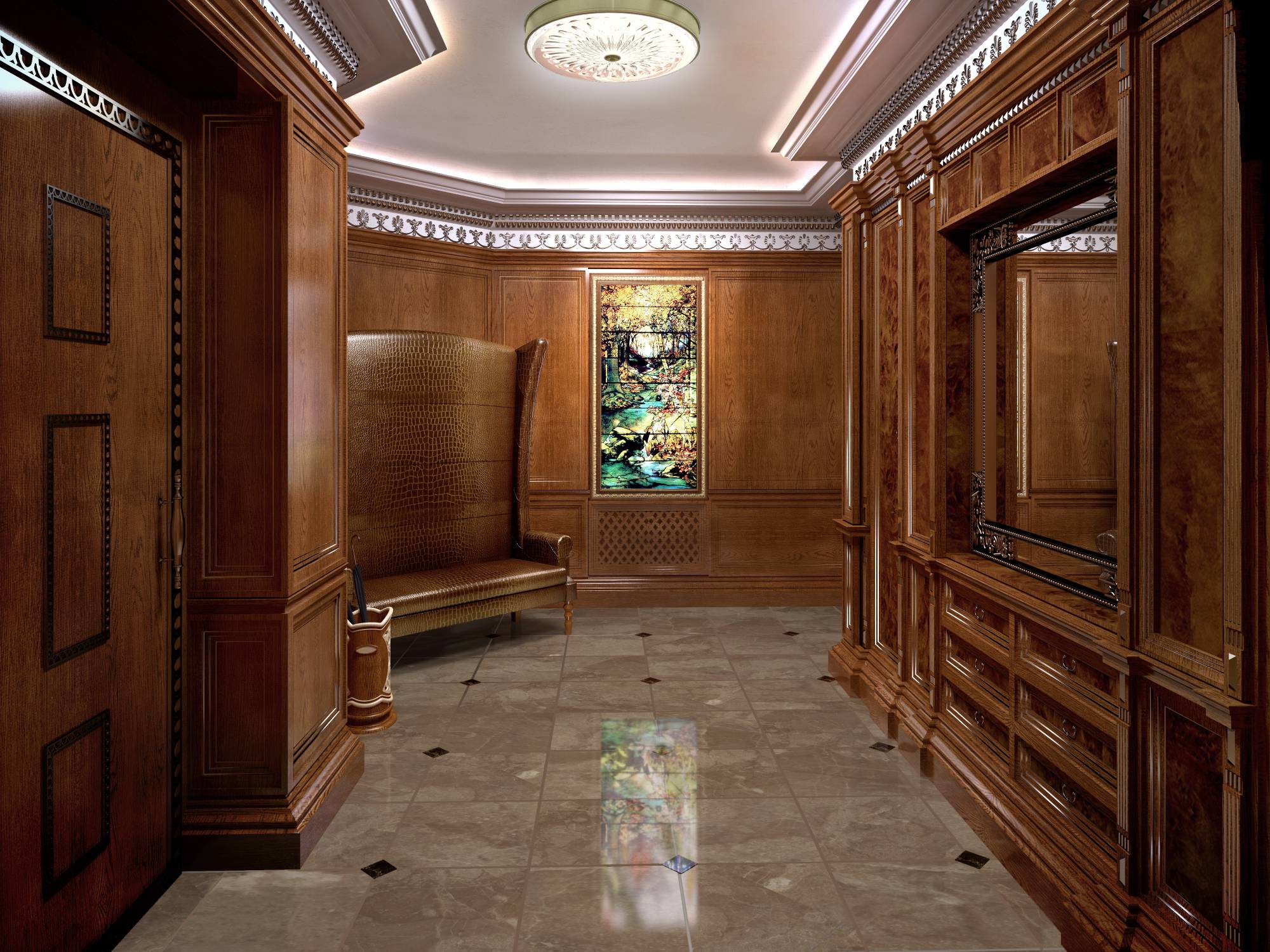 Оформление прихожей учитывает сложную планировку этого помещения. В угловом выступе размещается кожаный диван с высокой спинкой. Стена напротив входа украшена витражным окном, ярким колористическим пятном подчеркнувшим темно-коричневую гамму настенных панелей. Как и во всем интерьере, обшитые деревянными панелями стены дополняются здесь лакированными вставками, выделенными четкими вертикалями пилястр.