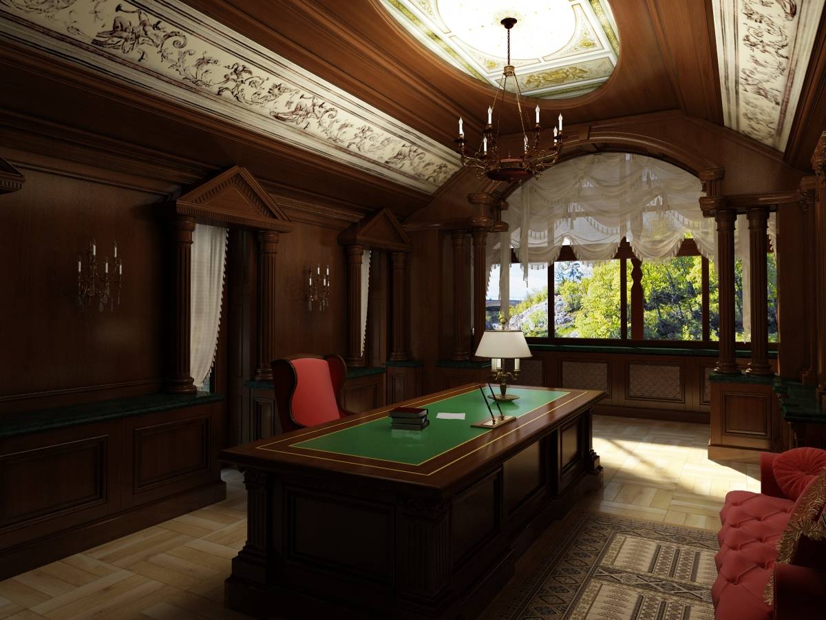 Английский стиль в интерьере кабинета продолжен с ведущими в оформлении мотивами. Деревянными панелями здесь обшиты не только стены, но и потолок, акцентированный витражом.