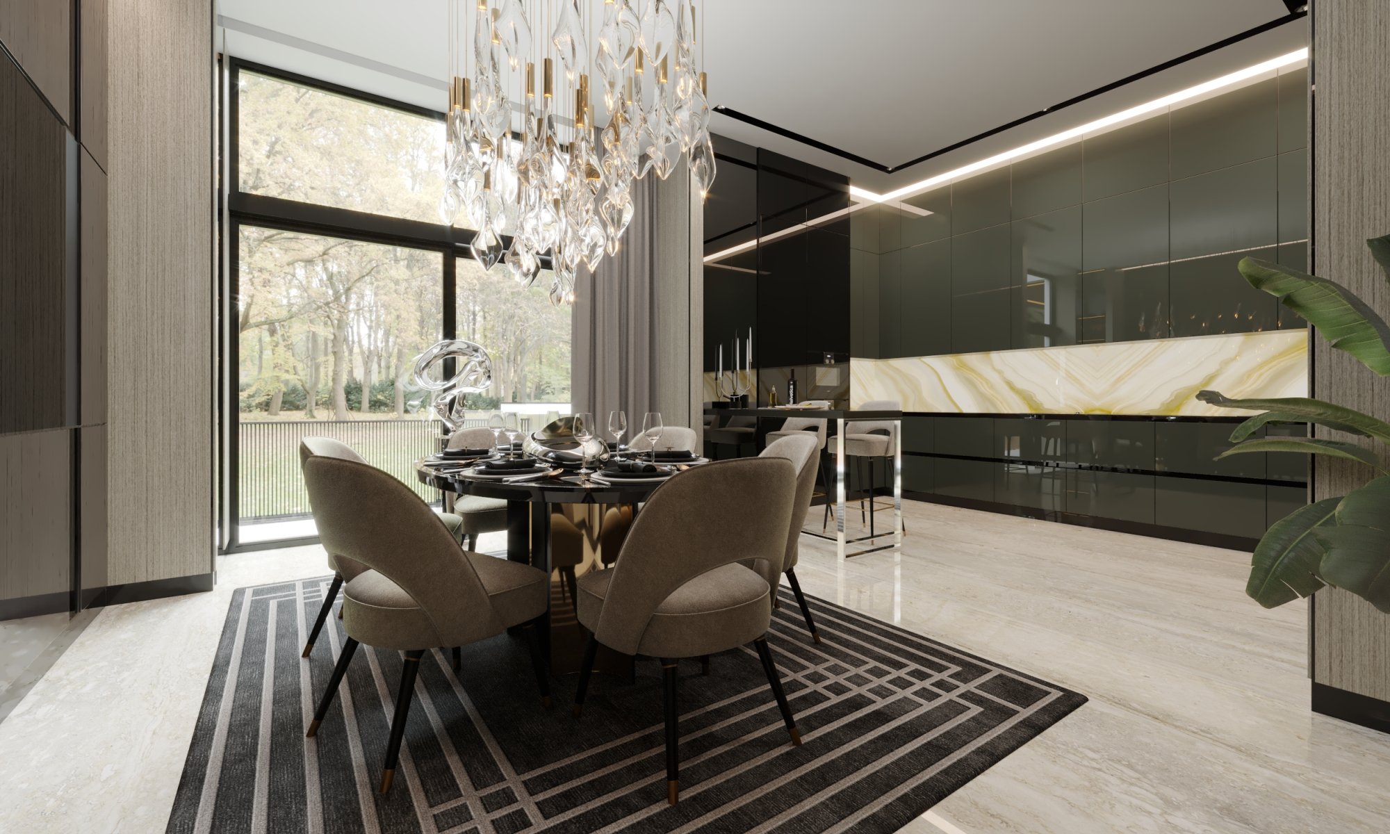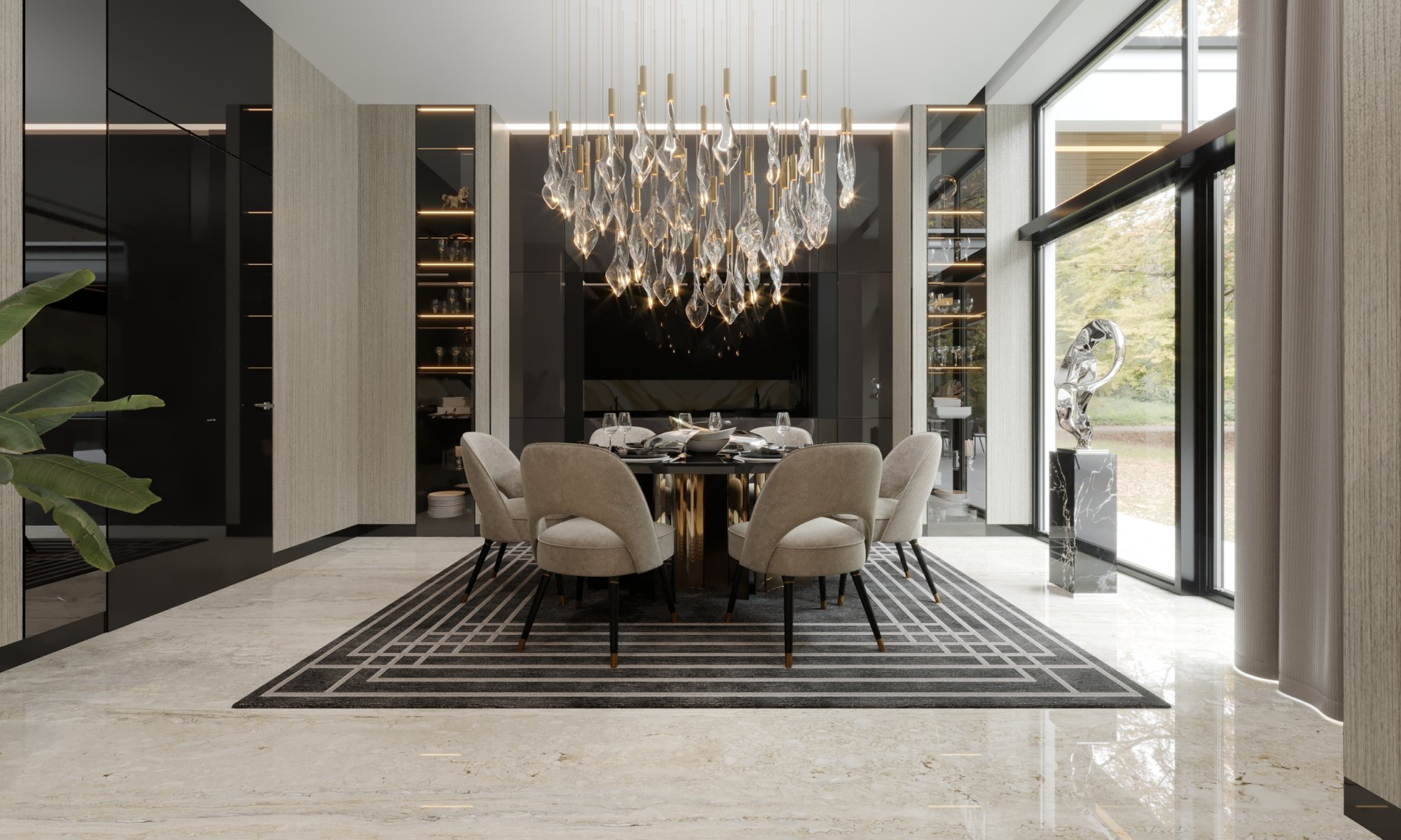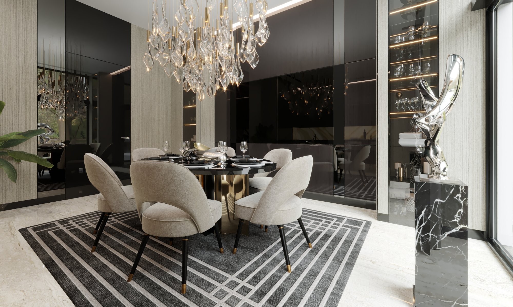 Связь через нейтральный оттенок — еще один прием, который отлично работает в контрастных интерьерах. Насыщенная пара выглядит необычайно эффектно на общем строго нейтральном фоне, и при этом разные полутона мирно уживаются рядом, не «съедая» друг друга.
