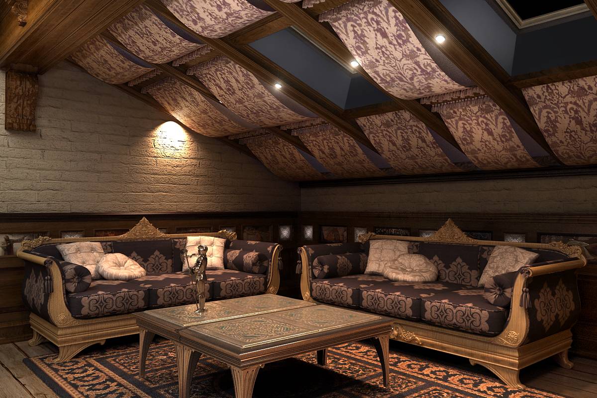 Кровельные скаты отделаны полотнами ткани, создавая впечатление ниспадающих волн. Рисунок ткани подобран в тон диванной обивке.