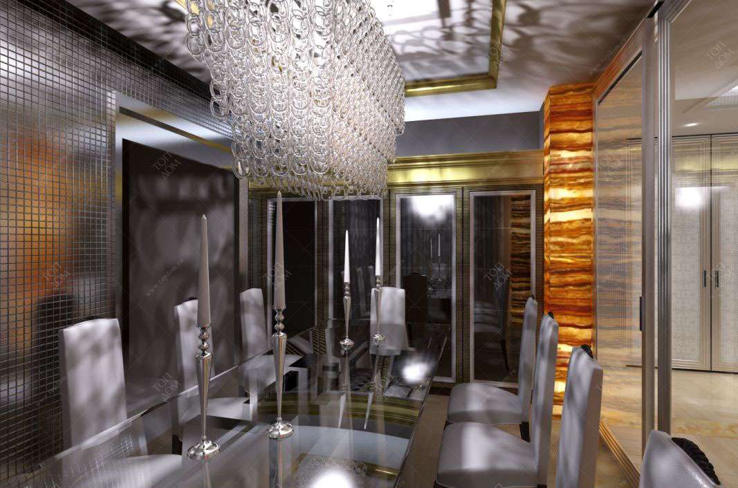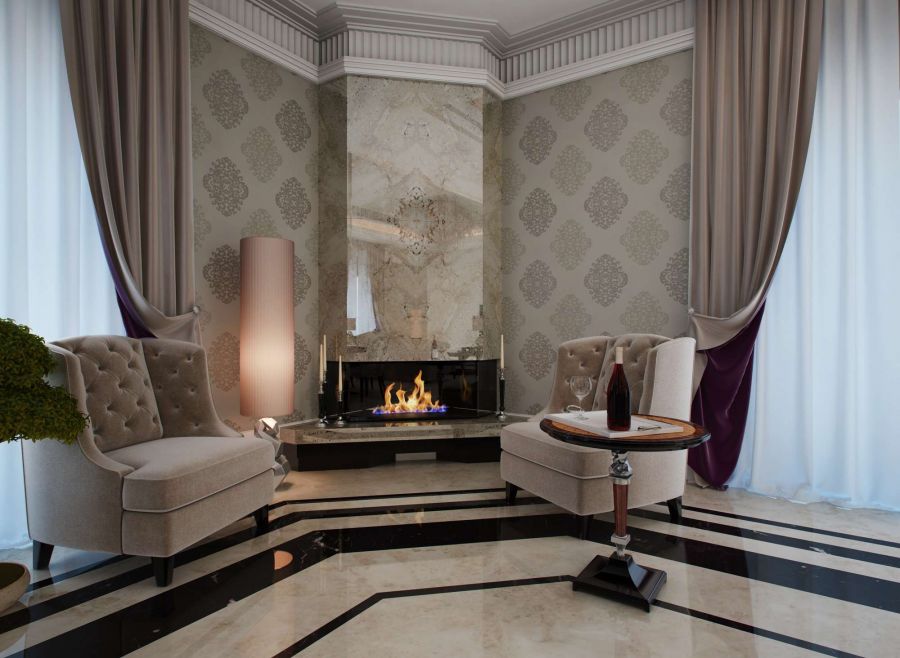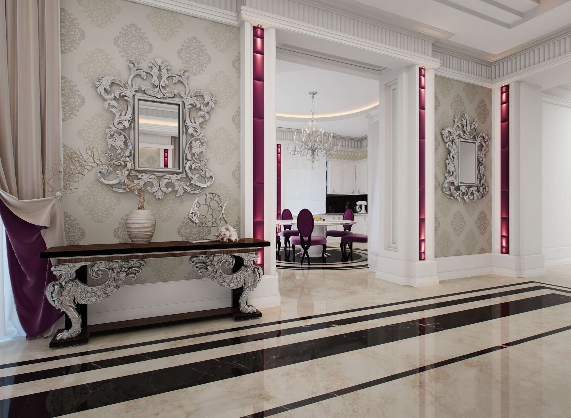 Богатством текстур отличается и проект роскошного дизайна интерьера квартиры в стиле арт-деко. Здесь комбинируются матовые, глянцевые и зеркальные плиты, витражный потолок, колонны из оникса, ромбовидный рельеф на дверях, позолоченные рамы и серебристая мозаика.