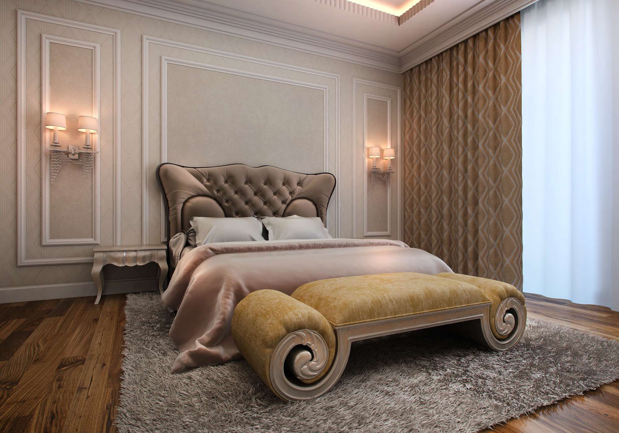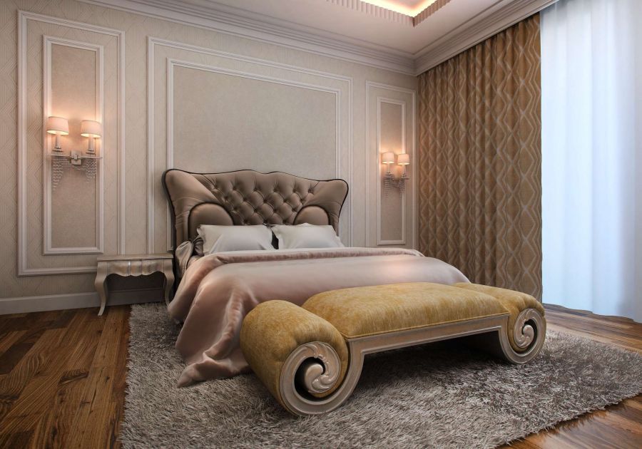 В сдержанном оформлении спальни преобладают оттенки беж, слоновой кости, мокко. Главный акцент сделан на роскошной меблировке. Двуспальная кровать украшена большим фигурным изголовьем с каретной стяжкой. В изножье установлена банкетка со спиральными валиками-опорами. В практически монохромную обстановку вносят разнообразие шторы с геометрическим рисунком и фактурный длинноворсовый ковер.