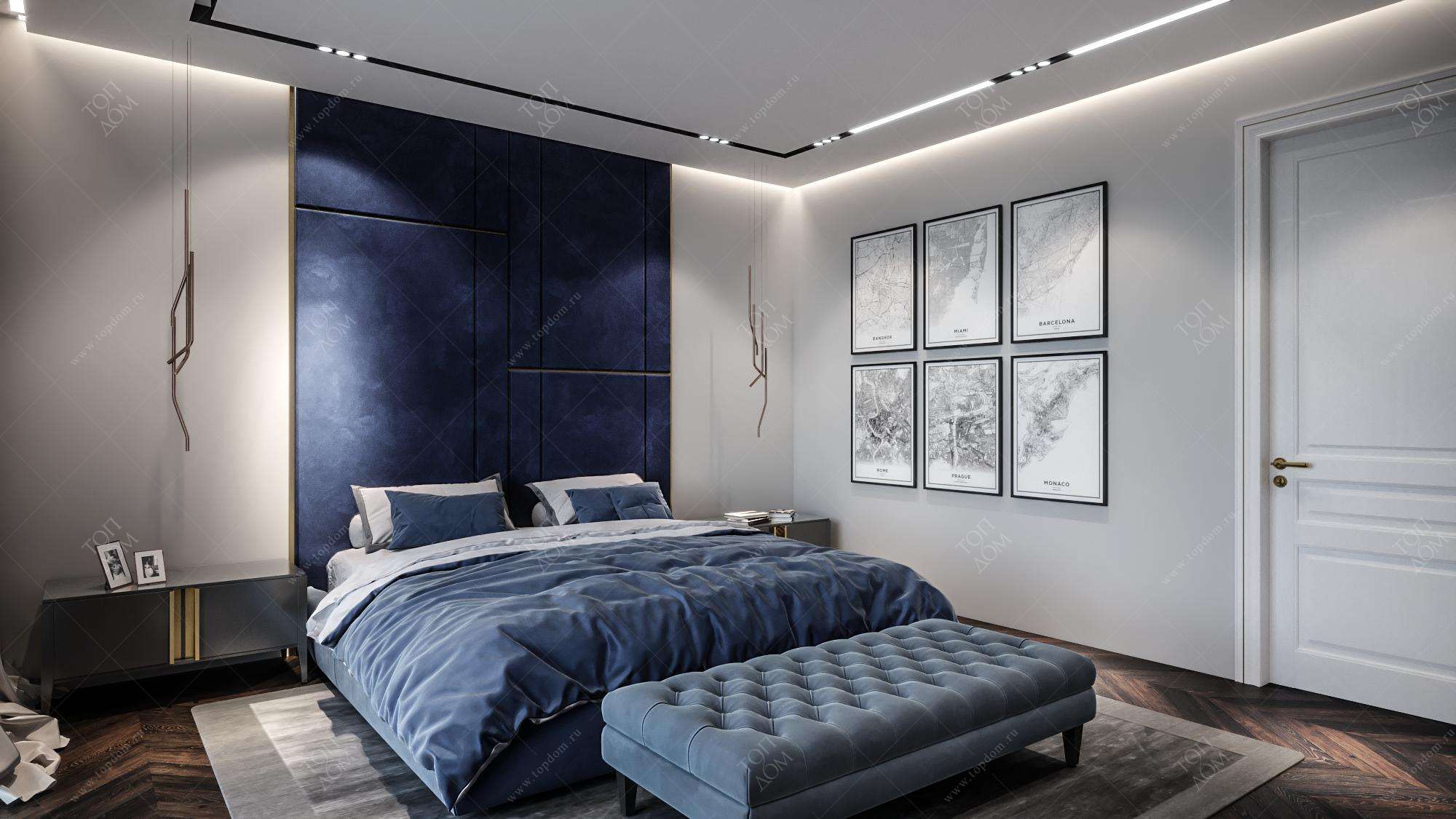 Комната приобретает глубину и красочность, если усилить один из используемых тонов акцентом в виде текстиля, мебели, обоев, постеров. Например, серо-бежевая гамма хозяйской спальни в элегантном дизайне дома сконцентрирована в темно-синем панно-изголовье.