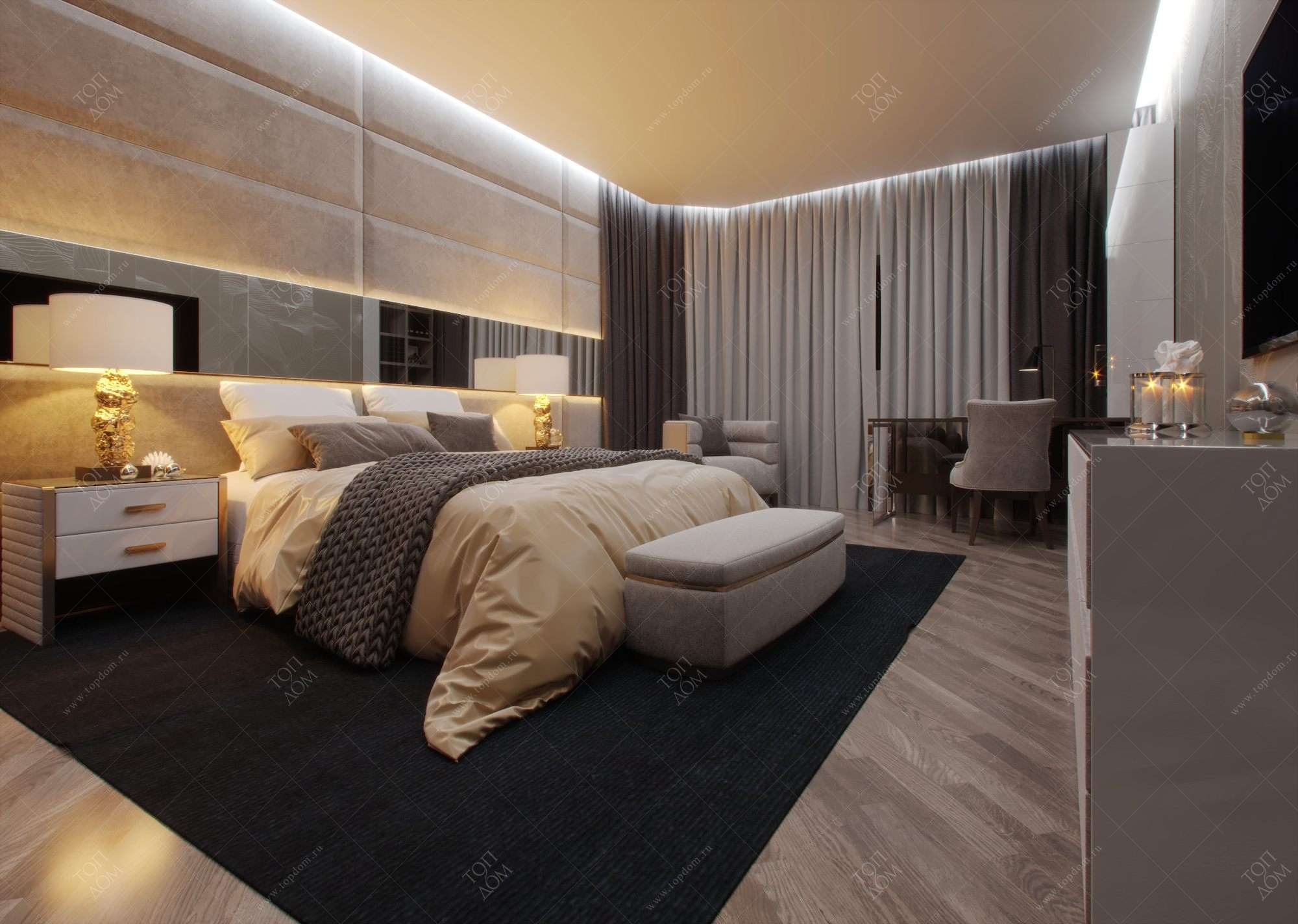 Спокойный интерьер спальни в проекте оформления комнат загородного дома строится на темных насыщенных оттенках деревянного шпона и паркета, изголовье кровати выполнено в виде высокой стеганой панели, по бокам сверкают зеркальные тумбочки, вокруг золотистого журнального столика стоят кресла в бархатной обивке.