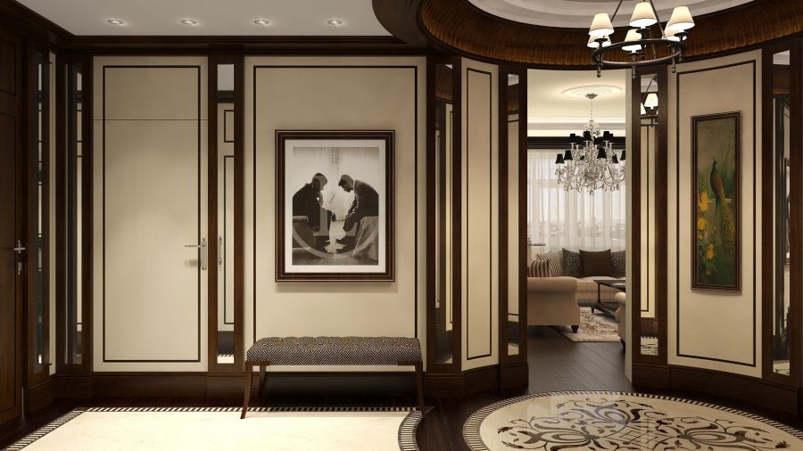 Включение более темных цветов помогает оживить дизайн, когда основная палитра светлая. Варианты: темный корпус мебели со светлой обивкой, багеты картин, контрастные светильники. С задачей великолепно справляется насыщенный цвет мокко в интерьере квартиры, где прихожая отделана панелями оттенка слоновой кости в темном деревянном обрамлении.