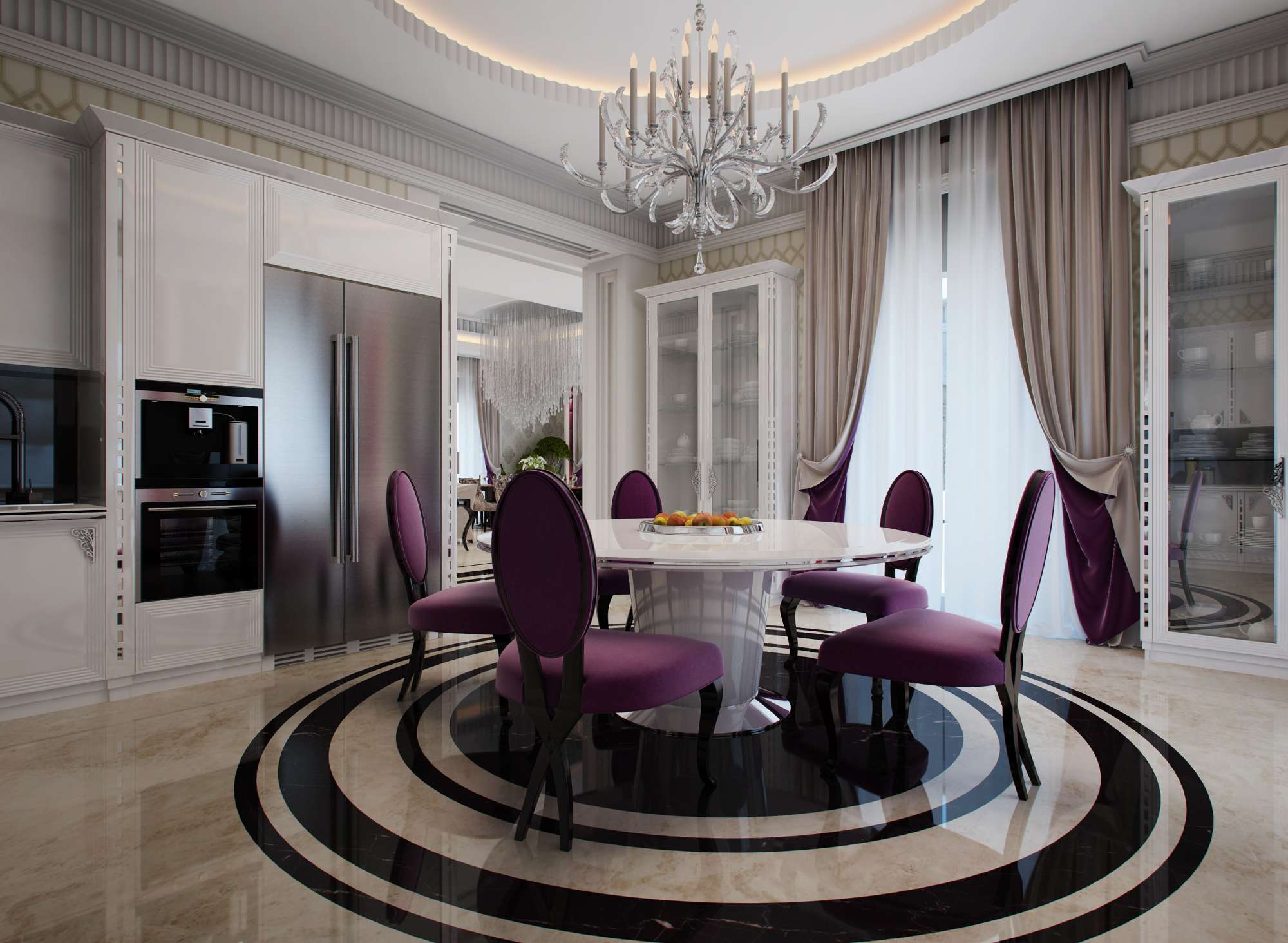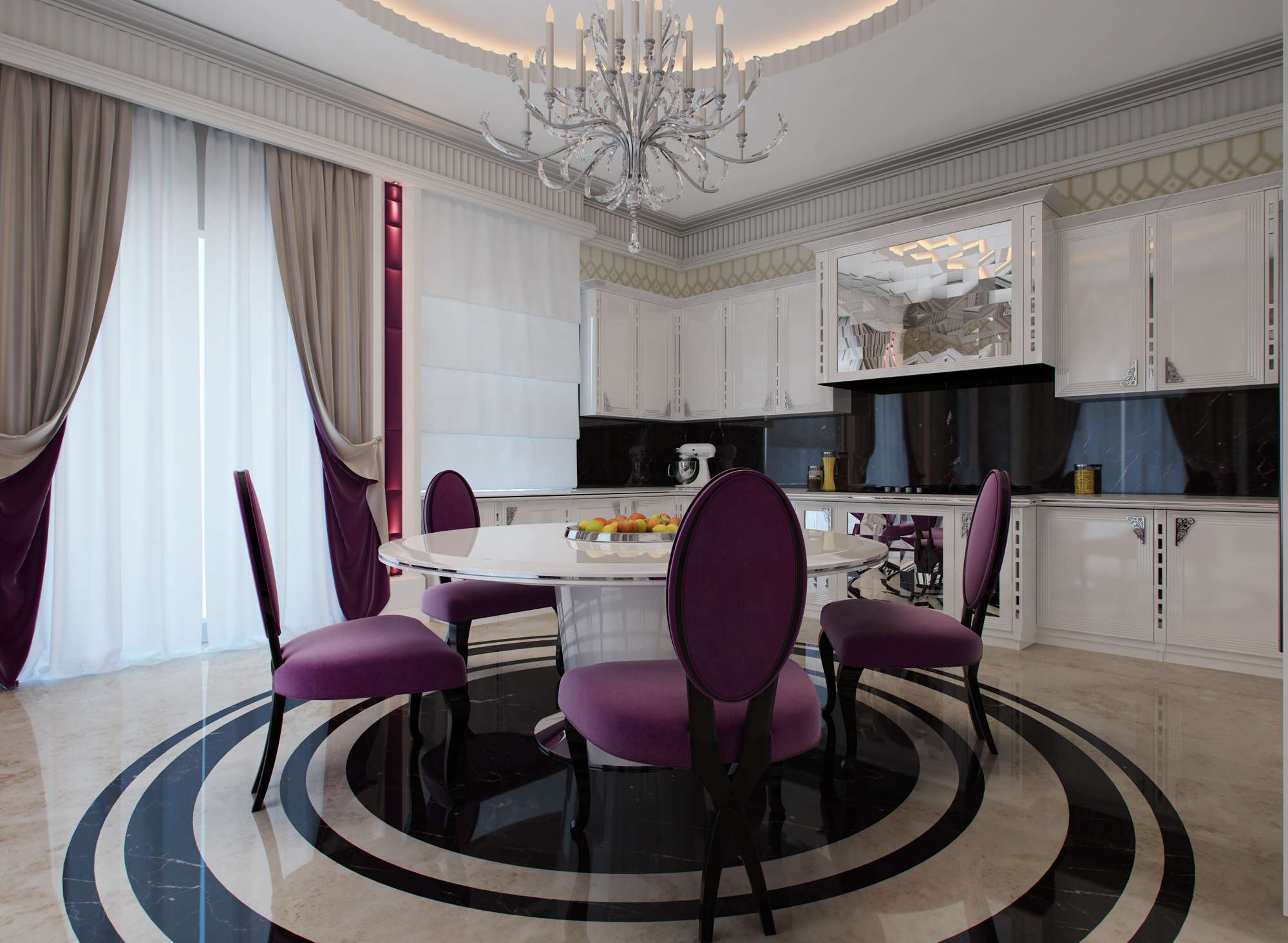 Аналогичные декораторские решения использованы в спокойном интерьере кухни, подчеркивая планировочную связь с общим пространством. Логический центр составляет обеденная группа из белоснежного круглого стола и стульев с лиловой обивкой. Ее композицию поддерживают концентрические круги напольного покрытия и потолочная круглая ниша с подсветкой.