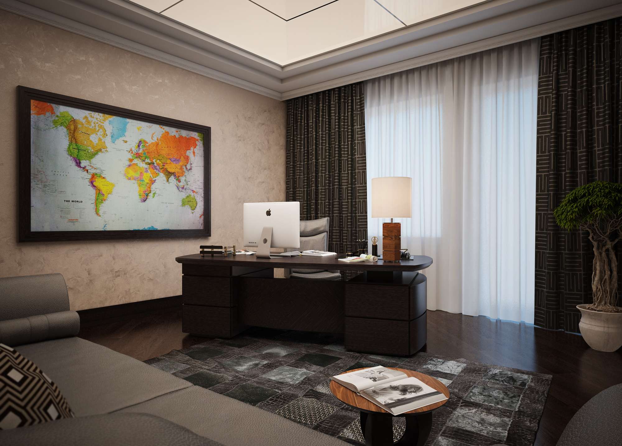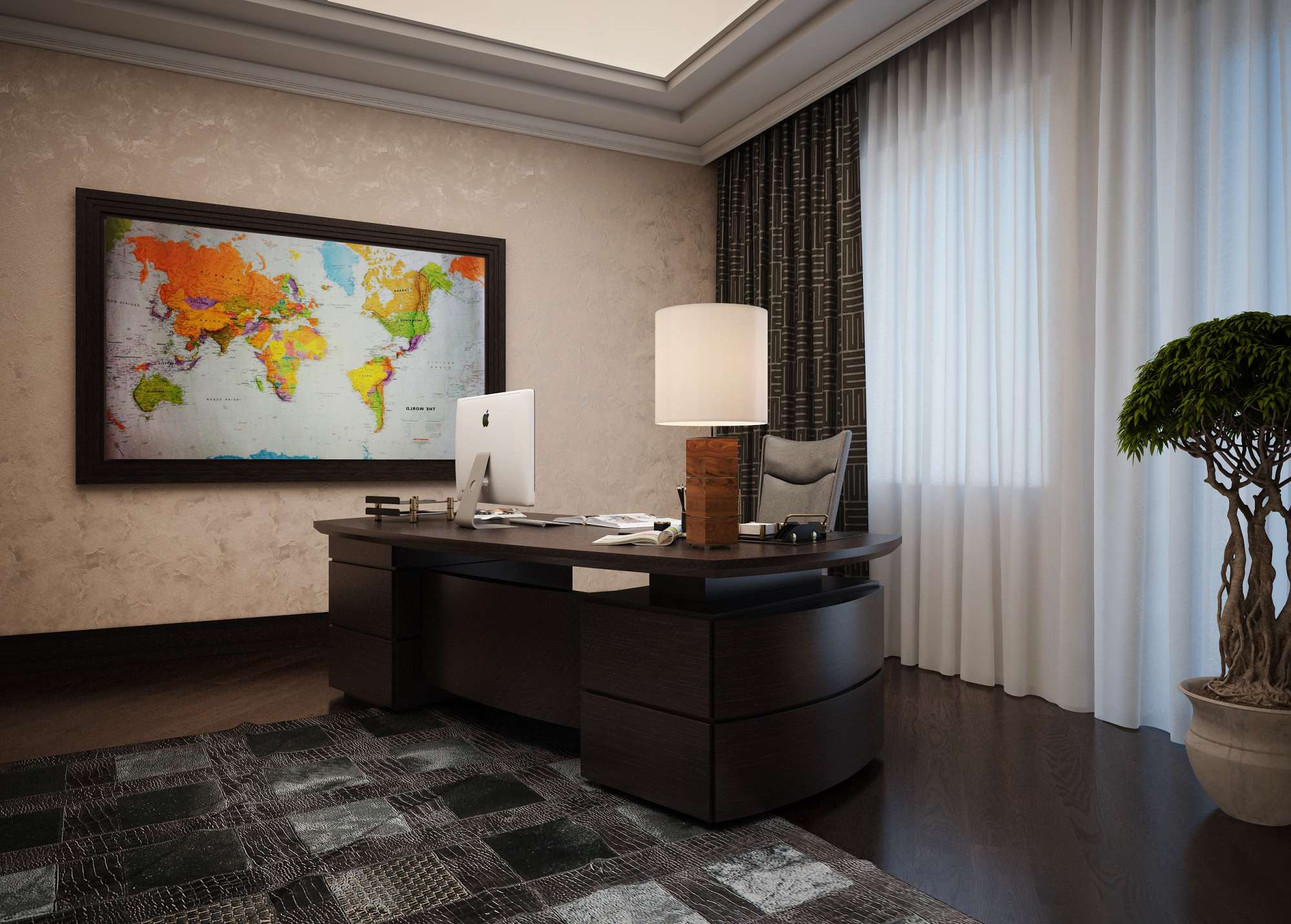 В отделке рабочей комнаты преобладает темное дерево напольного покрытия, книжных шкафов, письменного стола. Роль нейтрального серого цвета-компаньона играют кожаный диван, рабочее кресло, ковер с гламурным эффектом потертости. Функцию яркого декоративного пятна выполняет цветная карта мира в багетном обрамлении. В зависимости от нужной степени насыщенности обстановки стена под картой может быть отделана светлой венецианской штукатуркой или обшита темными деревянными панелями.