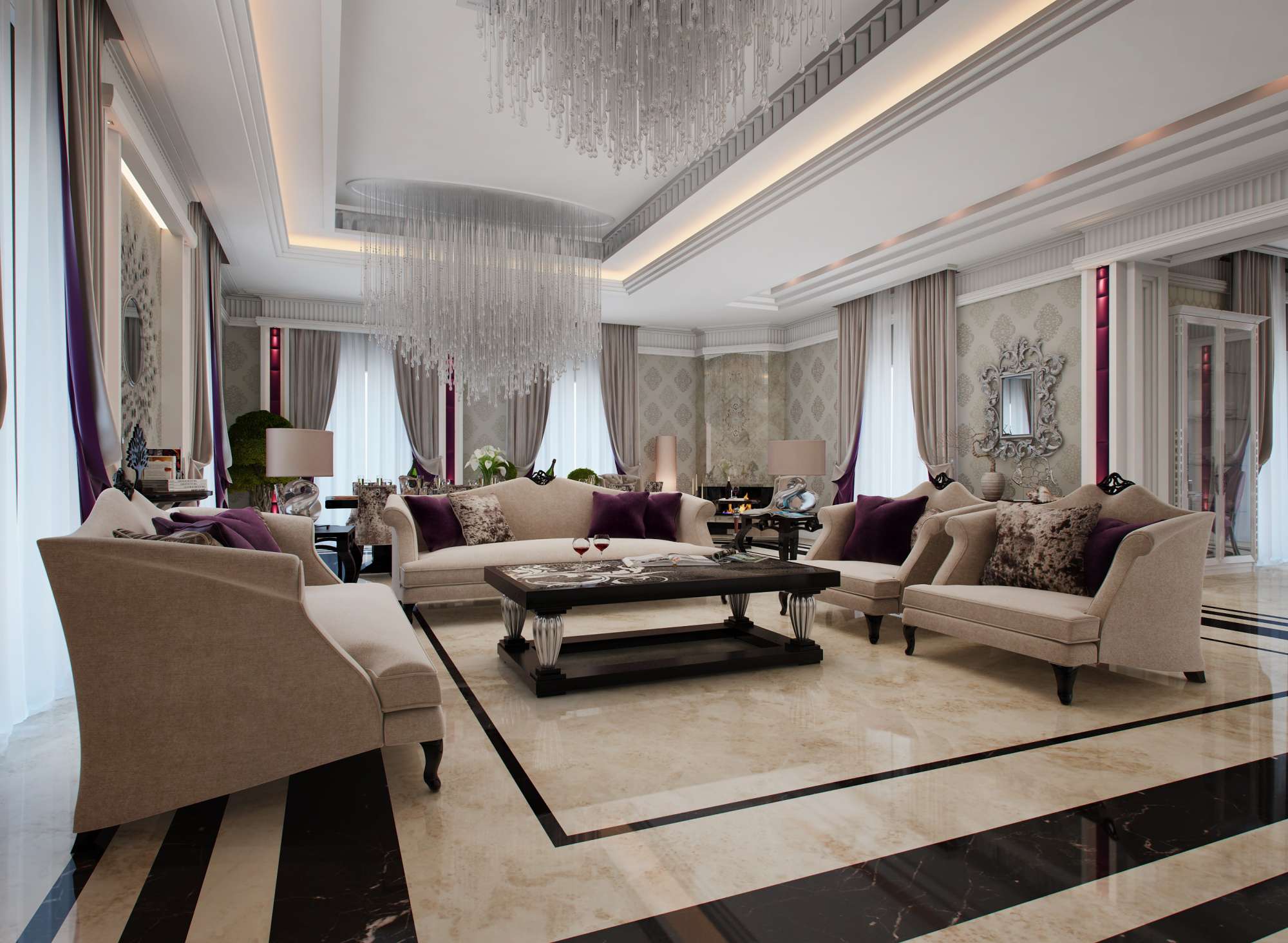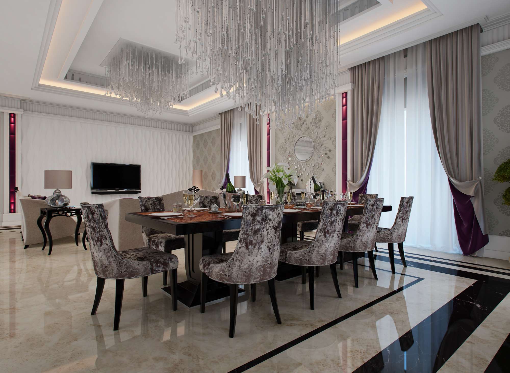 Бежевая диванная группа в зоне отдыха компонуется вокруг массивного журнального столика с инкрустацией. Стена с телевизором выделена нарядной белой отделкой с волнистым рельефом. Спокойный интерьер гостиной создают теплые серые оттенки классических обоев, белый потолок с переходящими на стены лепными фризами, мягкая мебель со светло-бежевой обивкой, окрашенные в серебро резные рамы зеркал. Глянцевое напольное покрытие под мрамор с контрастным темно-коричневым орнаментом стилистически связывает место отдыха со столовой зоной.